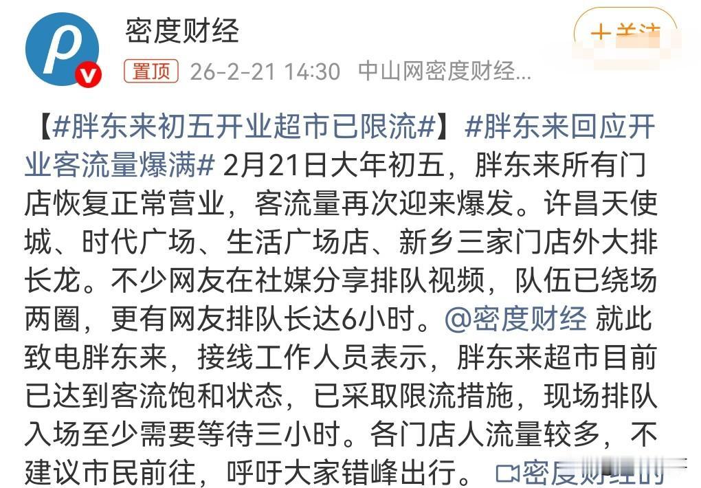 你敢想吗?你敢信吗?一个超市竟然比景区的人还多,你就说离不离谱吧! 能够有这种光辉景象的,也只有胖东来这种超市吧。 有的排队几小时,这真的是太夸张了。 2月21日热搜,胖东来初五开业超市已限流。 那肯定要限流,不限流的话,那真的是太疯狂了,容易引发风险。 人从众是非常可怕的。 这口碑也真的是无敌了,那么多游客前去体验。