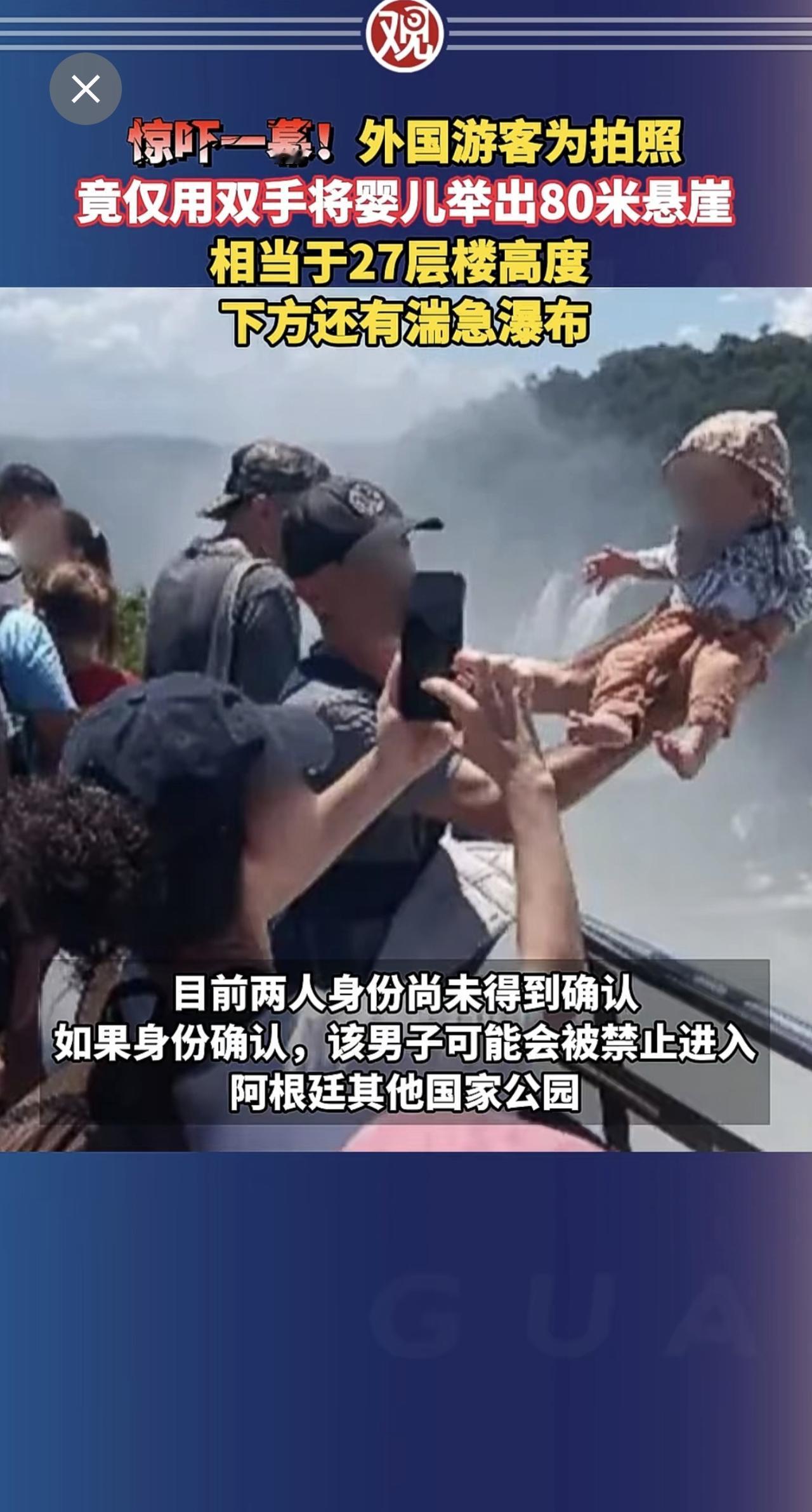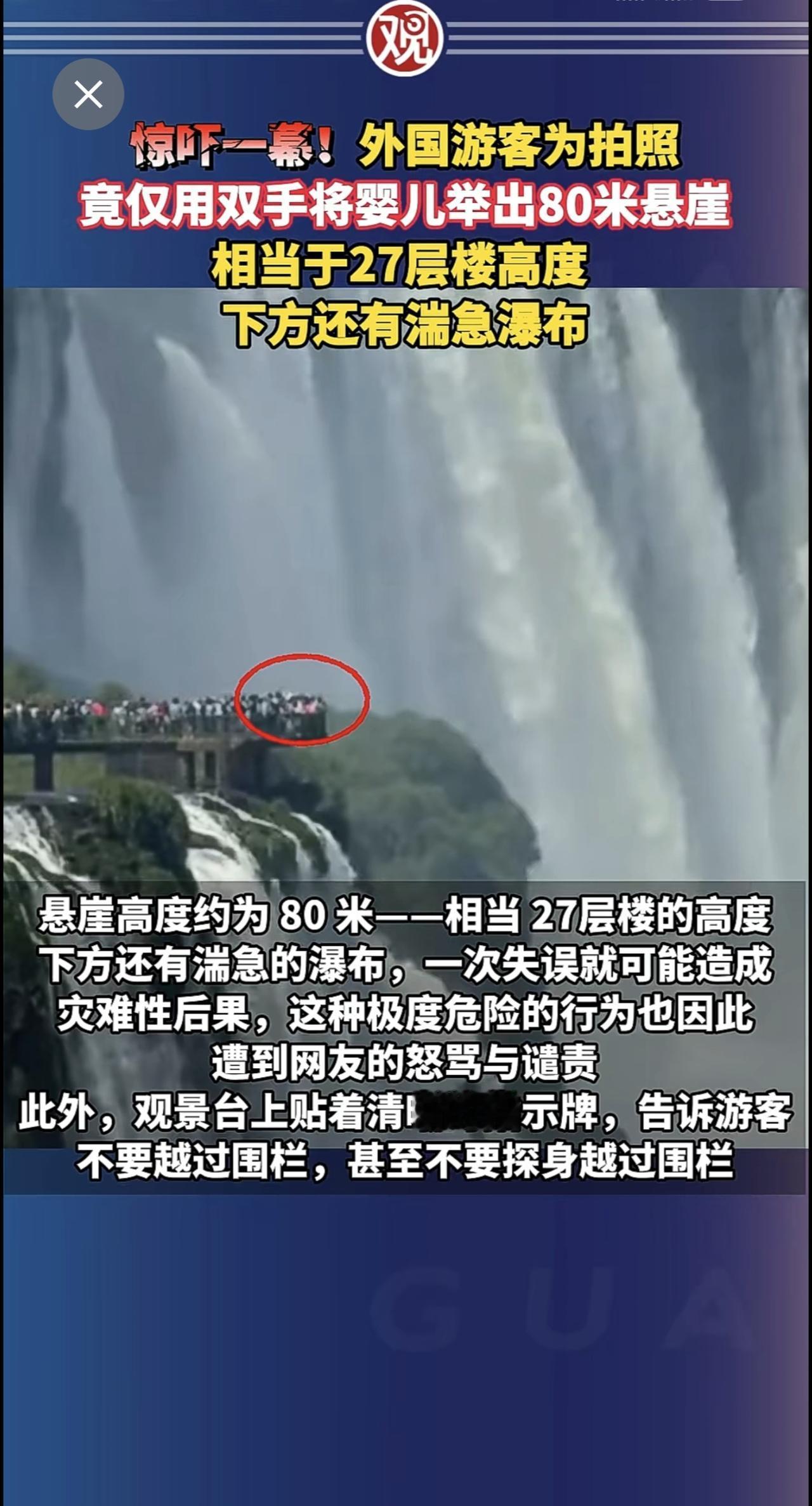 惊吓一幕!外国游客为拍照,竟仅用双手将婴儿举出80米悬崖,相当于27层楼高度 ,下方还有湍急瀑布[石化]