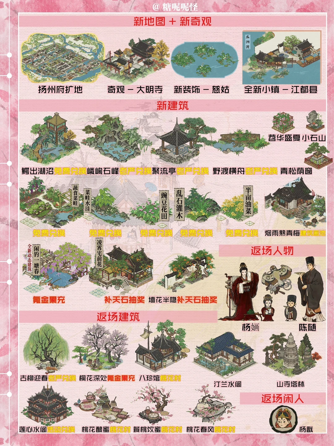 明天开始,江南百景图版本更新啦 1️⃣新地图:扬州府扩建|江都县地图更新,大明寺奇观、江都瓜洲渡 2️⃣新建筑:鳄出湖沼|嶙峋石峰|聚流亭|野渡横舟|蔬食菜畦|菜畦水洼|豌豆花田|乱石灌木|半亩油菜|苕华盛夏|小山石|青松荫窗|烟雨熟青梅|闲钓一塘春|凌霄宅前花|墙花半隐 3️⃣返场建筑:古柳迎春|桐花深处|莲心水阁等 4️⃣返场人物:杨嫿|陈随