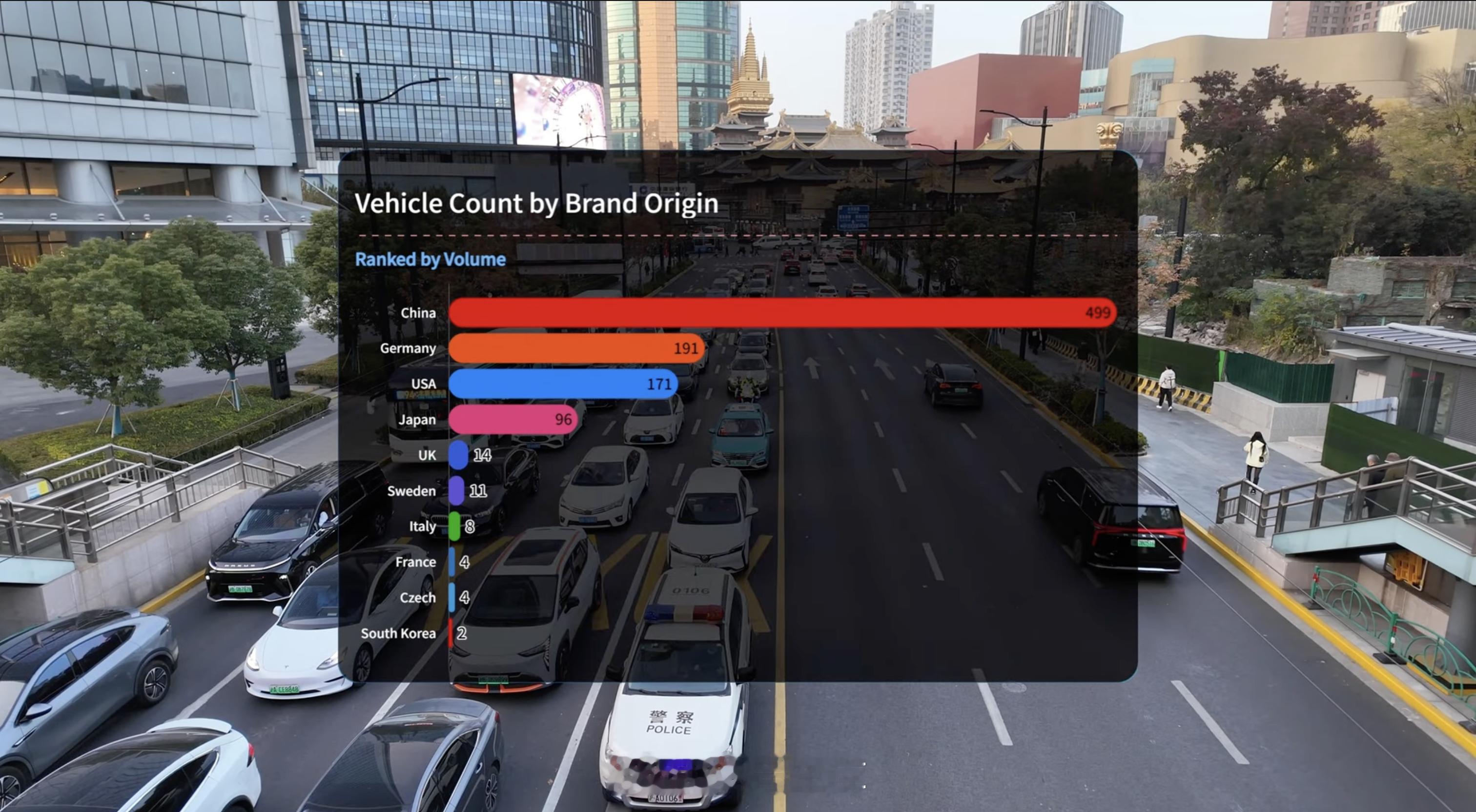 1. 中国品牌有 499 辆,其次德国 191 辆,美国 171 辆,日本 96 辆,其他国家真的就是「其他」了,没太多存在感。