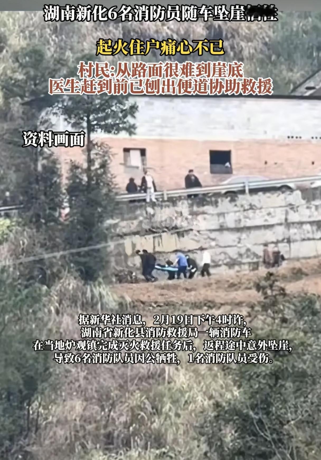 湖南新化消防员坠崖后,起火住户痛心不已,村民说,消防车坠崖后,他们去到崖底时, 发现还有消防员活着,但腰部以下没有知觉了。 当日起火的是山中一所木结构民房,距离坠崖地约2公里远,消防车是返程时,即将走完盘山路,进入山下公路时坠崖的。 事发后,当地村民纷纷赶来,因为从路面很难到崖底,村民在医生赶来前开辟了一条临时小路通到崖底,方便救援。 村民说看面相就知道都是20多岁的小伙子,看到消防员遇难,现场的村民都哭了,大家都很难过! 起火住户说他当时也参与了救援,看到消防员受伤、牺牲,他感到非常的惋惜和痛心! 2月21日,六名牺牲消防员的追思会在新化县殡仪馆举行。 其中一名消防员的朋友说:“一起玩了八年,过年前还在一起玩,初三上午归的队,下午就出事了。” 谁也想不到,刚刚拼尽全力守护了百姓安全的消防员,在凯旋回家的路上,却遭遇了无法挽回的悲剧。 意外来得太突然,让大家措手不及,他们又是谁的老公?谁的儿子?他们的家人要如何面对?多希望这是一场梦!