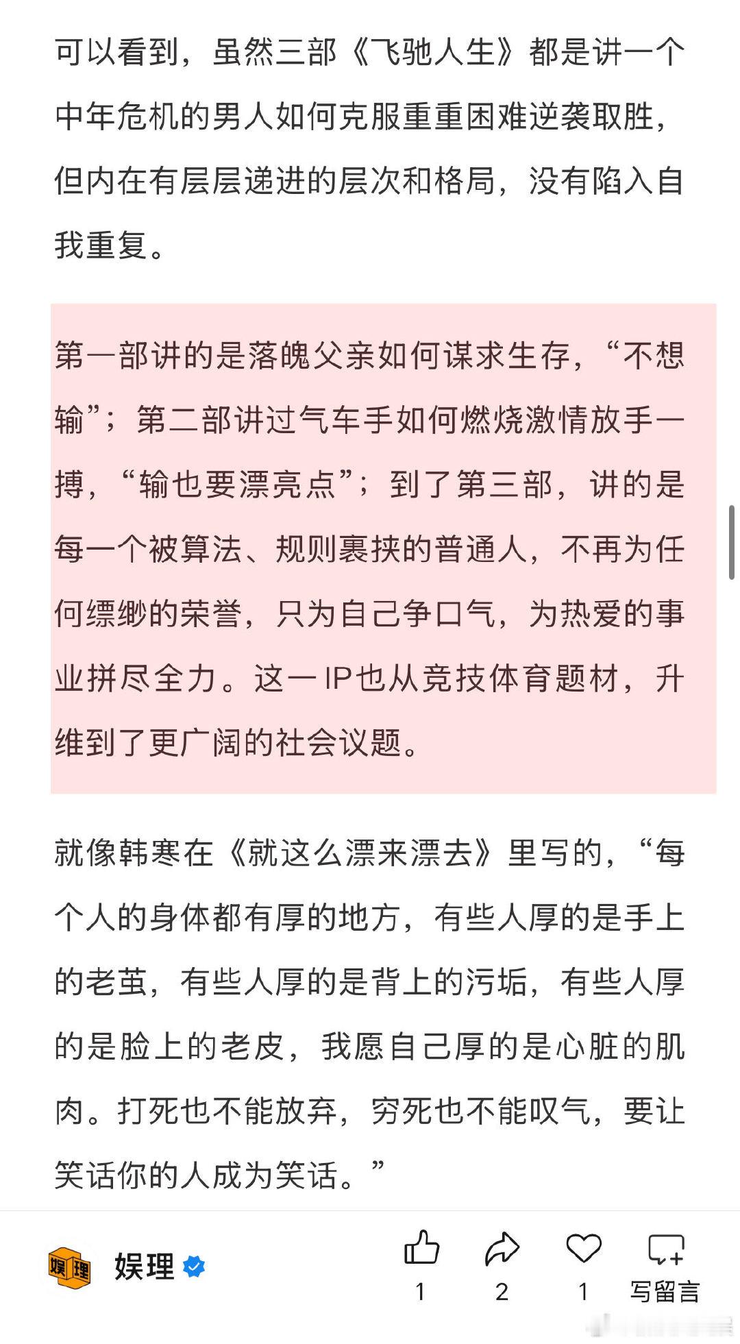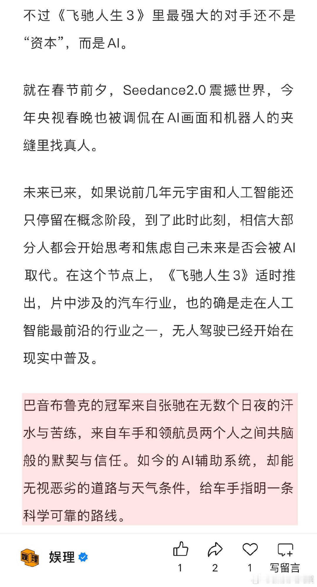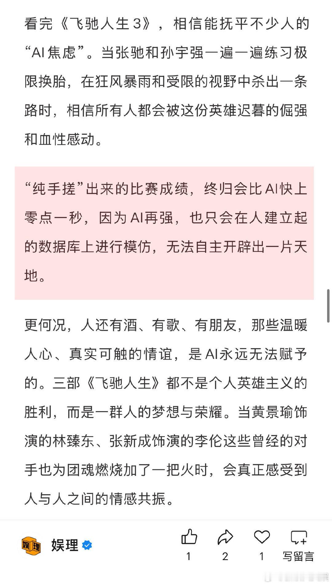 飞驰人生3手搓手艺人 飞驰人生3沈腾的对手是AI 相信《飞驰人生3》能抚平不少人的“AI焦虑”。“纯手搓”出来的比赛成绩,终归会比AI快上零点一秒,因为AI再强,也只会在人建立起的数据库上进行模仿,无法自主开辟出一片天地。更何况,人还有酒、有歌、有朋友,那些温暖人心、真实可触的情谊,是AI永远无法赋予的。娱理独家↓