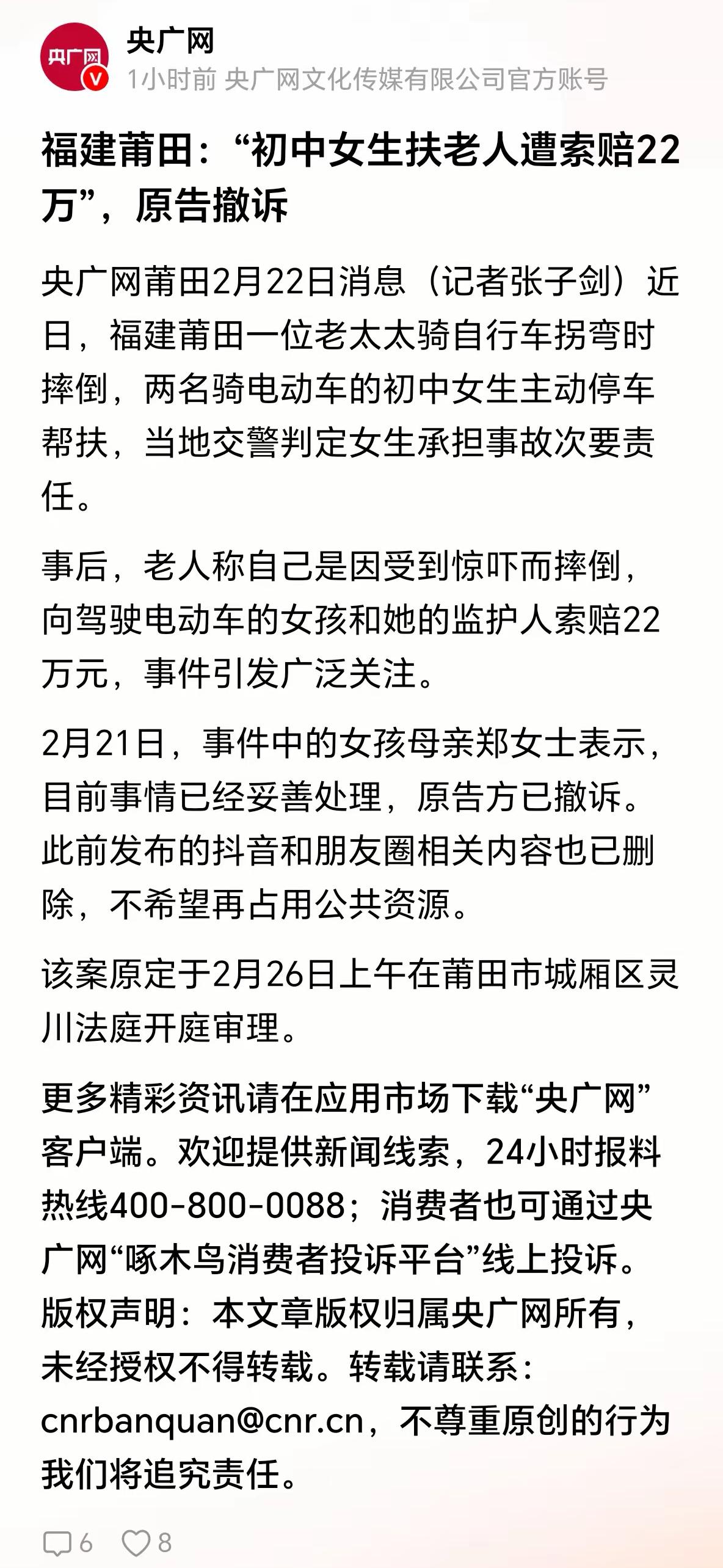不管责任如何判定,老太太应该向两名女孩表示感谢! 福建莆田老太太骑自行车摔倒受伤,旁边两名骑电动自行车经过的女孩扶她起来,被交警判“非接触事故”,老太太向两名女孩监护人索赔22万!事故视频发到网上后掀起轩然大波,引起巨大争议。 最新消息是老太太一方已经撤诉。 我认为争议的焦点应该是交警对责任的判定和划分,不是女孩好心扶人被讹诈。 广大网友从自身经验和事故视频看,两名女孩没有任何过错,老太太摔倒完全是自身原因。 交警责任划分有和稀泥的成分,加上索赔高达22万元,才引起巨大争议。 当然,如果两女孩当时不扶老太太,就离开,如果交警判定有责任,仍然要被找回来索赔。 所以,被索赔与是否扶老太太没有因果关系,舆论讨论焦点不能放在老太太“忘恩负义”上,还是要放在交警对责任的判定上。 撤诉后,双方应该会协商解决。 不管怎样,一码归一码,老太太及家人应该对女孩扶老太太的好事表示感谢。
