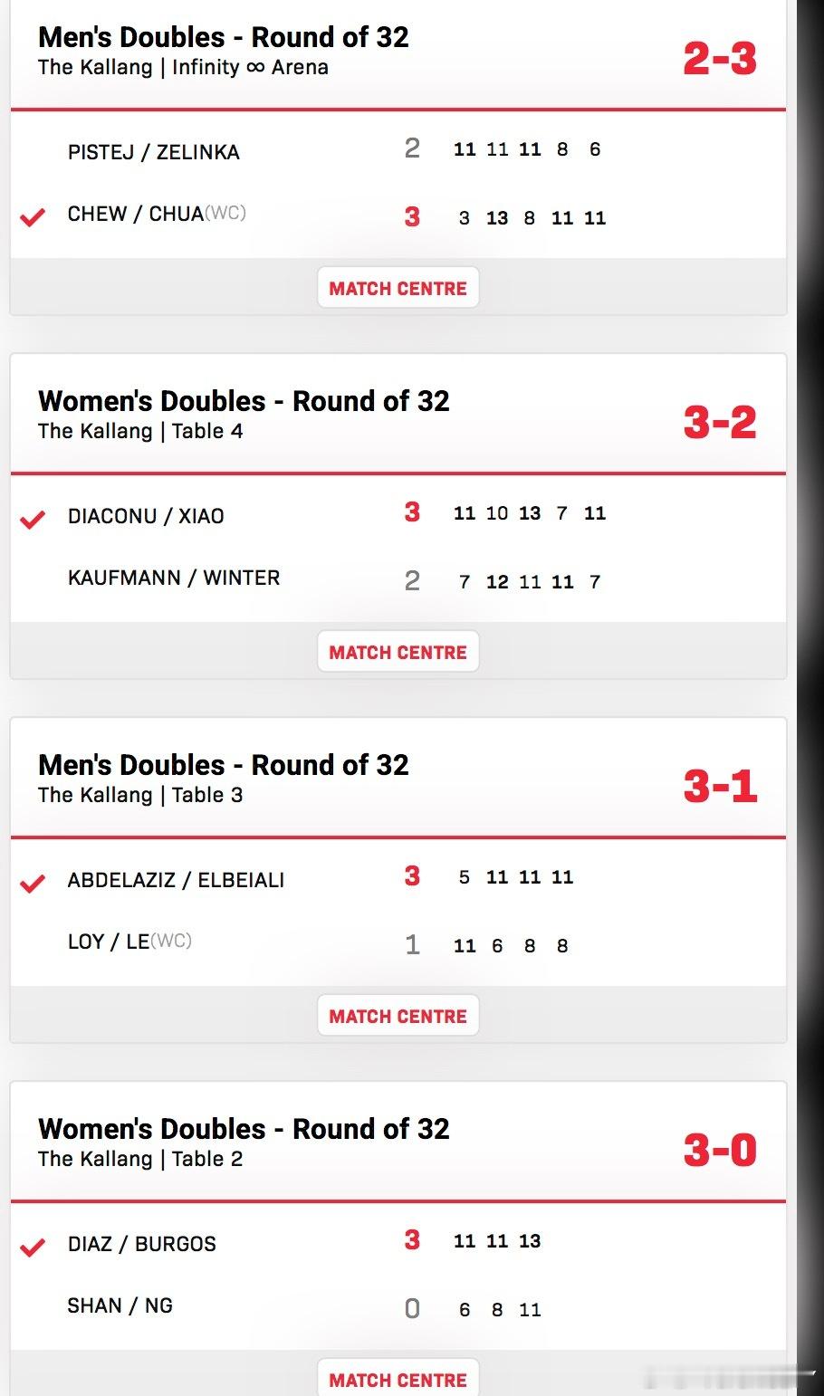 2026新加坡大满贯男女子双打32-16周哲宇/蔡劭恒3-2皮斯特耶/泽林卡迪亚兹/布尔戈斯3-0单晓娜/吴咏琳尤瑟夫/艾尔贝阿里3-1黎行耀/黎定龙迪亚科努/肖瑶茜3-2考夫曼/温特