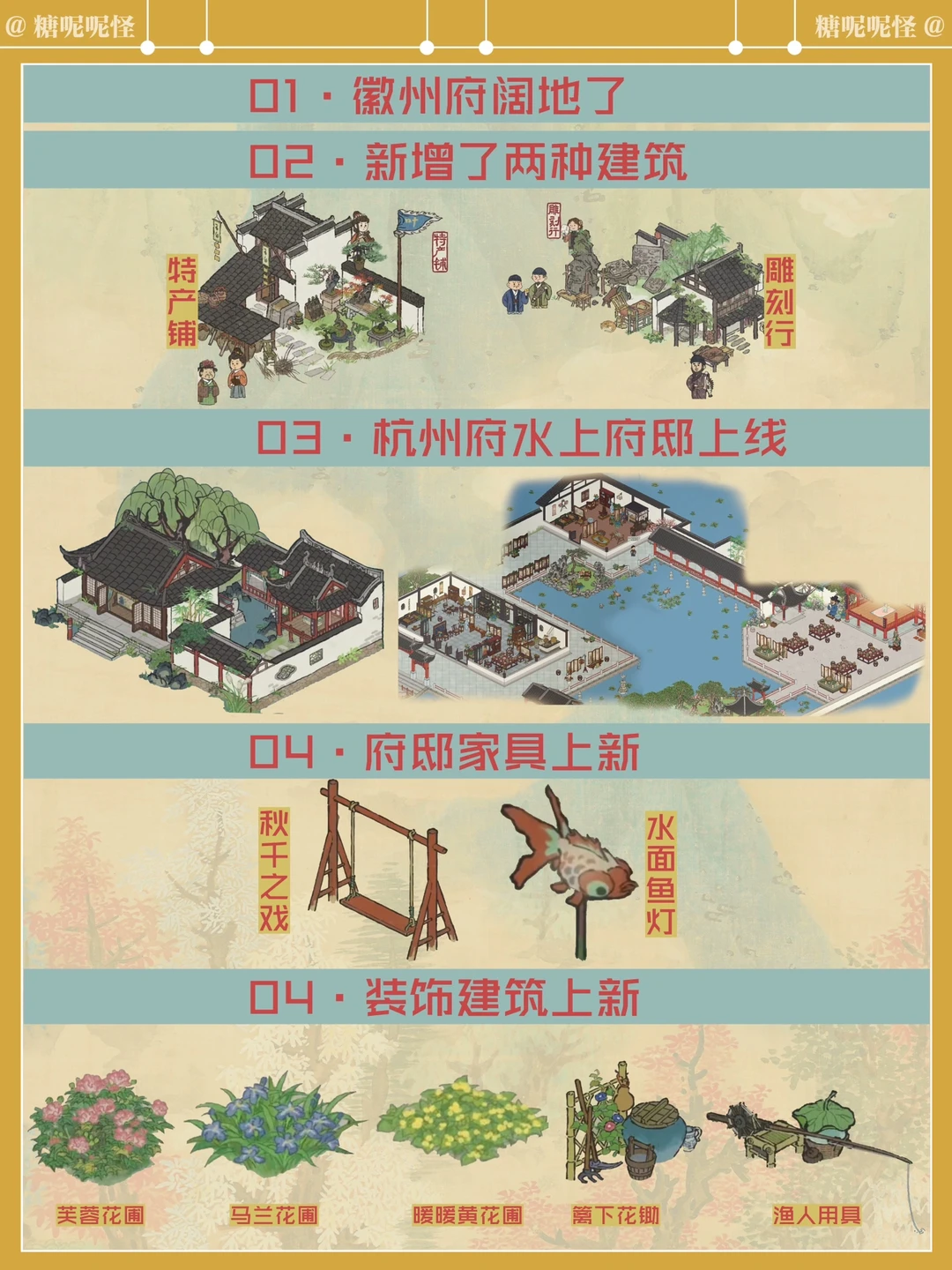 有一说一,更新真的比预期少[哭惹R][哭惹R][哭惹R] 娱乐建筑没有更新(不知道是不是工期太赶了) 但是徽州府终于阔地了!!! 杭州府府邸是最期待的(可以听戏) 装饰建筑也好看,值的期待[色色R][色色R]