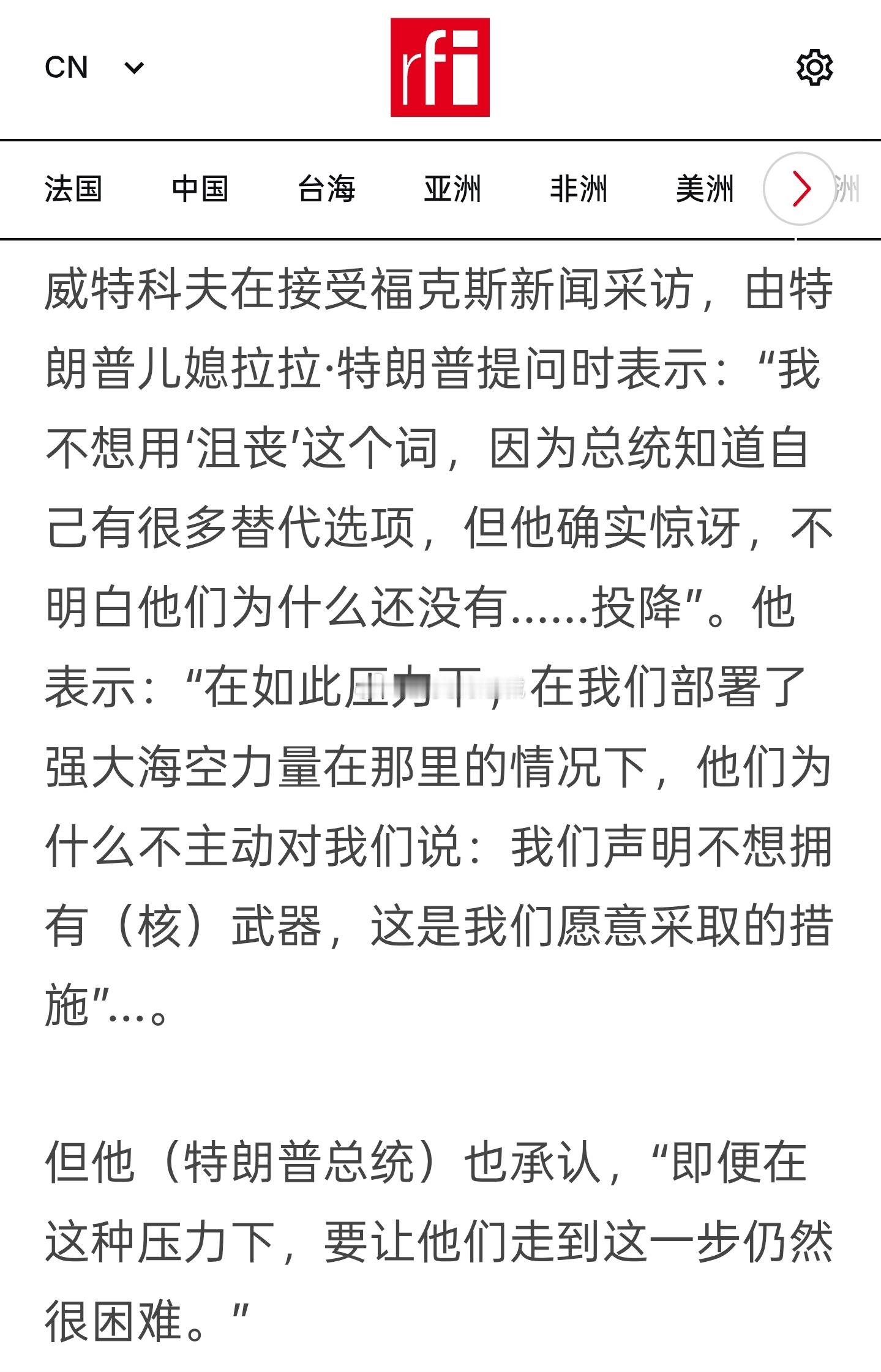 威特科夫在表示:“在如此压力下,在我们部署了强大海空力量在那里的情况下,他们为什么不主动对我们说:我们声明不想拥有(核)武器,这是我们愿意采取的措施”...。但他(特朗普总统)也承认,“即便在这种压力下,要让他们走到这一步仍然很困难”。海外新鲜事