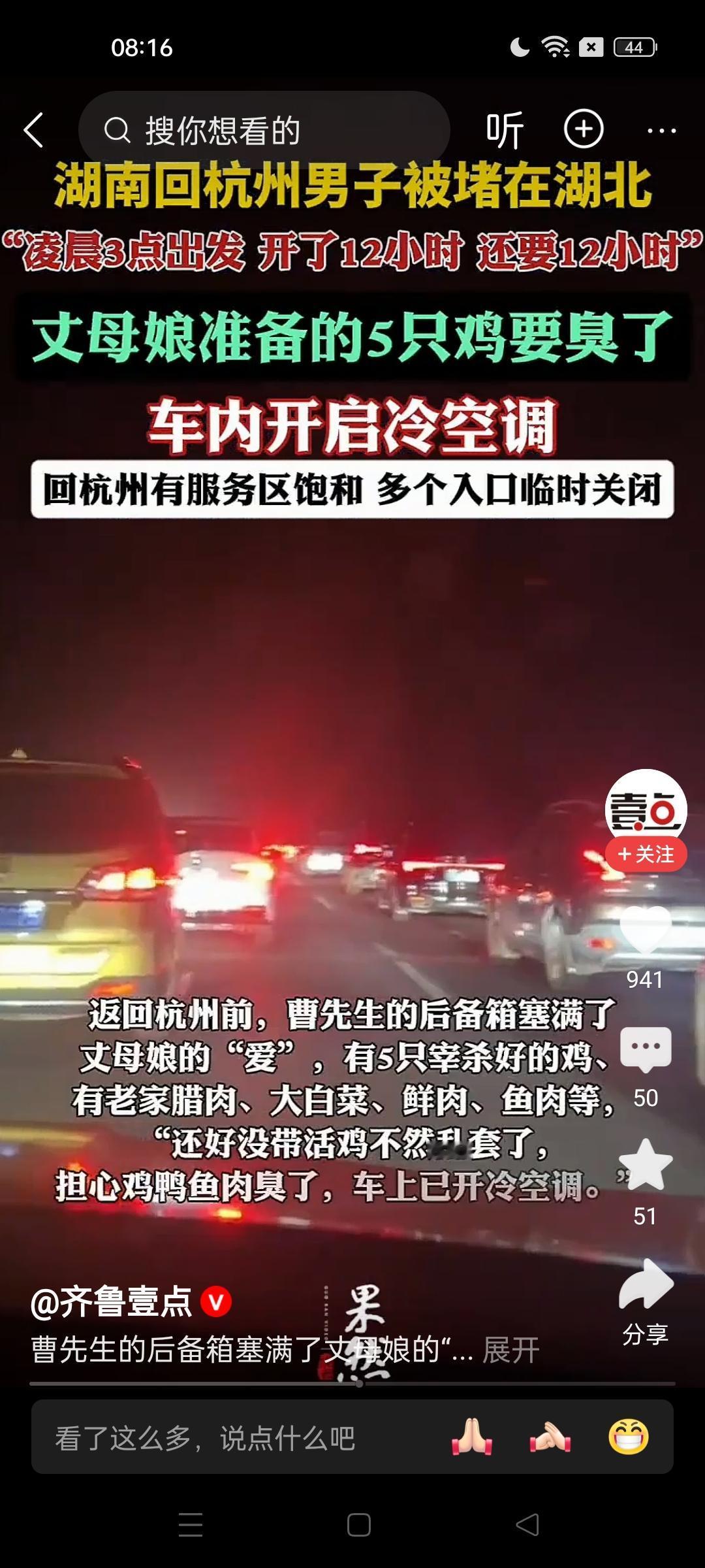 岳母大人,对不住啊!肉要臭了! 正月初六,一湖南男子要返回杭州,丈母娘把他的后备箱塞满了:五只土鸡,腊味鲜鱼猪肉蔬菜,满满当当,应有尽有! 两地的车程本来是12小时,该男子为了路上通畅,早上3点半就起来了,没想到到高速路一看,车子已经很多了,原来都是他这种大聪明! 然后就是拥堵拥堵再拥堵,龟速爬行,100公里地要走上五个小时!堵车让人很焦躁,更让人着急的是,老岳母给他装了那么多生鲜食材,车里的温度持续上升,眼看着就要捂臭了!没办法,他只好打开了冷气。在这个冬季的路上,全程开着冷气前进! 每年的返程大堵车,每年重复上演!父母给装的后备箱,每年都是那么满当!啥时候能做到不负亲情不再堵啊[笑哭][笑哭][笑哭]