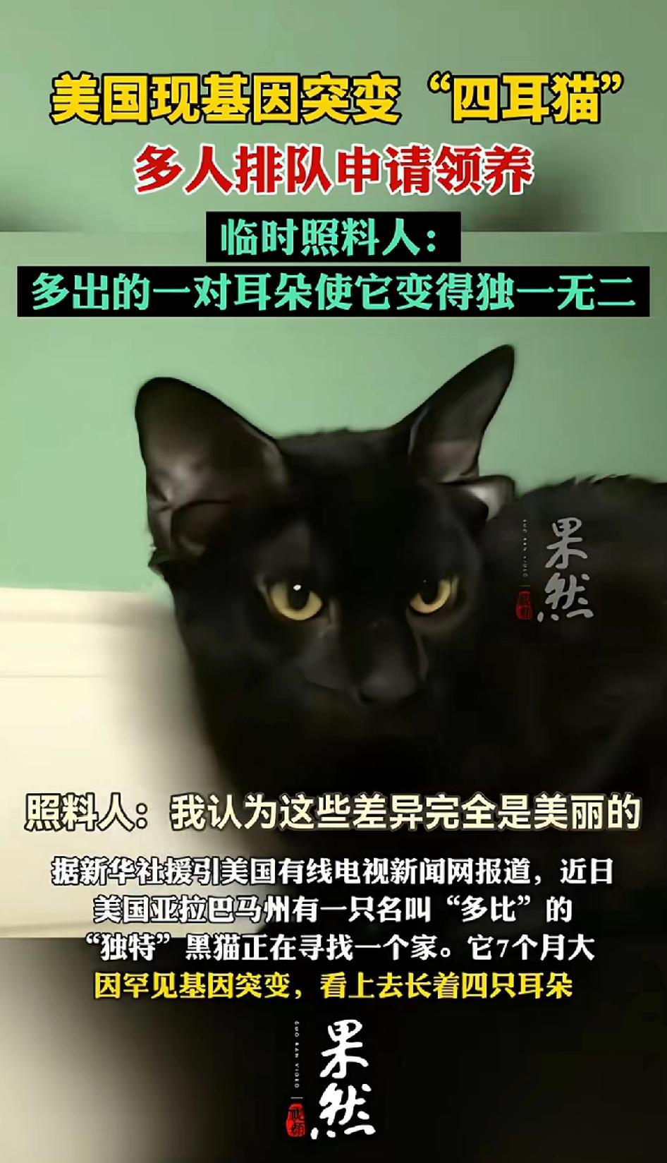美国亚拉巴马现基因突变“四耳猫”多人排队申请领养。这只名叫“多比”的四耳猫是一只7个月大的黑猫,现在正在帮它找主人。 临时照料人称:多出的一对耳朵使它变得独一无二。这只四耳猫一跃成了网红猫,都想看看这个罕见的猫咪!尤其是现在网络发达,四耳猫还没碰到主人都已经成网红了,试问谁不想拥有这样一只自带流量的网红猫。 其实,像这样的“四耳猫”案例并不多见。宾夕法尼亚州动物收容所曾接收一只叫“蝙蝠侠”的3岁四耳黑猫,兽医说不影响听力,是父母隐性基因在它身上成了显性。 这些四耳猫除耳朵外,和正常猫没啥两样,领养家庭还觉得它们与众不同。看来大家都爱独特的宠物呀!