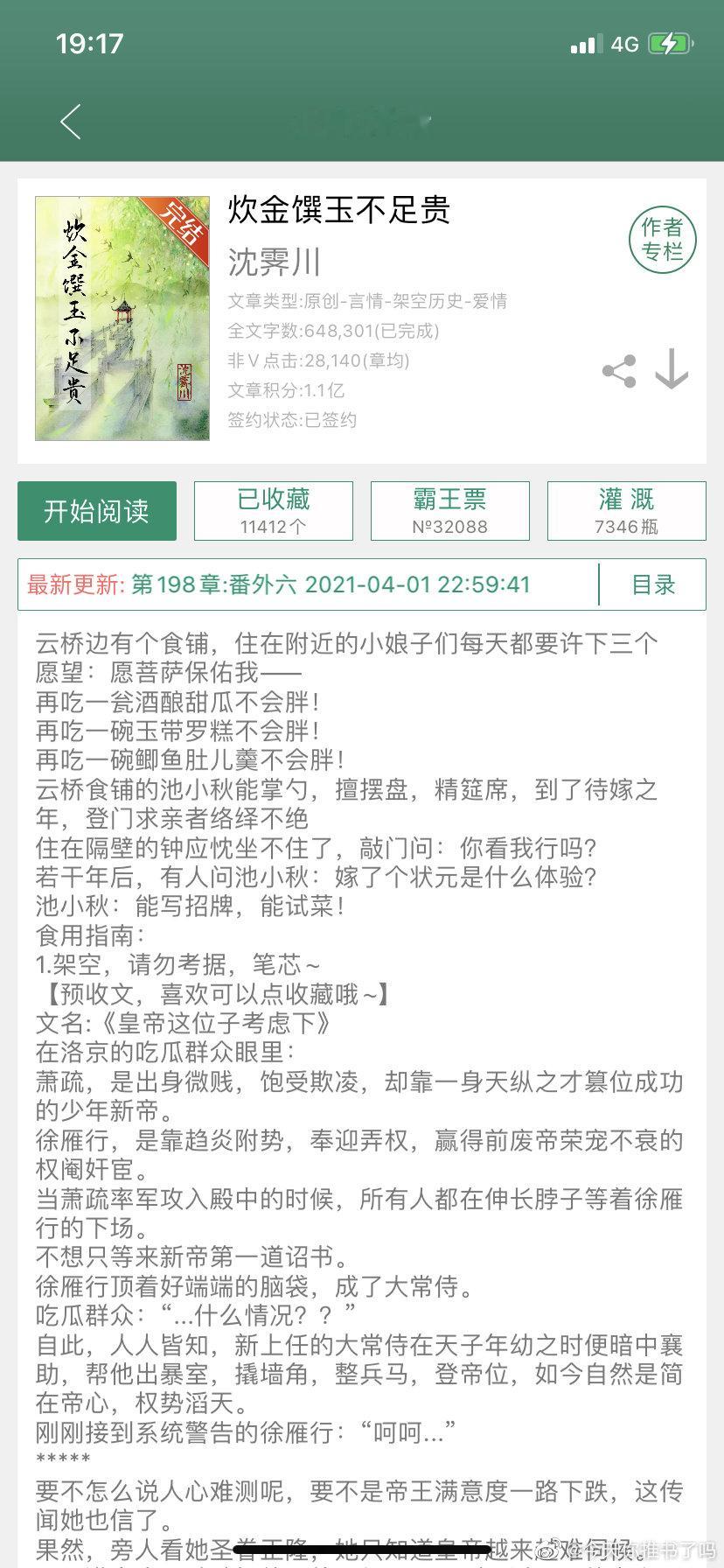 有一段时间特别喜欢美食种田文疯狂搜刮,后来读到这篇时真很的惊喜了!其中的几个元素满满地戳中我的点:1⃣️女主从一开始一无所有的流民一步步成长为名镇一番的大厨。我超级喜欢看女主最开始身无分文然后依靠自己的手艺和才智挣钱升级店面的桥段,这才是种田类经营文的精髓好吗😠2⃣️男主走科举路,女主走美食经营路,两人从十多岁饥荒流浪时就认识互相扶持一起挣钱一起一步步把生活变好😭这就是我爱的种田文!文中好多做饭的环节看得我口水直流斯哈斯哈3⃣️男女主感情线非常自然流畅,从逃荒时的相依为命到后来点点滴滴间的真情流露,彼此都坚定对方是自己的唯一!全程无纠葛无误会!这本书最佩服的是作者笔下的男女主真的活灵活现🥳完全不是批发的完美纸片人!女主纯真机灵又善良可爱,特点是力气大厨艺好大力女鹅,能够一打十(夸张化😏)好多次都觉得女鹅真是太可爱纯真了怪不得男主这么爱她爱她爱她!重点可以说说的是男主,腹黑心思深沉阴郁型男主,作者文笔相当好将这种性格刻画得非常生动。男主的心思深沉又纠葛心机体现在字里行间,不是词藻堆砌的人设而是非常真实的一个男主形象,这算是近些年来我看的文里写得相当出彩人物性格完整不矛盾又有内涵的男主形象了。4⃣️文里有很多地方其实我看的非常感动🥲特别是男主意识到自己喜欢上女主后自己内心的剖白。大部分言情小说基本都是女主视角展开的,男主视角在文中相对较少来保持其角色的神秘感和形象。而在这篇文的前期男主视角是比较多的,内心与自己过去的博弈着墨很多,这也是我比较佩服作者的一点,在众多着墨下依然控制着男主的人设没崩。男主在文中将代表着自己真实身份的最后一件物器在银水中融了后打成手链送给女主,象征对过去矜贵又悲哀身份的最终释怀和想与女主迎来新生的美好愿望喜欢种田文的拜托都去看