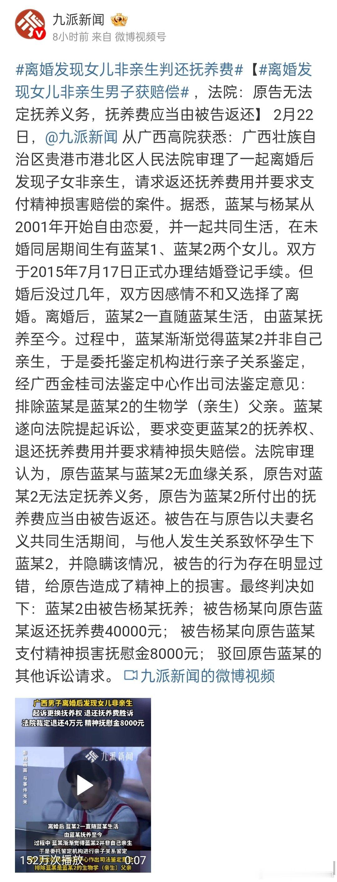 男方发现女儿非亲生案,女方还4万抚养费。这个数字已经低到无法想象了。离婚案的抚养费500/月起步,平均1000/月。一年就有1.2万抚养费。离婚发现女儿非亲生判还抚养费