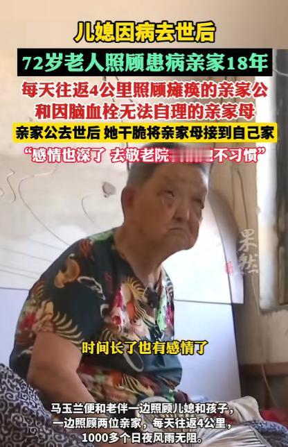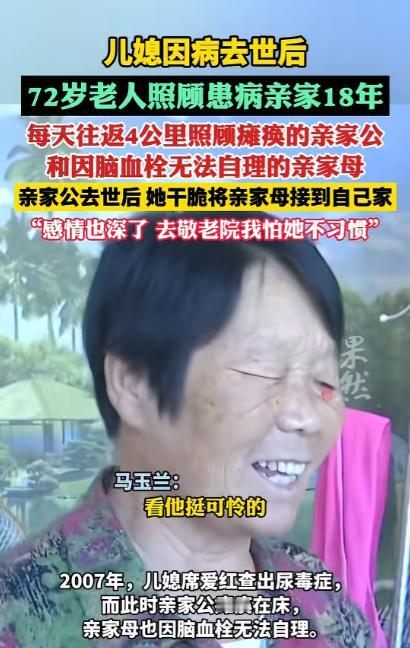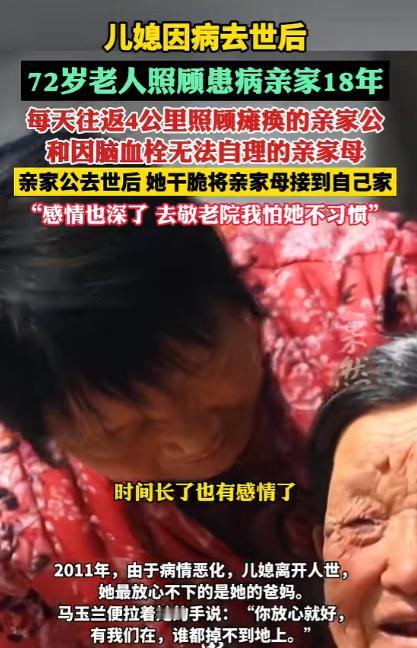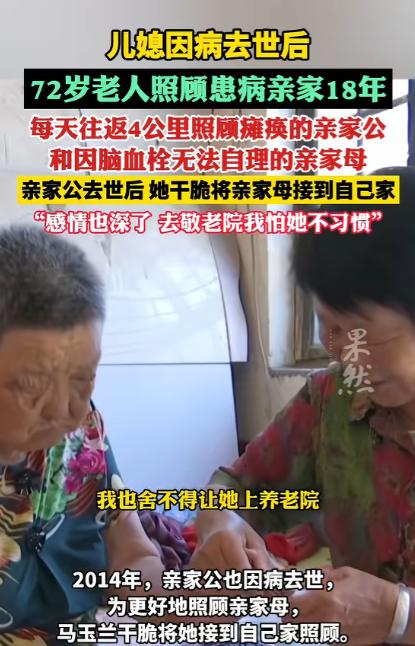 “这样的亲家母全国罕见!”山东德州,儿媳因病去世后,69岁的婆婆独自照顾患病的亲家15年,每天往返4公里,悉心照料瘫痪的亲家公和身患脑血栓、生活无法自理的亲家母。亲家公去世后,婆婆干脆把亲家母接到自己家照顾,网友:有这种亲家真是上辈子烧高香了! 在山东德州齐河县焦庙镇的乡村里,一段藏在烟火日常中的故事,悄悄打动了无数人。 72 岁的马玉兰,一位再普通不过的农村老人,用十八个春夏秋冬的坚守,把一份没有血缘牵绊的牵挂,酿成了最温润的人间温暖。 多年前,马玉兰的儿媳席爱红被尿毒症缠身,年轻的生命在病痛中一点点黯淡。躺在病床上的儿媳,最放心不下的不是自己的病情,而是家中年迈的父母。 亲家公常年瘫痪在床,四肢无法活动,吃喝拉撒全要依靠旁人照料,连翻身坐起都做不到,看着儿媳满眼的担忧与牵挂,看着两位老人无依无靠的模样,马玉兰心里满是酸楚。 她紧紧握着儿媳冰凉的手,轻轻许下一句承诺,会替她好好照看好两位老人,让她不必牵挂。就是这句没有华丽辞藻的承诺,成了马玉兰往后十八年里,风雨无阻、从未动摇的坚守。 儿媳离世后,马玉兰没有丝毫迟疑,立刻扛起了照料亲家的重担。从她家到亲家的住处,来回足足有四公里的路程,她就靠着一双脚,一步步走完这段奔波的路。 春夏秋冬,寒来暑往,这条四公里的路,她一走就是十几年,照料两位失能老人,从来都不是一件轻松的事,其中的辛苦与繁琐,只有亲身经历的人才能体会。 后来,与病魔抗争多年的亲家公离世,只剩下亲家母一个人守着空房子,老人没了陪伴,整日闷闷不乐,身体也越来越差。 马玉兰看在眼里,疼在心里,当即决定把亲家母接到自己家里一起生活。身边不少乡亲都劝她,你自己也年纪大了,没必要把所有担子都扛在身上,把老人送去敬老院,也算尽到心意了。 可马玉兰只是摇了摇头,她坦言,这么多年朝夕相处,自己和这位无血缘的老人早就处出了真感情,早就把对方当成了亲姊妹,“敬老院里环境陌生,老人一辈子住惯了乡下,去了肯定不习惯,我自己照顾着,心里才踏实”。 把亲家母接到家里后,马玉兰的生活重心,几乎全都放在了这位姊妹身上,两个老人住在同一个屋檐下,日子过得平淡又温馨。 在马玉兰日复一日的悉心照料下,亲家母的精神状态越来越好,脸上渐渐有了久违的笑容,不再整日郁郁寡欢,也把马玉兰当成了最亲近、最依赖的人。 两人朝夕相伴、相互扶持,没有血缘牵绊,却胜似亲生姊妹,粗茶淡饭的日子里,满是平淡又真切的温暖。 马玉兰从不觉得自己的付出有多伟大,也从不把辛苦挂在嘴边,她只是觉得,自己答应过离世的儿媳,要好好照料两位老人,如今儿媳走了,亲家公也走了,自己就是亲家母最亲的人,无论如何都不能丢下她。 从五十多岁的中年,到七十二岁的古稀之年,十八年的时光,悄悄带走了岁月的芳华,在马玉兰的脸上刻下了深深的皱纹,让她的青丝渐渐染上白霜,让她曾经轻快的脚步变得有些迟缓。 可岁月改变了她的模样,却从未改变她的初心,十八年来,她照料老人的心意,始终如初,从未有过一丝一毫的懈怠。 马玉兰用十八年的坚守,把一句随口许下的承诺,落到了日复一日的行动里,这份跨越血缘、超越世俗的坚守与善良,像一缕暖阳,照进了每个人的心里,也让我们真切懂得,人间最珍贵的,从来都是发自内心的真诚,与不离不弃的坚守。 对于这件事,您有什么想说的吗?欢迎评论区留言讨论。 信源:齐鲁晚报·果然视频2025-05-20——《山东72岁老人替去世儿媳照顾患病亲家18年》