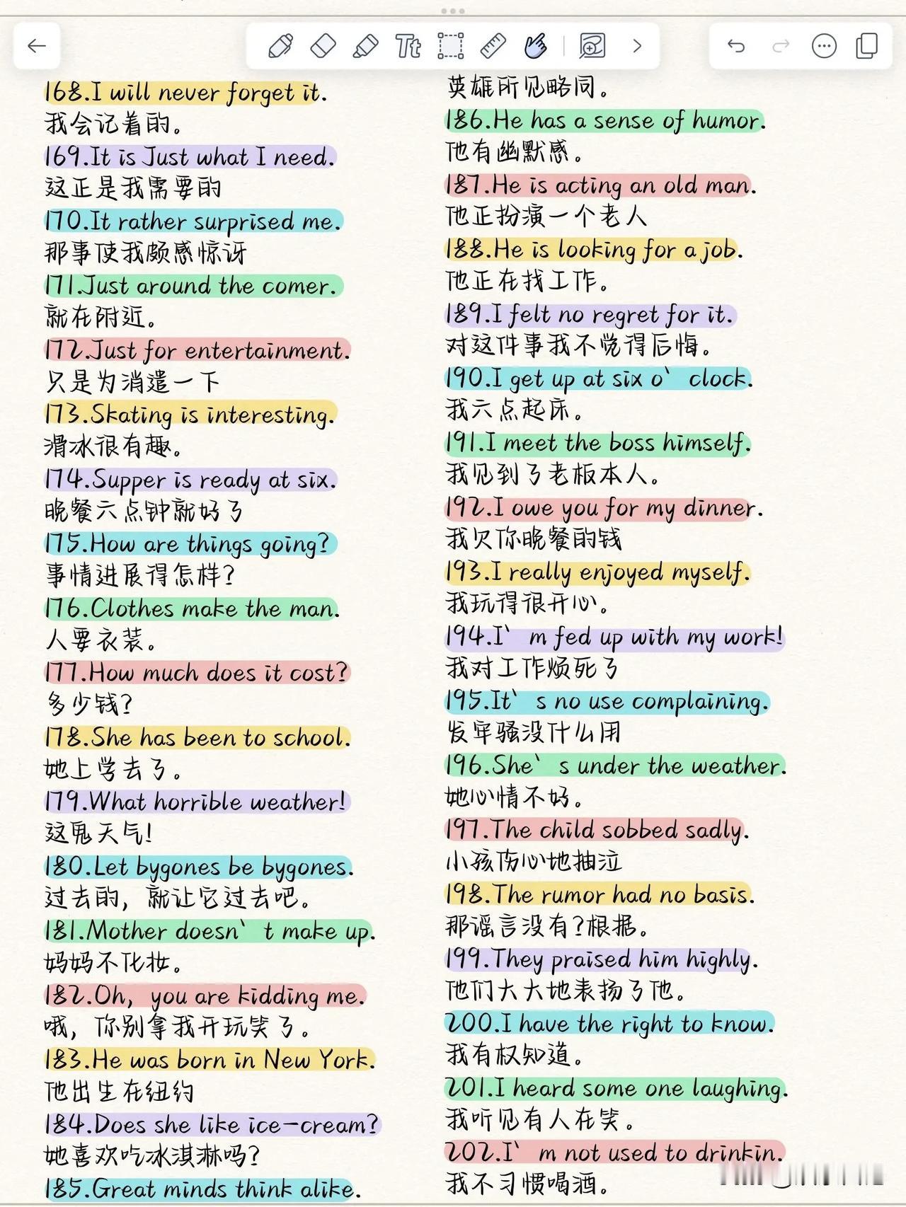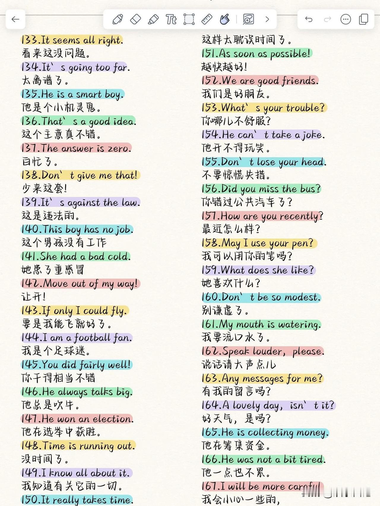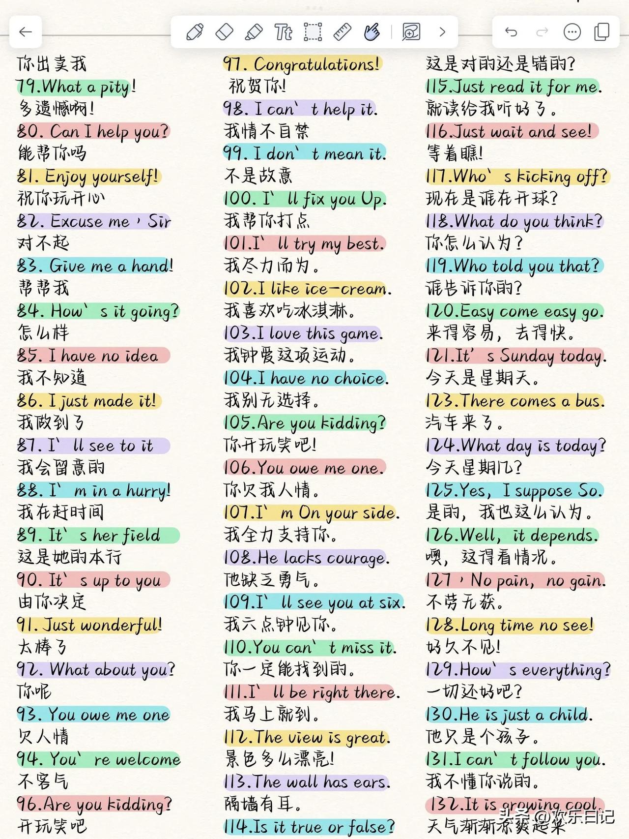 哇塞,这个日常用语句式也太好用了吧!! 前段时间带孩子去杭州旅游,碰到了几个外国友人,孩子们就很激动,但是不敢说话,半天也没敢靠近。只是指了指他们,让我看。意思是她们看到外国人了!我示意她们可以打个招呼,她们硬着头皮说了句:Hello! 然后人家真的回应她们Hello了!还微笑着挥了挥手。可把她们激动坏了。回来之后孩子们就跟我说要好好练习口语。 如果当时背会了这个日常用语,她们是不是会更自信的去聊一聊呢[可爱]分享学英语秘诀