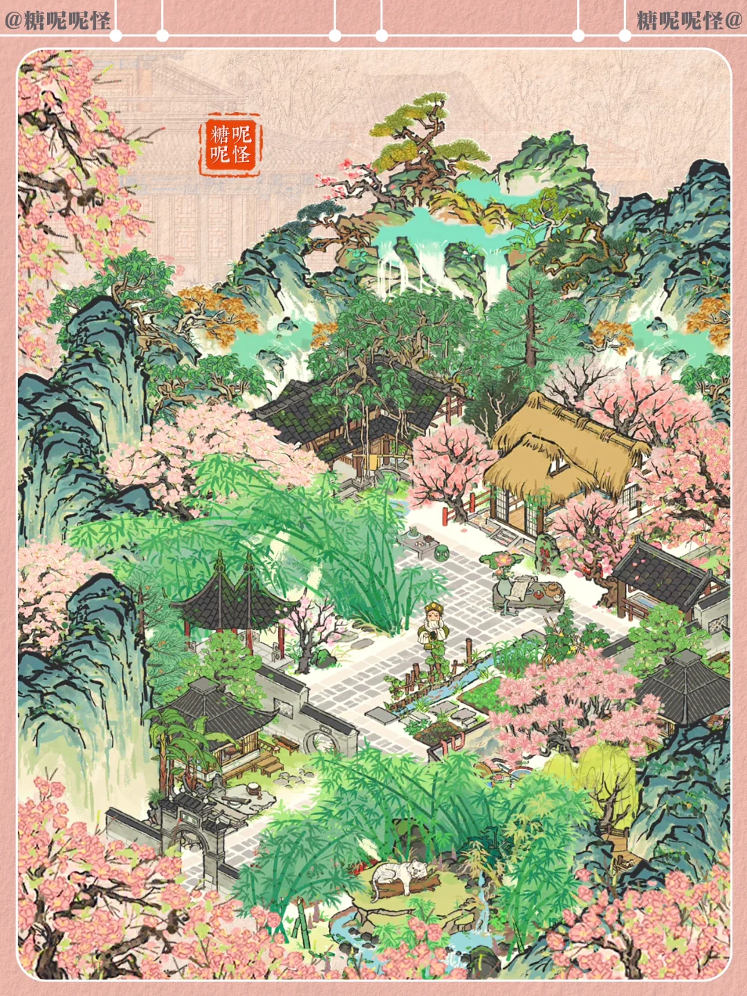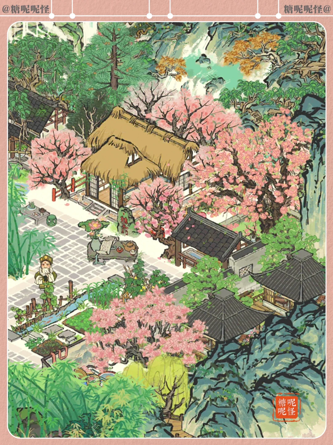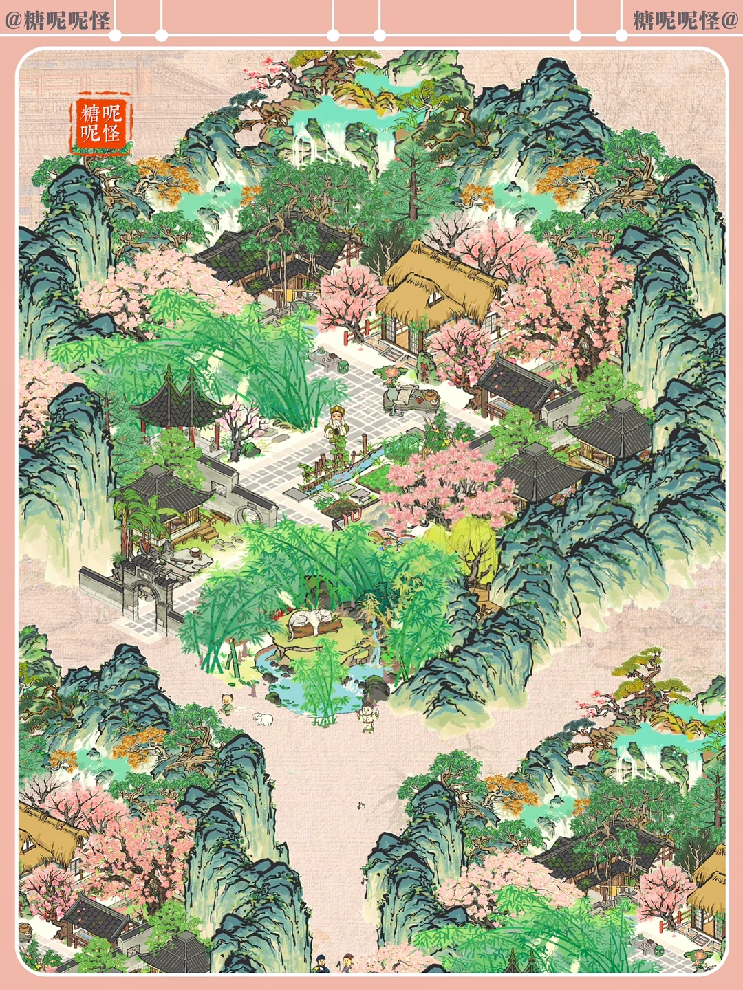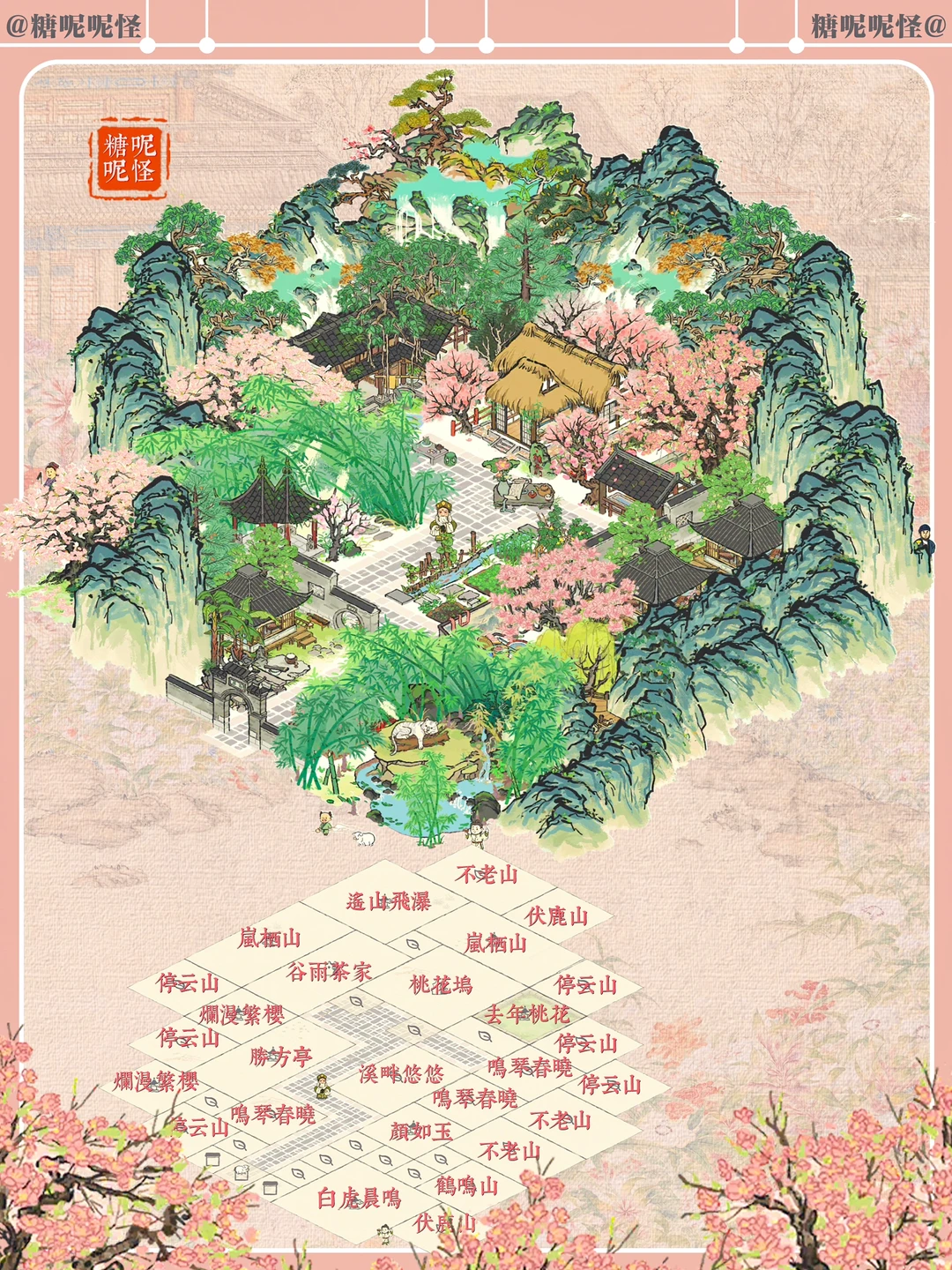 隐居桃源…… 主体建筑:【岚栖山】【伏鹿山】【不老山】【鹤鸣山】【桃花坞】【胜方亭】【白虎晨鸣】