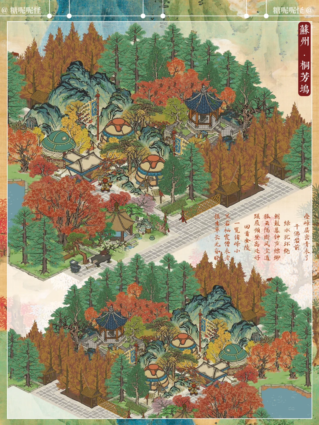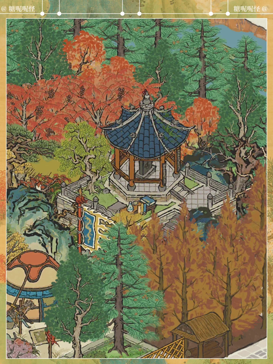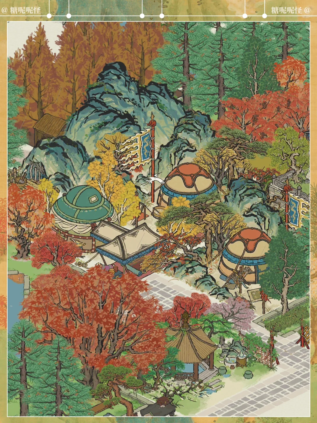 [一R]主体建筑: 🍁【叶落秋帐】-严大人秋限建筑(免费) ⛺️【郊外营地】-雅集商行兑换(2000玉牌) 🏔️【登高画碑】-娱乐建筑(800补天石) [二R]次要建筑: 🌿【绿蚁新酒】-娱乐建筑免费建 🏞️【不老山】-空谷画池获取 🍂【知秋落枫】-严大人秋季限定建筑(免费) 🪴【画图桌】-严大人免费兑换 [三R]生产建筑: ⛏️【铁矿厂】-生产建筑免费获取 🌲【漆树林】-生产建筑免费建设 🌲【林场】-生产建筑直接建设 [四R]装饰建筑: 柳杉、乌桕、柏树,草坪