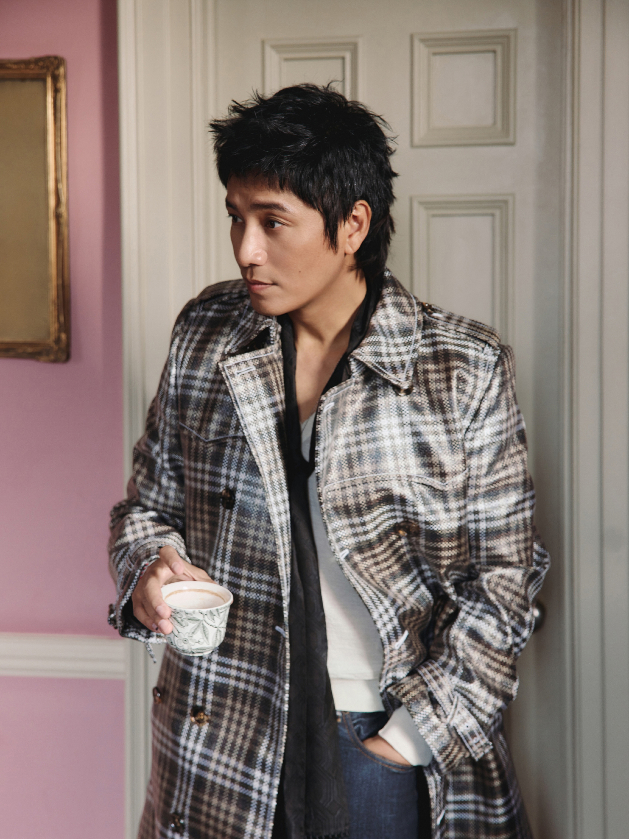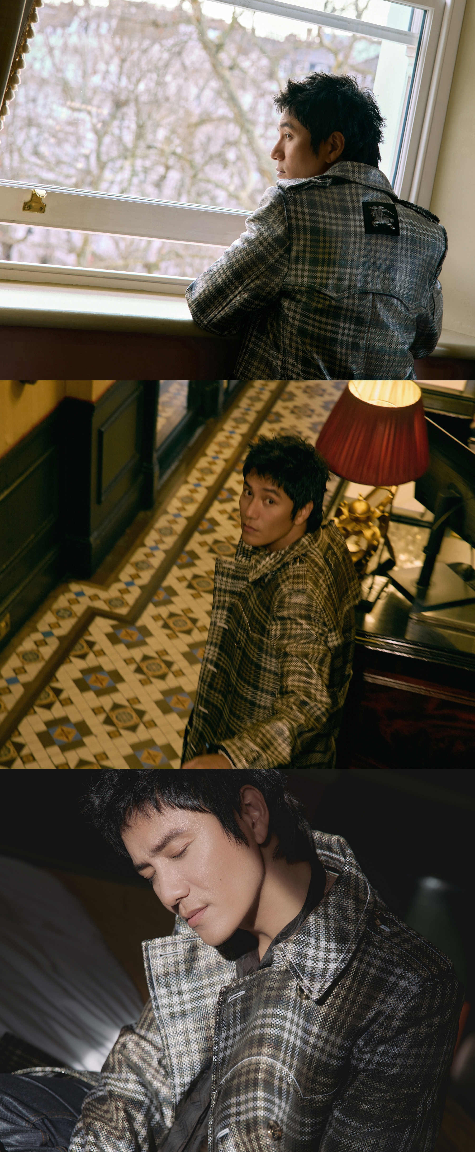 陈坤伦敦时装周看秀造型Burberry 2026 冬季系列时装大秀 2026 夏季系列新作格纹涂层 Foxfield Trench 风衣搭配涂层牛仔裤