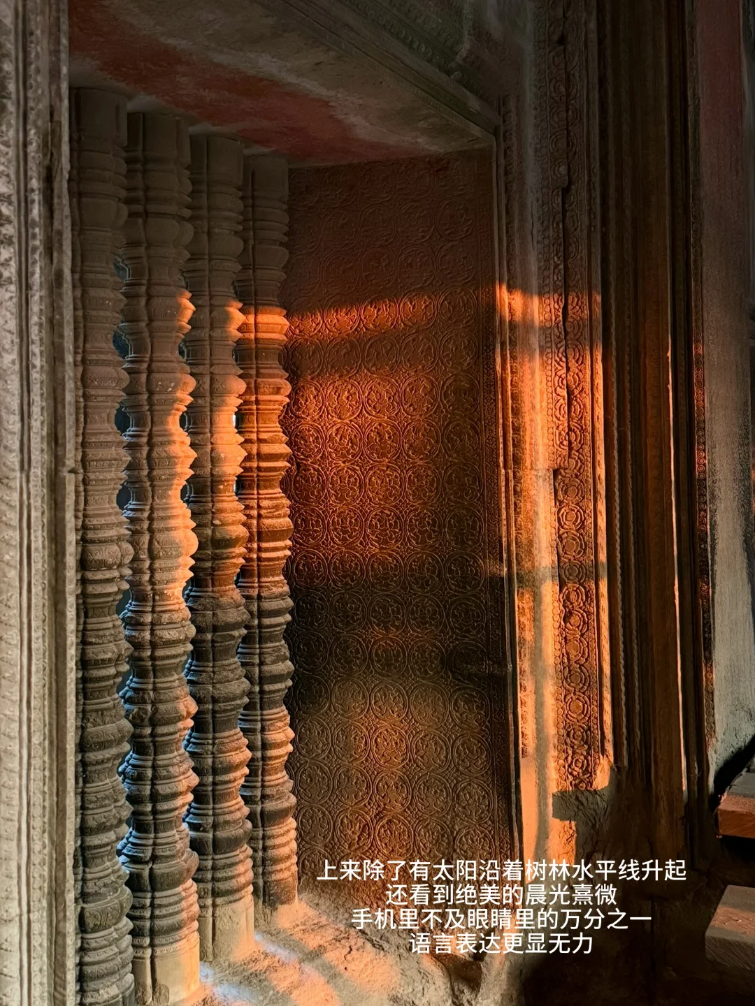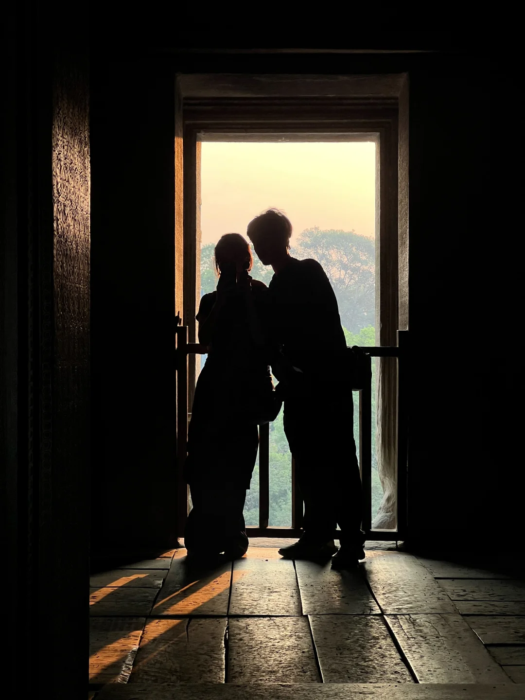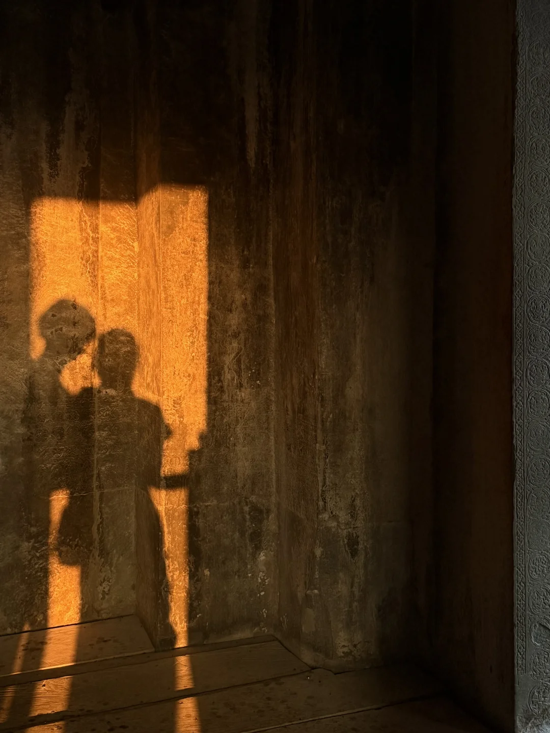 护城河是海洋,回廊是山脉,五座莲花塔是宇宙中心的须弥山。彼时站在主塔,就是这座宇宙的正中央。如果世界有轴心,那一刻我们仿佛站在轴上。光线加持,趁机拍下两个人的影子,这已经很美了