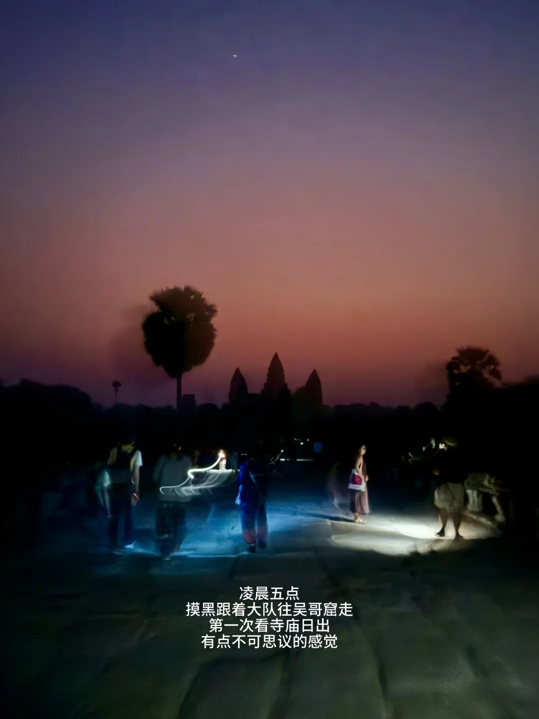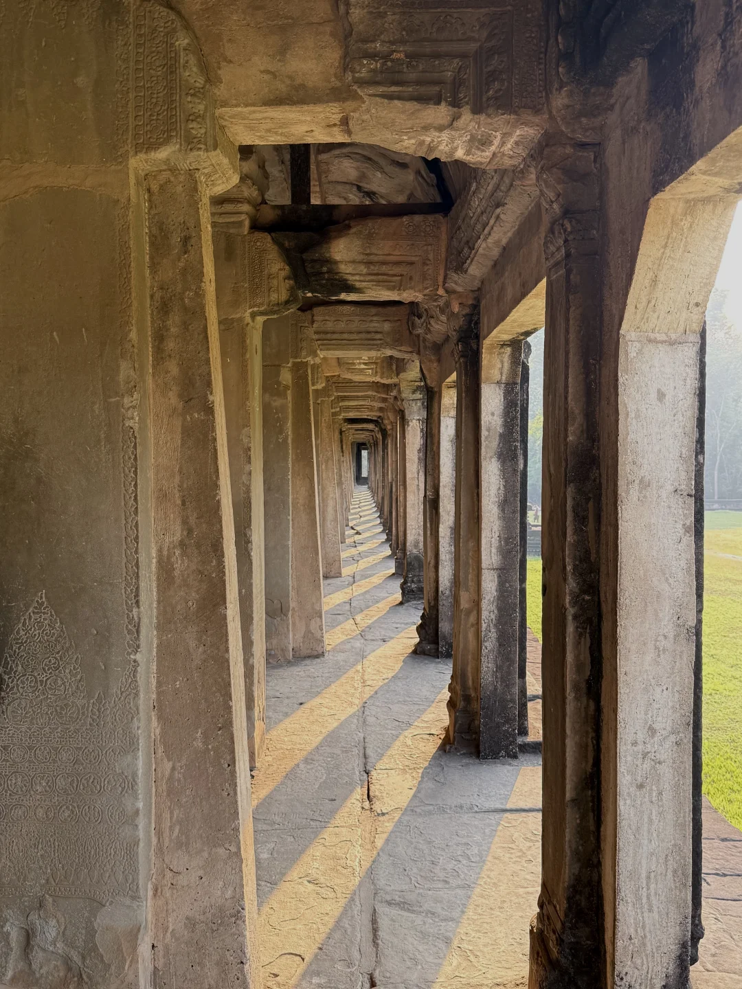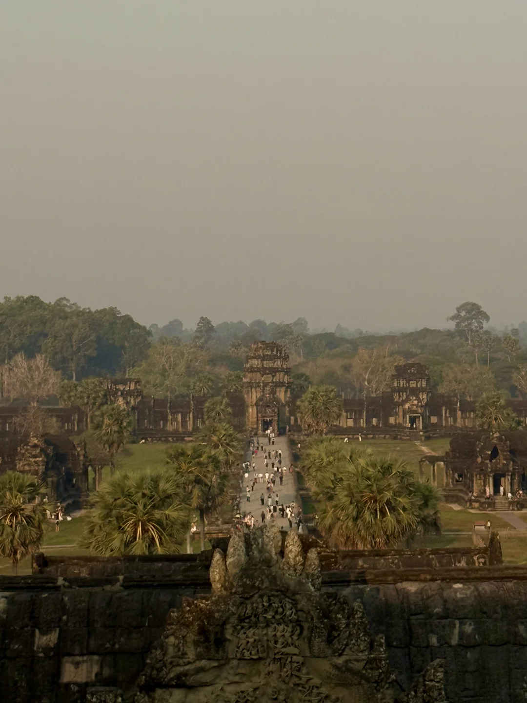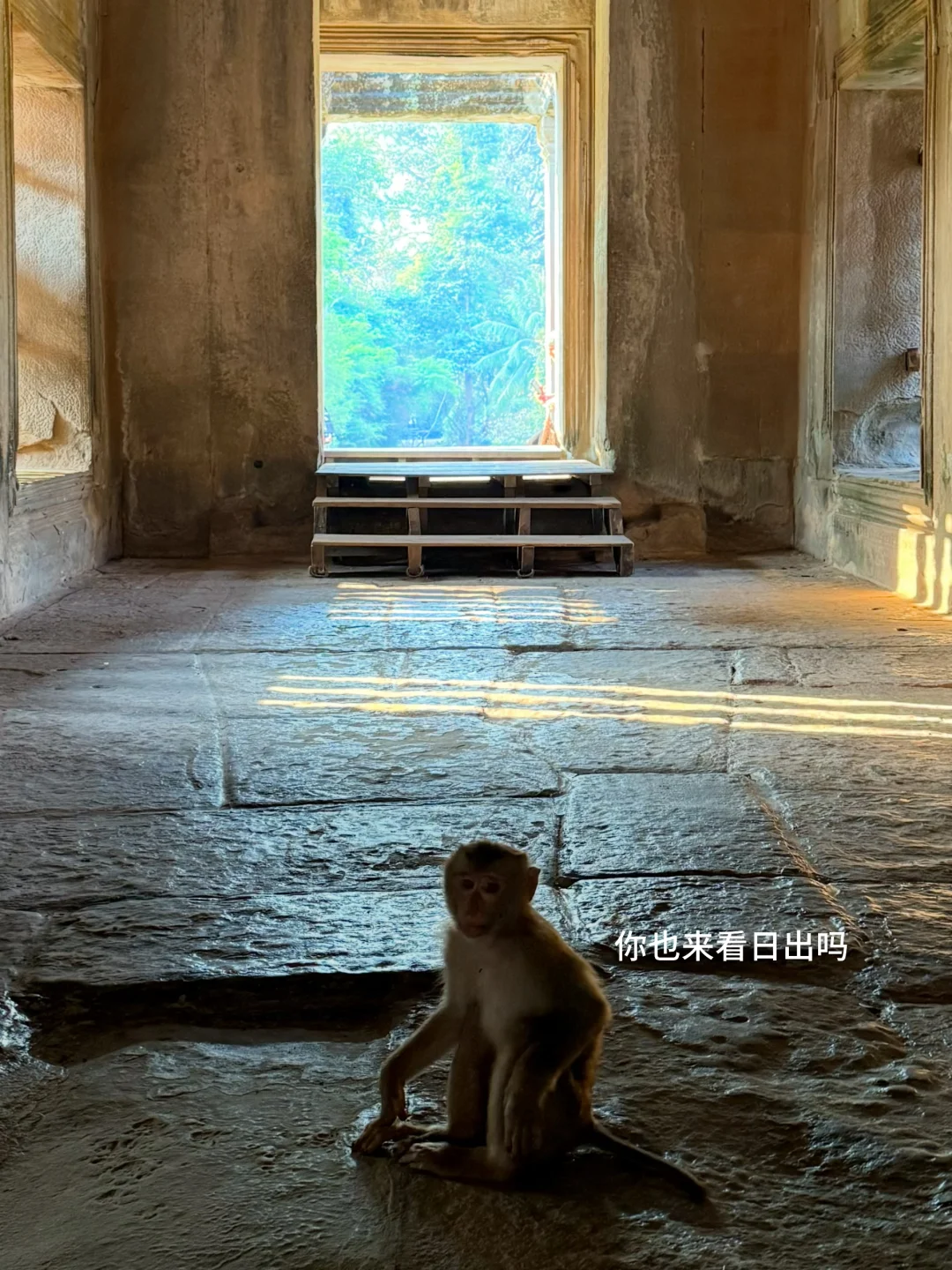 护城河是海洋,回廊是山脉,五座莲花塔是宇宙中心的须弥山。彼时站在主塔,就是这座宇宙的正中央。如果世界有轴心,那一刻我们仿佛站在轴上。光线加持,趁机拍下两个人的影子,这已经很美了