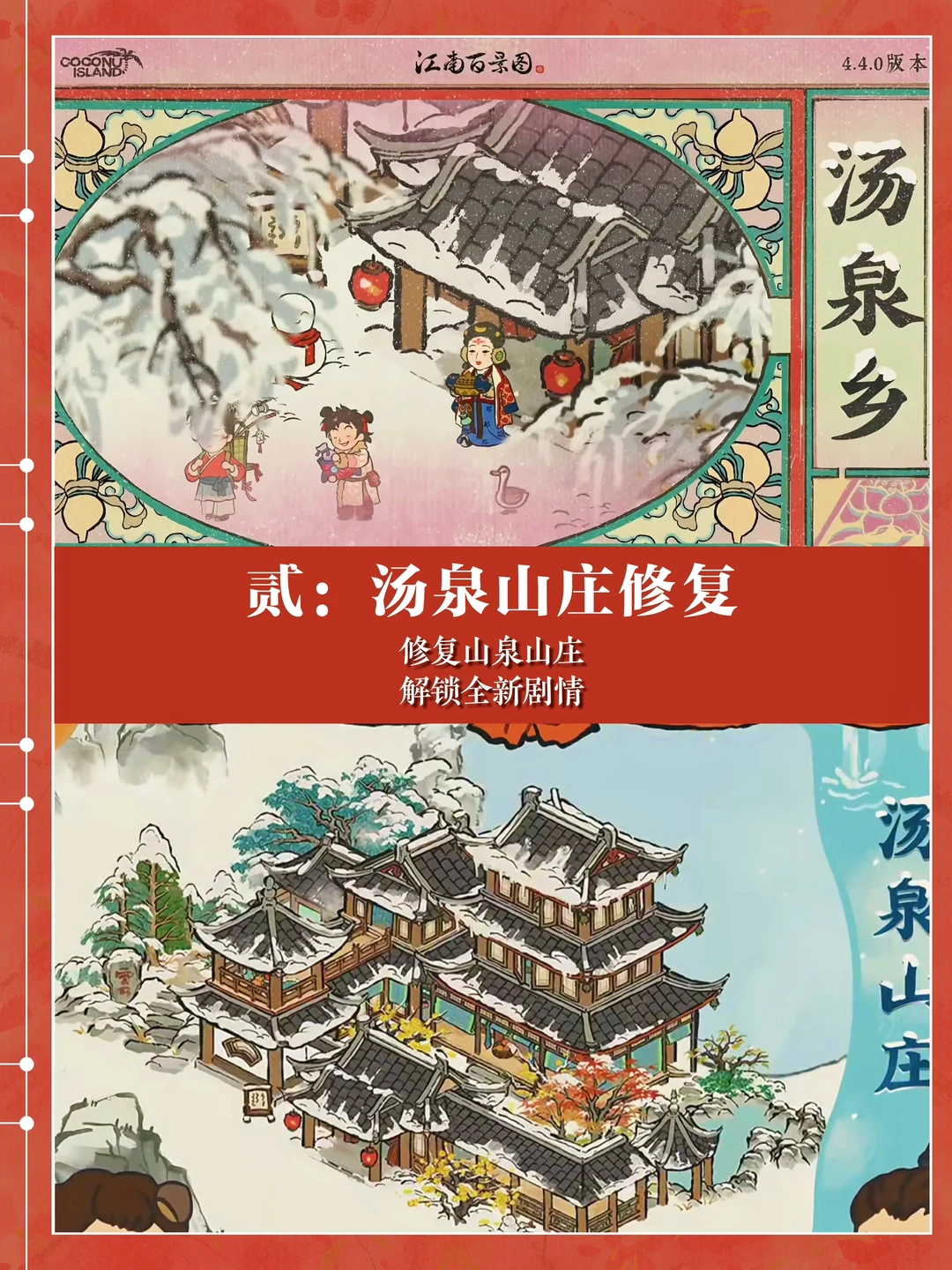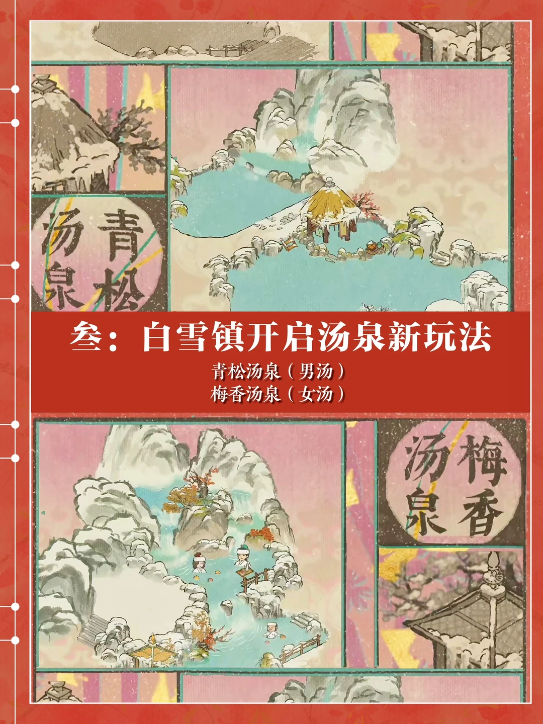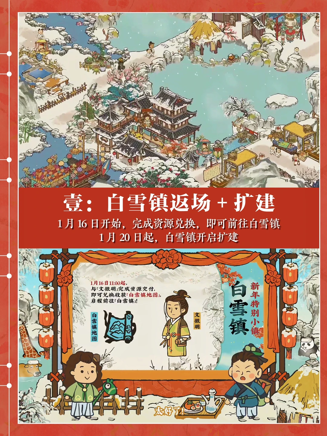 1️⃣白雪镇返场及扩建:1月16日去年没有开启白雪镇的知府大人可以通过兑换资源获取地图,1月20日白雪镇扩建 2️⃣扩建后的白雪镇,开启汤泉山庄修复 3️⃣汤泉新玩法(青松汤泉+梅香汤泉) 4️⃣小动物汤泉(接待小动物) 5️⃣汤泉的调汤玩法 6️⃣汤姑|汤大年上线,通过金泥画池抽取 7️⃣白雪镇专属建筑及新春小建筑上线 8️⃣灯会画池上新,人工湖优化可以放置水上建筑
