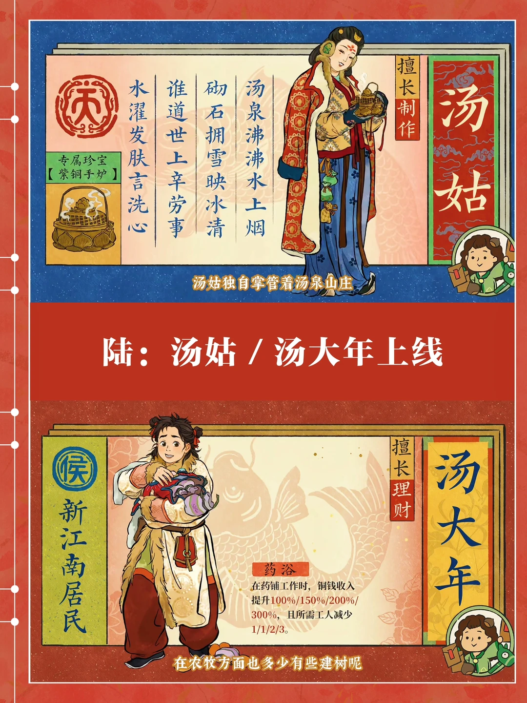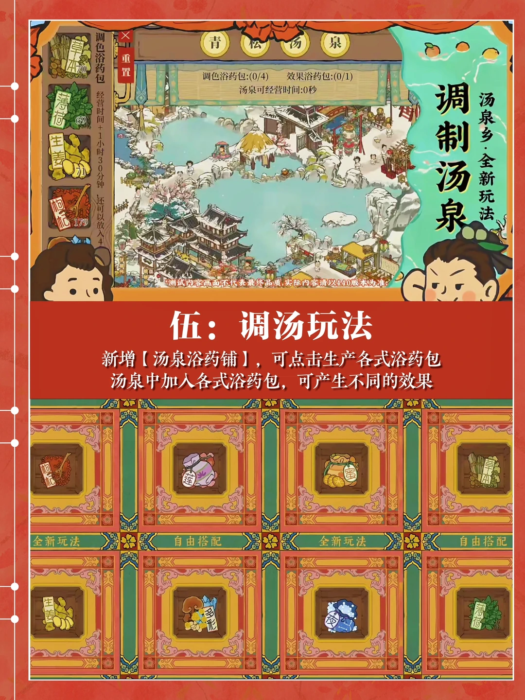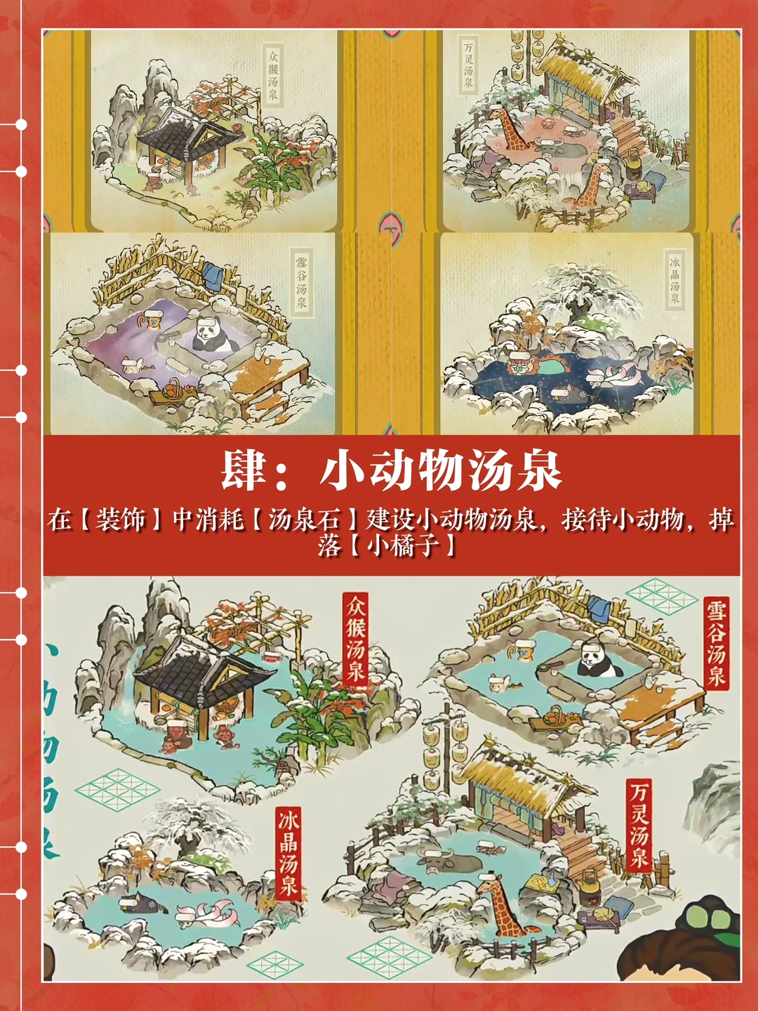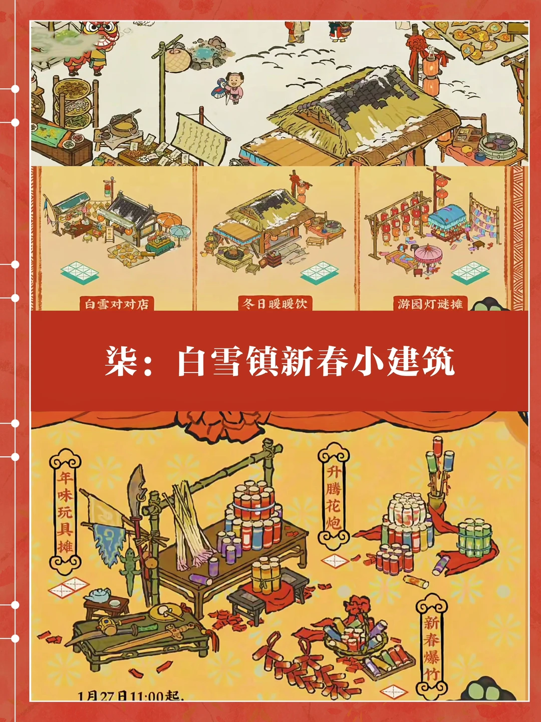 1️⃣白雪镇返场及扩建:1月16日去年没有开启白雪镇的知府大人可以通过兑换资源获取地图,1月20日白雪镇扩建 2️⃣扩建后的白雪镇,开启汤泉山庄修复 3️⃣汤泉新玩法(青松汤泉+梅香汤泉) 4️⃣小动物汤泉(接待小动物) 5️⃣汤泉的调汤玩法 6️⃣汤姑|汤大年上线,通过金泥画池抽取 7️⃣白雪镇专属建筑及新春小建筑上线 8️⃣灯会画池上新,人工湖优化可以放置水上建筑