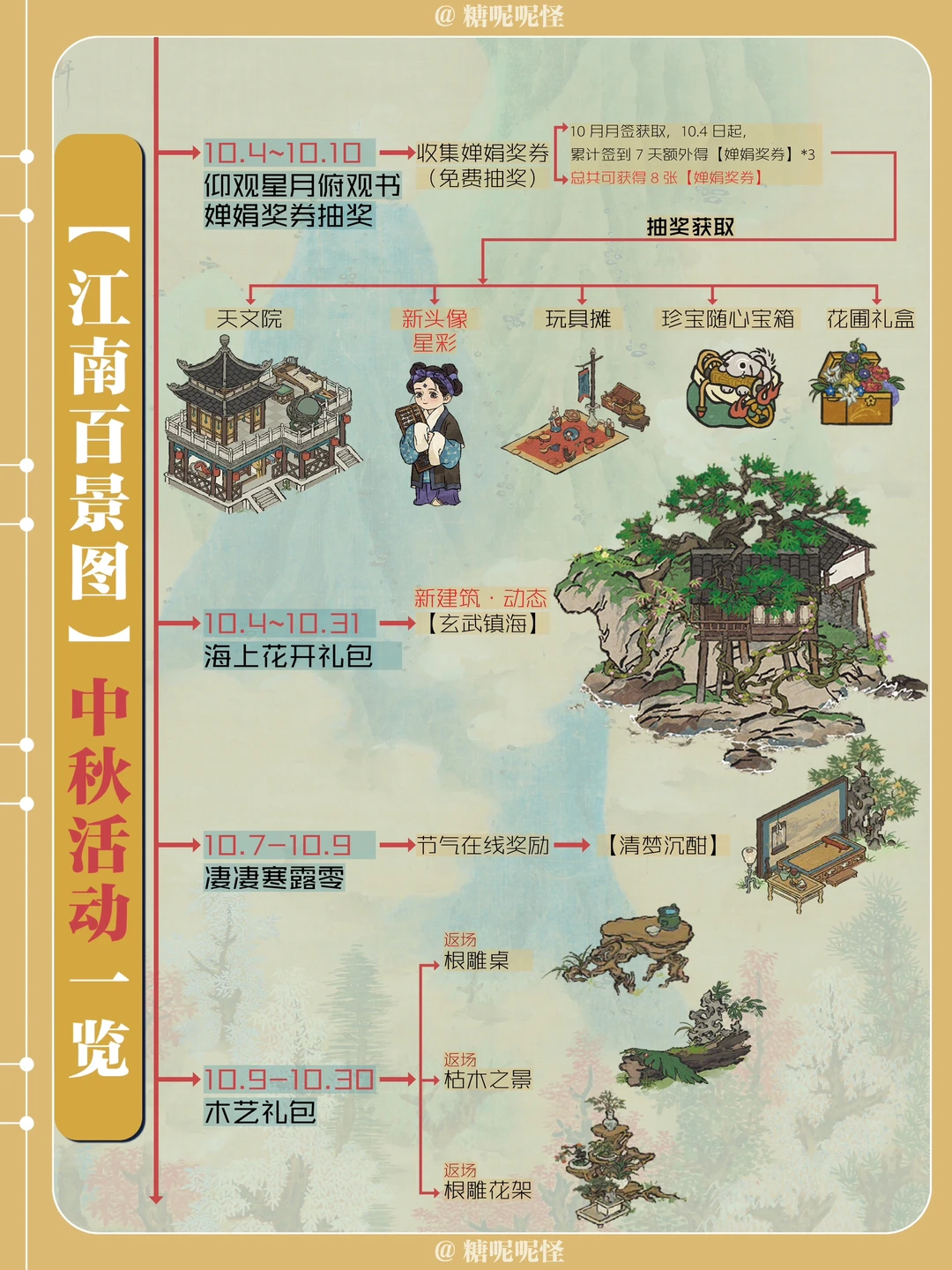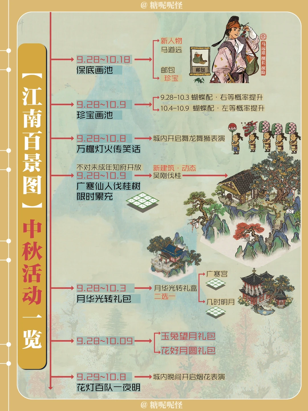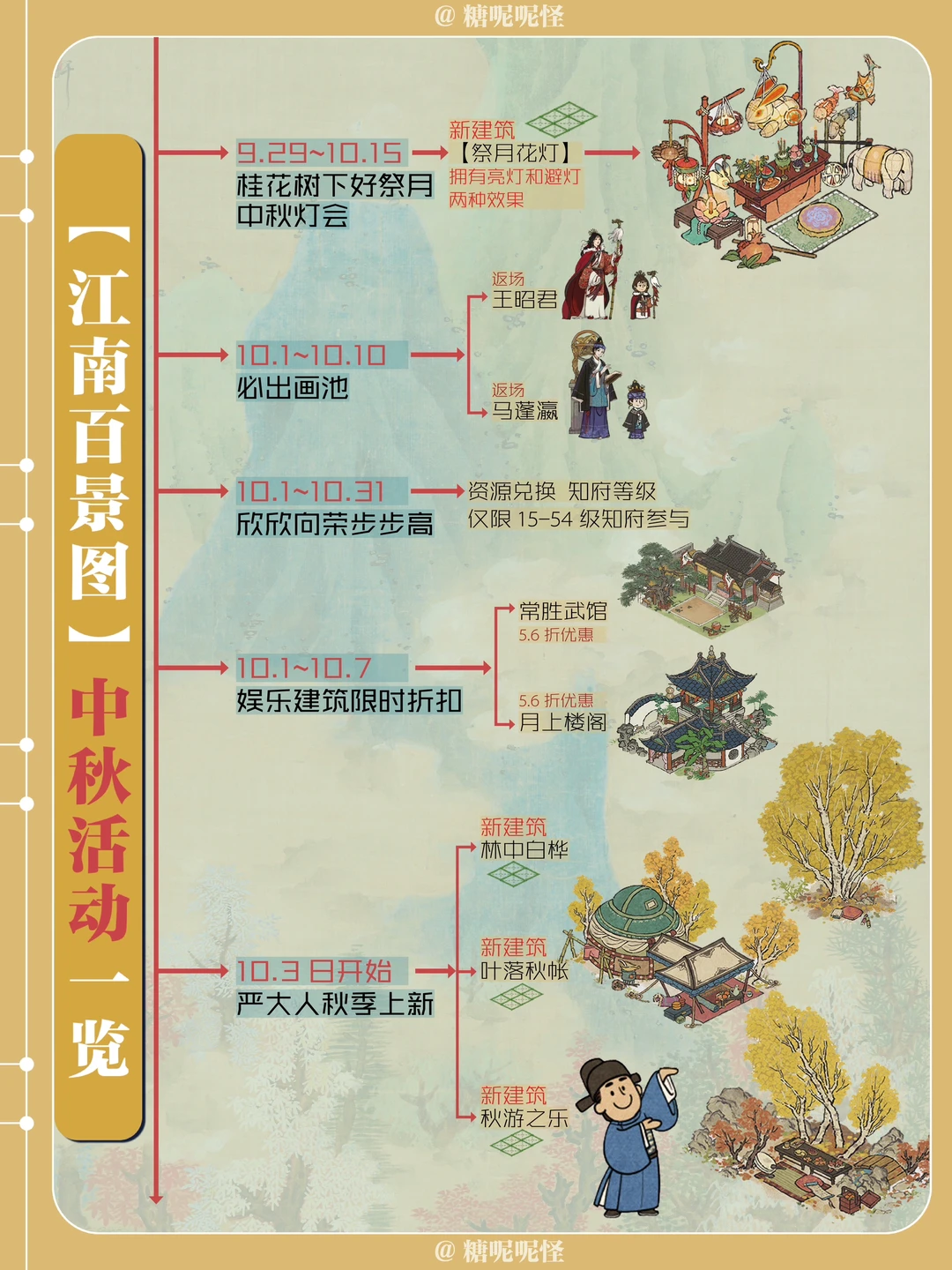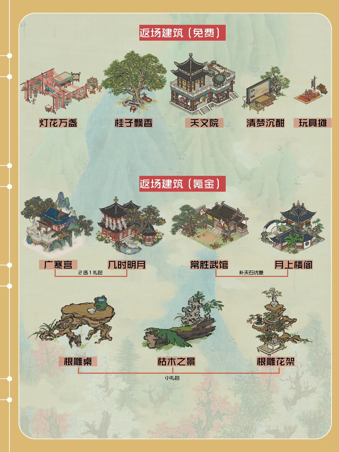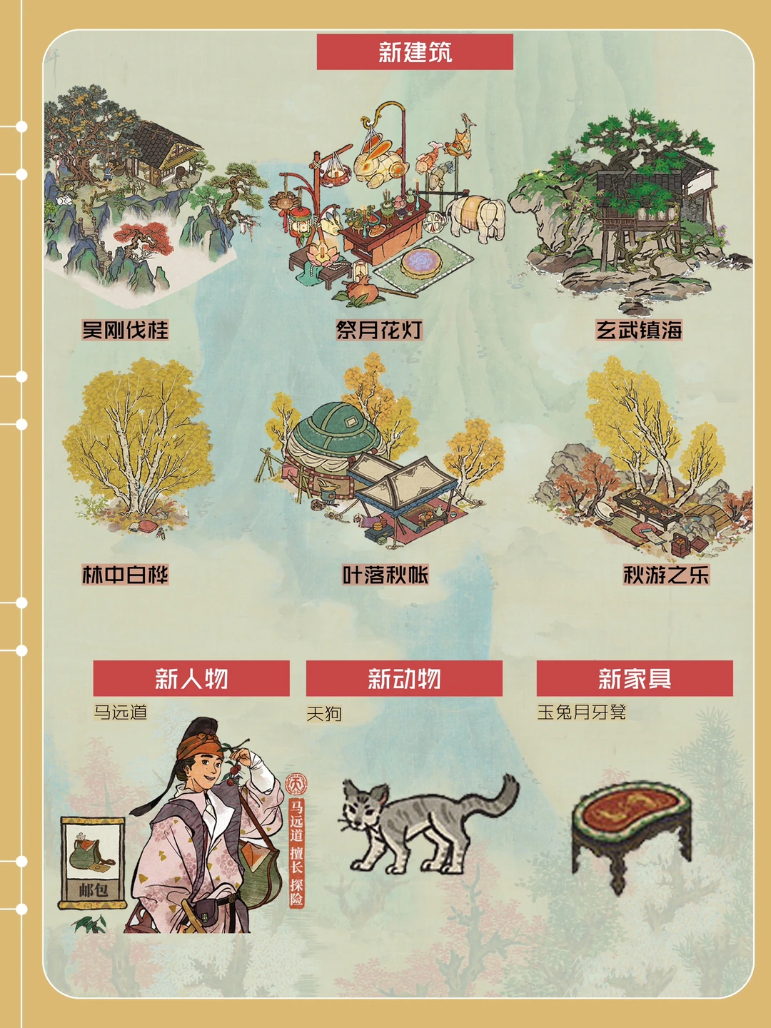 总结 新建筑: 【吴刚伐桂】【祭月花灯】【玄武镇海】【林中白桦】【叶落秋帐】【秋游之乐】 新人物: 【马远道】 新动物: 【天狗】