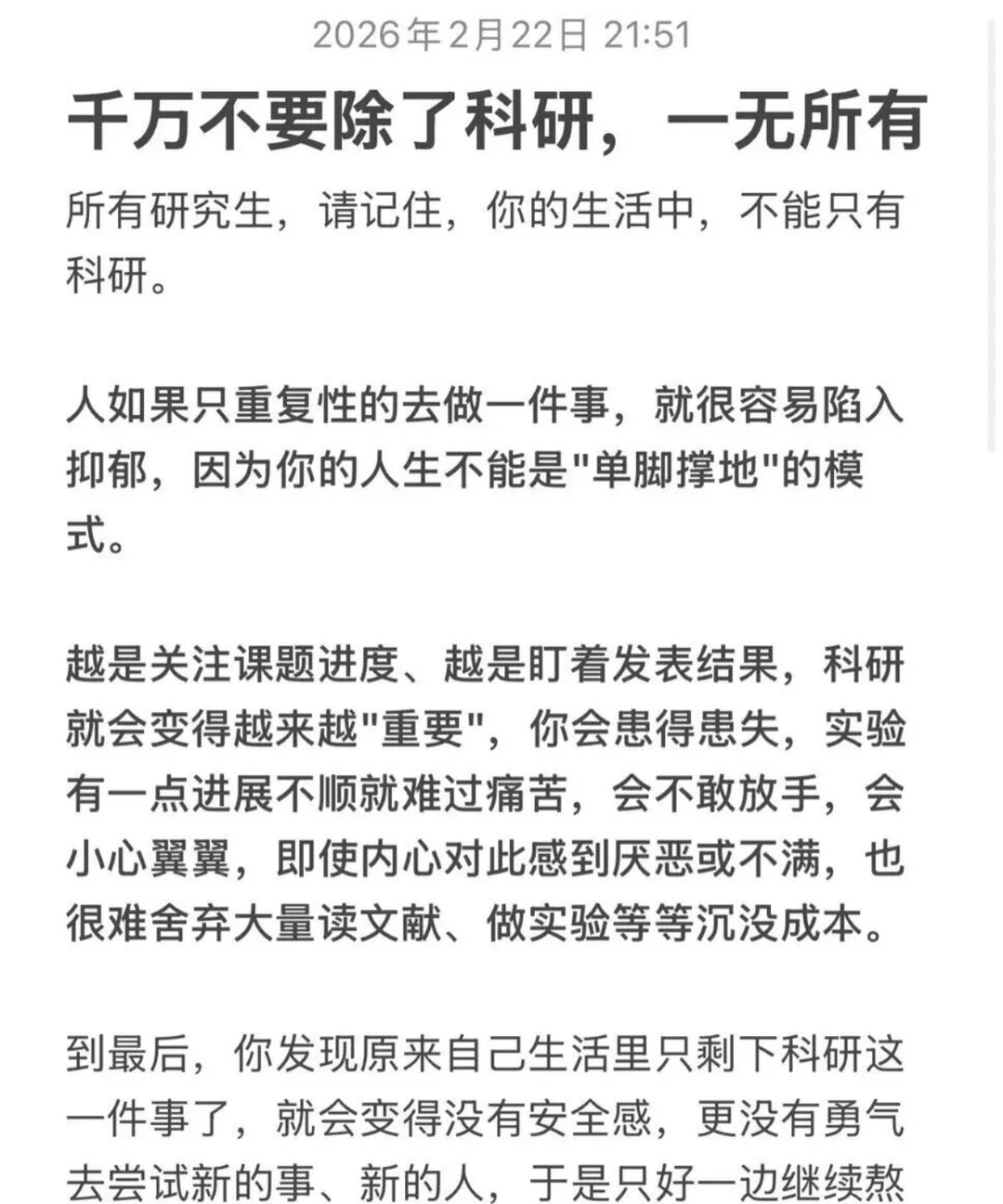 千万不要除了科研,一无所有所有研究生,请记住,你的生活中,不能只有科研。