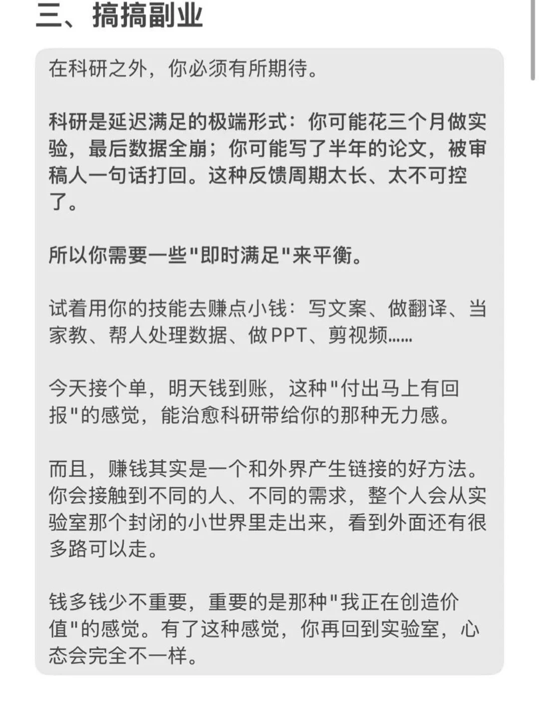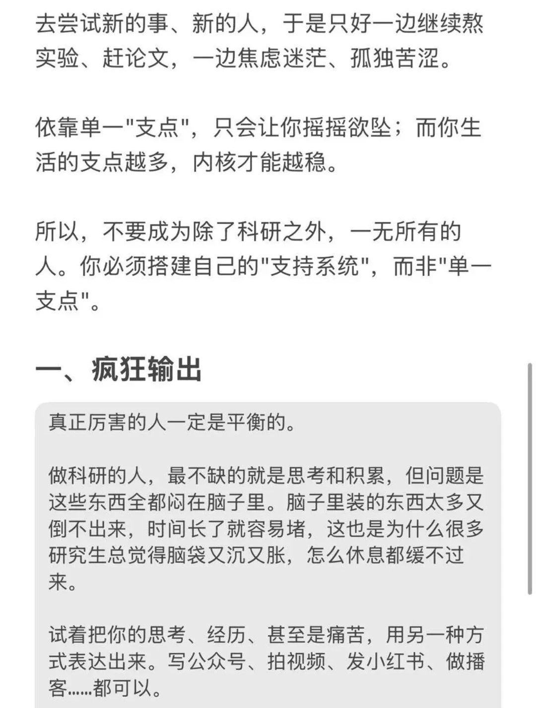 到最后,你发现原来自己生活里只剩下科研这一件事了,就会变得没有安全感,更没有勇气去尝试新的事、新的人,于是只好一边继续熬
