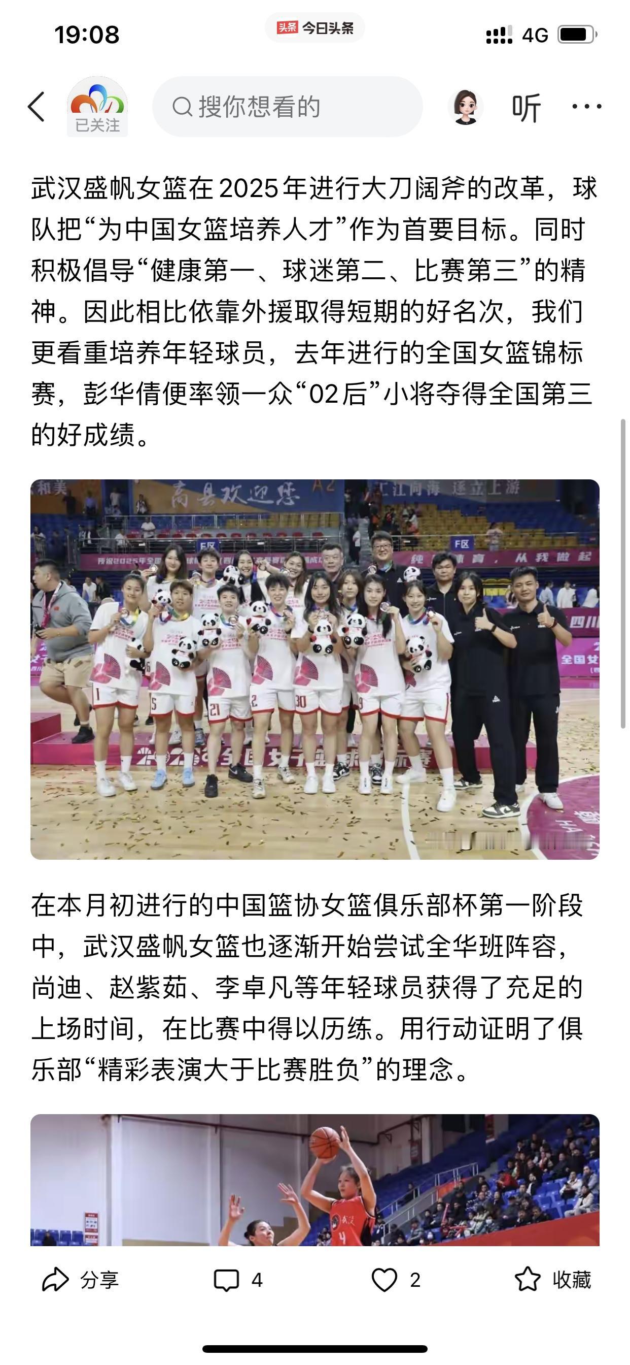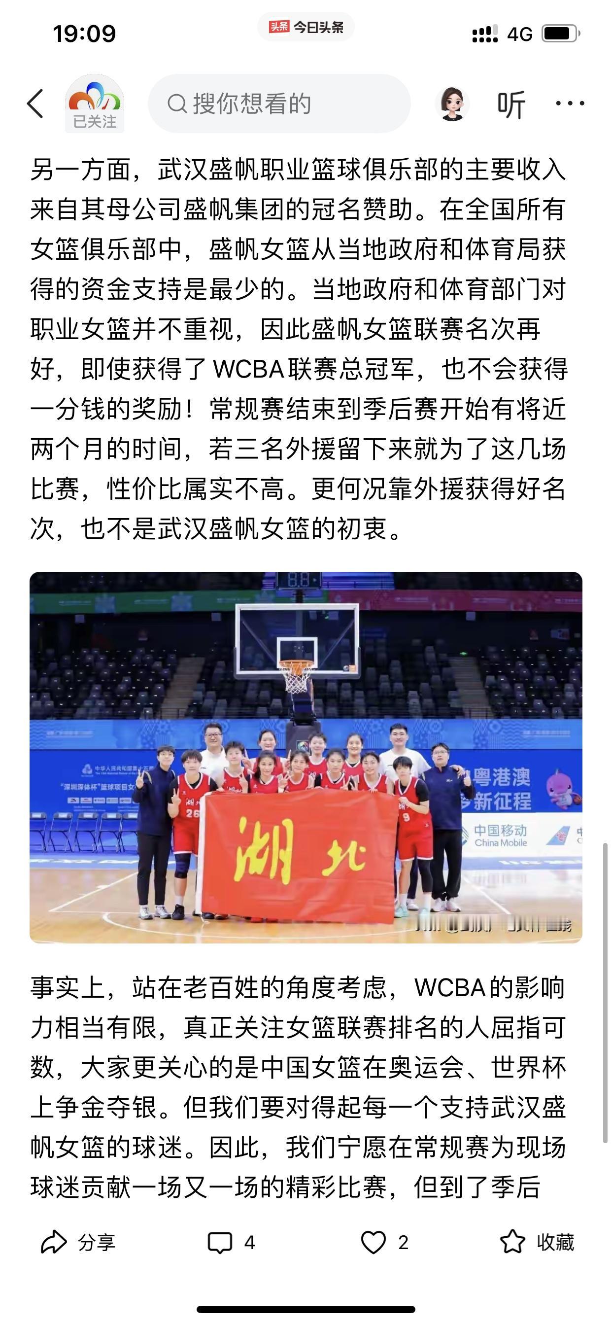 “武汉广电体育在线”用词不当啊!(也反映出WCBA俱乐部的生存困境) 什么叫:“不争虚名?” 照此所言,难道WCBA其她球队争夺总冠军就是为了争夺虚名?这是什么逻辑? 我已经两三次发现这个地方性的官方媒体账号发文存在不恰当的表达! 如果仔细看下面截图的发文,其实是武汉女篮从现实考量出发,决定在季后赛放弃外援,以全华班征战季后赛。 并不是真的像这个账号所言,是“不为虚名”。 说的再直白点,如果常规赛阶段,武汉女篮斩获了第一或第二,我相信她们俱乐部不可能放弃这个争夺更好成绩的机会!