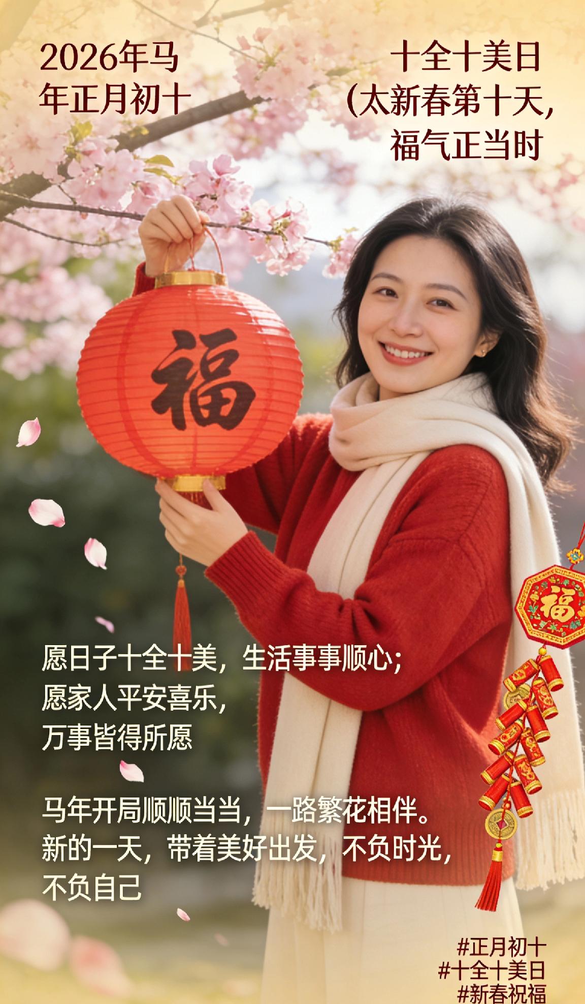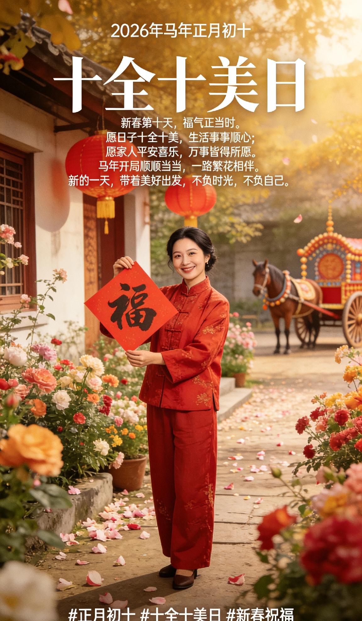 正月初十,十全十美日✨ 新春第十天,福气正当时。 愿日子十全十美,生活事事顺心; 愿家人平安喜乐,万事皆得所愿。 马年开局顺顺当当,一路繁花相伴。 新的一天,带着美好出发,不负时光,不负自己。 正月初十 十全十美日