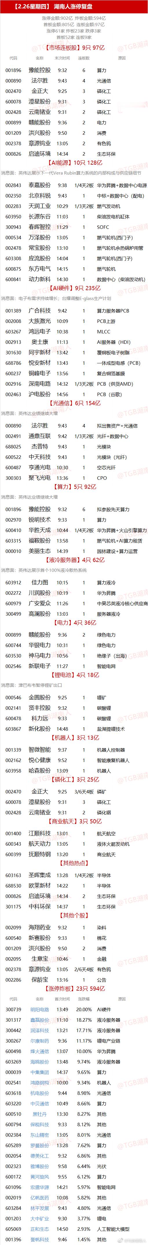 【2.26星期四】 湖南人涨停复盘 "涨停金额:902亿 炸板金额:594亿首板金额:805亿 连板金额:97亿涨停61家 炸板23家 跌停3家首板52家 连板9家" 【市场连板股】9只 97亿 代码 名称 末次时间 连板数 原因001896 豫能控股 9:32 6 算力000890 法尔胜 9:43 4 光通信002470 金正大 9:25 3 磷化工600078 澄星股份 9:31 3 磷化工002428 云南锗业 9:31 2 磷化工000899 赣能股份 9:36 2 电力001209 洪兴股份 9:50 2 消费002378 章源钨业 13:05 2 有色钨000826 启迪环境 14:34 2 生态环保【AI能源】10只 128亿 消息面:英伟达展示下一代Vera Rubin算力系统的内部构成与供应链细节 002843 泰嘉股份 9:38 1/4天2板 华为昇腾+数据中心电源002350 北京科锐 9:43 1 中标+数据中心(配电)002283 天润工业 10:29 1/3天2板 燃气发动机603950 长源东谷 11:03 1 柴油发电机缸体300943 春晖智控 11:29 1 SOFC000534 万泽股份 13:05 1 燃气轮机(西门子)002478 常宝股份 13:10 1 燃气轮机余热锅炉用管603308 应流股份 14:04 1 燃气轮机(西门子)600875 东方电气 14:15 1 燃气轮机600841 动力新科 14:30 1 数据中心(柴油发动机)【AI硬件】9只 235亿 消息面:电子布需求持续增长;台耀调整E-glass生产计划 001389 广合科技 9:42 1 算力服务器PCB002008 大族激光 10:09 1 PCB上游603267 鸿远电子 10:38 1 MLCC002913 奥士康 11:13 1 AI服务器(HDI)301630 同宇新材 13:42 1 覆铜板电子树脂688786 悦安新材 13:43 1 一体成型电感(PCB)600237 铜峰电子 13:56 1 复合铜箔基膜002916 深南电路 14:32 1/3天2板 PCB(供货AMD)002463 沪电股份 14:56 1 PCB(谷歌)【光通信】6只 154亿 消息面:英伟达业绩继续大增 000890 法尔胜 9:43 4 拟出售资产+光通信002491 通鼎互联 9:42 1/3天2板 光纤+数据中心688025 杰普特 9:43 1 光模块600522 中天科技 9:43 1 光模块(光纤)600487 亨通光电 10:30 1 空芯光纤300303 聚飞光电 13:36 1 CPO【算力】5只 92亿 消息面:英伟达业绩继续大增 001896 豫能控股 9:32 6 拟参股先天算力002970 锐明技术 9:33 1 算力600410 华胜天成 10:44 1/4天2板 华为昇腾+火山引擎算力603315 福鞍股份 13:58 1 燃气轮机+AI算力租赁000010 美丽生态 14:39 1 园林建设+算力运营【液冷服务器】4只 62亿 消息面:英伟达展示首个100%液冷散热系统 603912 佳力图 10:15 1 算力液冷002272 川润股份 10:19 1 华为昇腾600979 广安爱众 11:26 1 中昊芯英液冷核心供应商300499 高澜股份 13:03 1 服务器液冷【电力】4只 36亿 000899 赣能股份 9:36 2 绿色电力600744 华银电力 10:31 1 绿色电力603530 神马电力 10:56 1 绝缘子(出海)002546 新联电子 11:27 1 智能电网【锂电池】4只 18亿 消息面:津巴布韦暂停锂矿出口 000546 金圆股份 9:25 1 锂矿002141 贤丰控股 9:32 1 碳酸锂600478 科力远 9:33 1 碳酸锂603867 新化股份 14:48 1 盐湖提锂技术【机器人】3只 13亿 001339 智微智能 9:37 1 机器人控制器002162 悦心健康 9:52 1 智能康复机器人603958 哈森股份 13:09 1 机器人【磷化工】3只 25亿 002470 金正大 9:25 3/6天4板 磷矿600078 澄星股份 9:31 3 磷化工002428 云南锗业 9:31 2 磷化铟【商业航天】3只 50亿 001400 江顺科技 13:01 1 航天航空600343 航天动力 13:05 1 液体火箭发动机600399 抚顺特钢 13:20 1 商业航天【其他热点】 603163 圣晖集成 13:28 1/4天2板 半导体688530 欧莱新材 14:22 1 半导体000826 启迪环境 14:34 2 生态环保301175 中科环保 14:37 1 生态环保【其他个股】 002099 海翔药业 9:32 1 染料600540 新赛股份 9:33 1 棉花001209 洪兴股份 9:50 2 消费002095 生意宝 10:46 1 金融002378 章源钨业 13:05 2/6天4板 有色钨002286 保龄宝 13:16 1 公告【涨停炸板】23只 594亿 代码 名称 首次时间 涨跌幅 原因300739 明阳电路 13:49 20.00% AI硬件301317 鑫磊股份 11:10 18.27% 液冷服务器300442 润泽科技 13:21 17.71% 液冷服务器300267 尔康制药 9:36 11.17% 锂电产业链600498 烽火通信 13:07 10.00% 华为昇腾603269 海鸥股份 13:48 9.74% 液冷服务器000039 中集集团 14:37 9.65% 算力002541 鸿路钢构 10:00 9.34% 机器人603618 杭电股份 9:44 8.98% 光通信603220 中贝通信 10:49 8.66% 算力600510 黑牡丹 13:30 8.27% 其他600794 保税科技 9:33 8.12% 其他002384 东山精密 13:05 8.01% 光通信605289 罗曼股份 13:28 7.62% 算力002054 德美化工 9:32 6.86% 其他002323 雅博股份 9:58 6.44% 光伏600172 黄河旋风 9:55 6.12% 算力601096 宏盛华源 14:21 5.97% 智能电网002019 亿帆医药 10:08 5.82% 其他603284 林平发展 9:43 4.80% 光通信001203 大中矿业 9:30 3.77% 锂电605069 正和生态 14:50 2.93% 人工智能大模型001396 誉帆科技 9:46 1.45% 其他