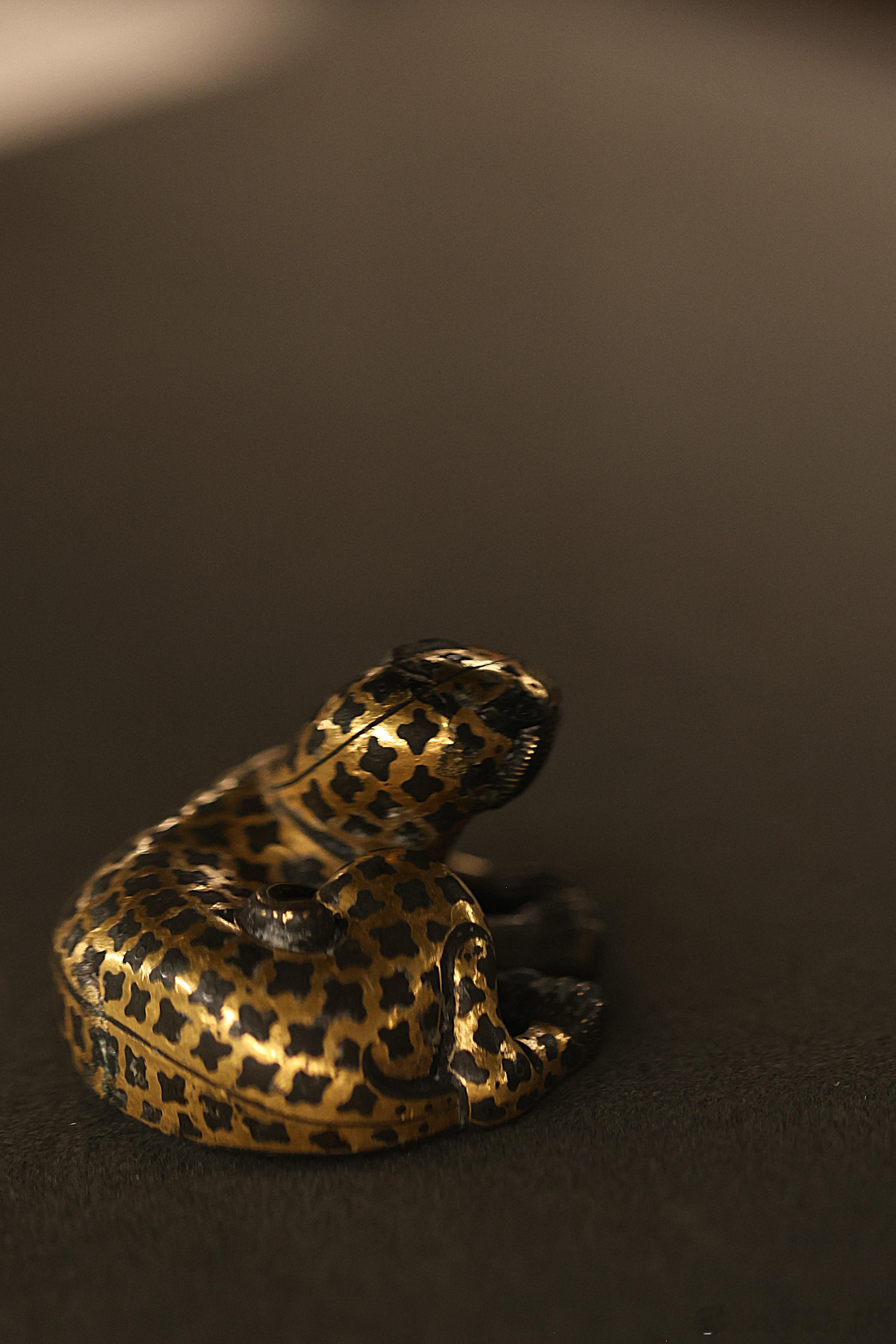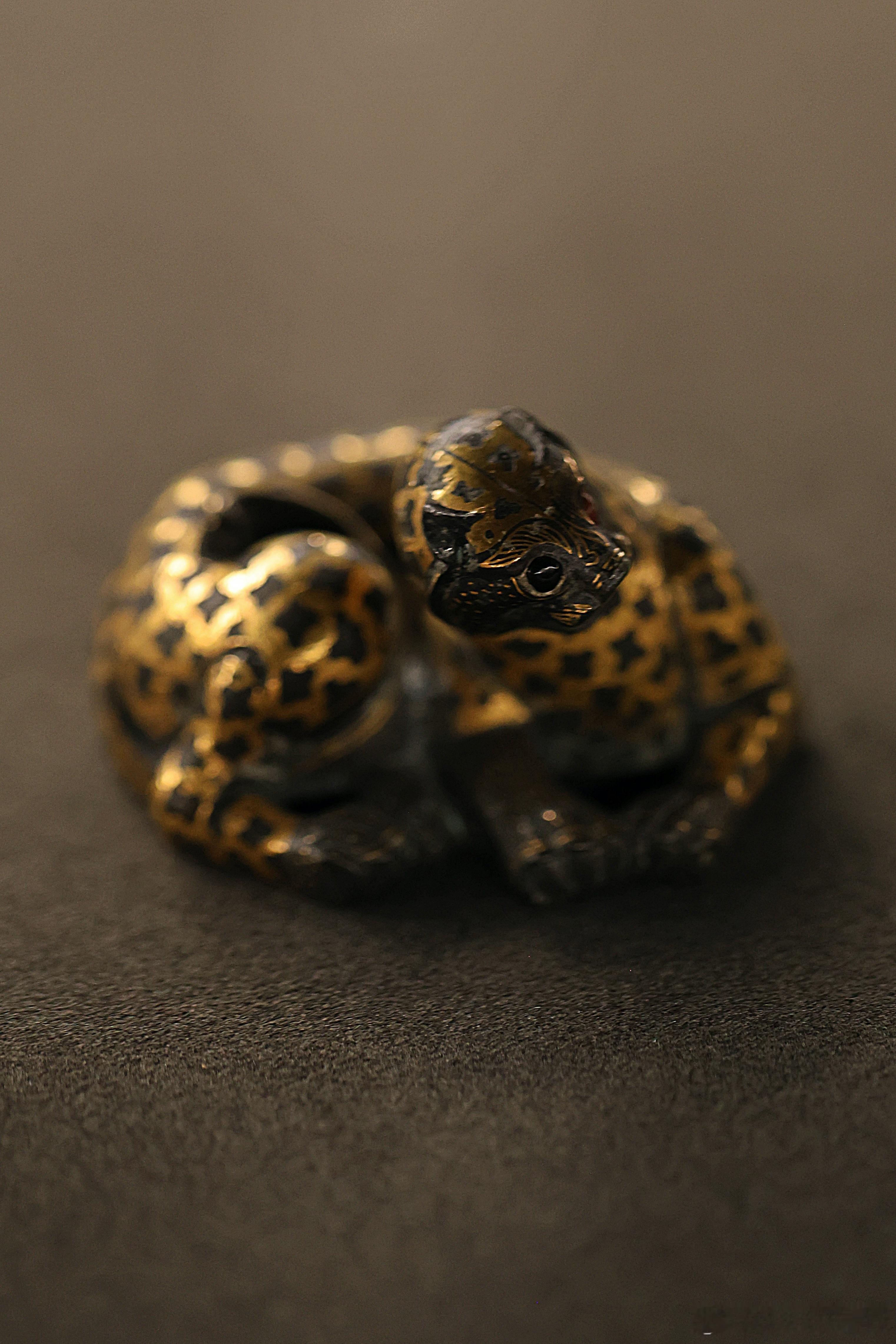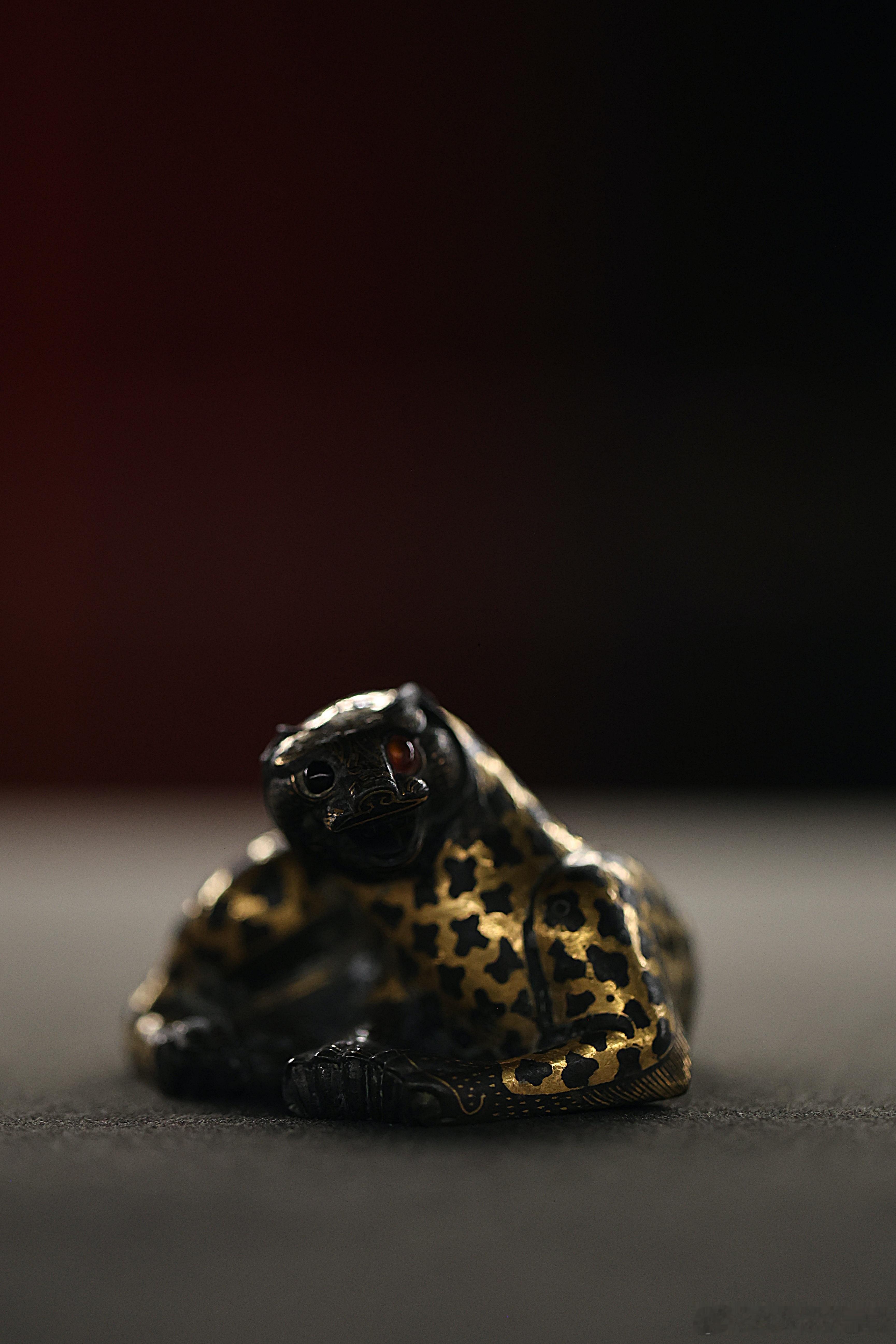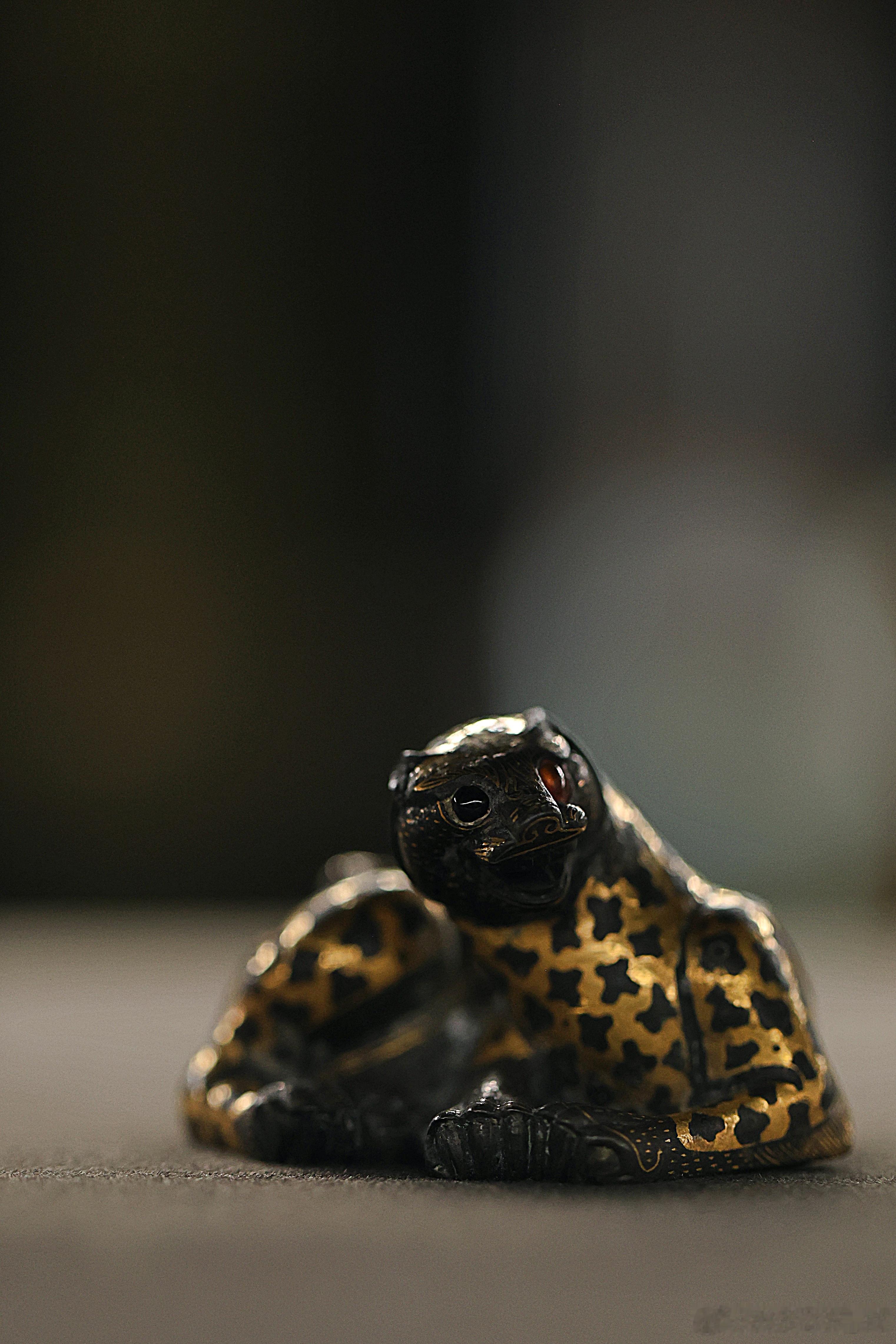 我的2026 【饰文焕彩-河北古代艺术珍品展】错金铜豹·西汉河北博物院藏成对的错金铜豹就来了一只。蜷卧状的豹子,张口昂首,尾巴弯卷。豹纹用金银错出梅花状,头、足和尾部是点状纹,口部涂红,双目镶嵌白玛瑙。为了在作镇席、镇纸时更加稳固,豹子体内灌了铅。中国美术馆展出2026.2.23约会博物馆 文物