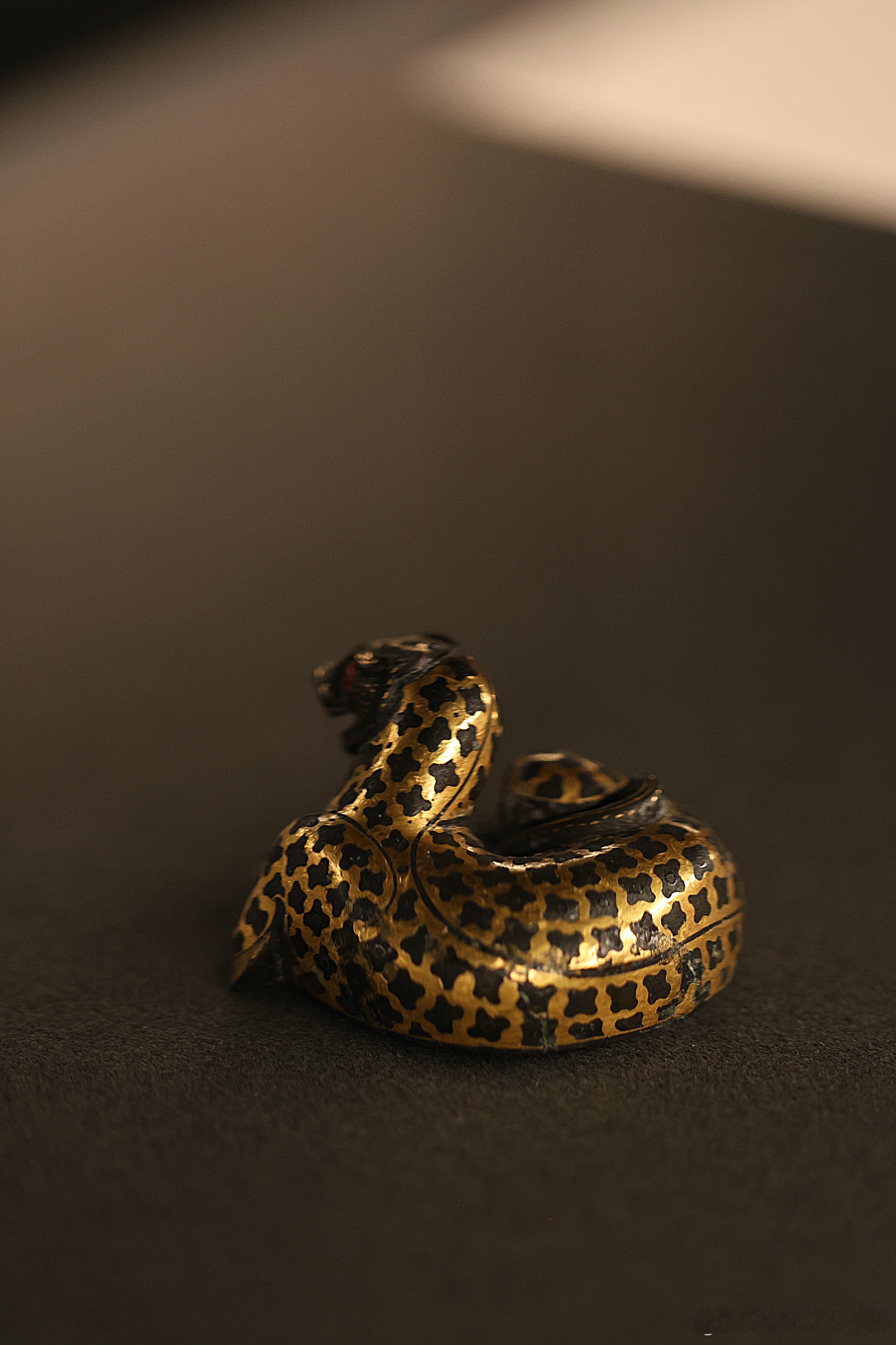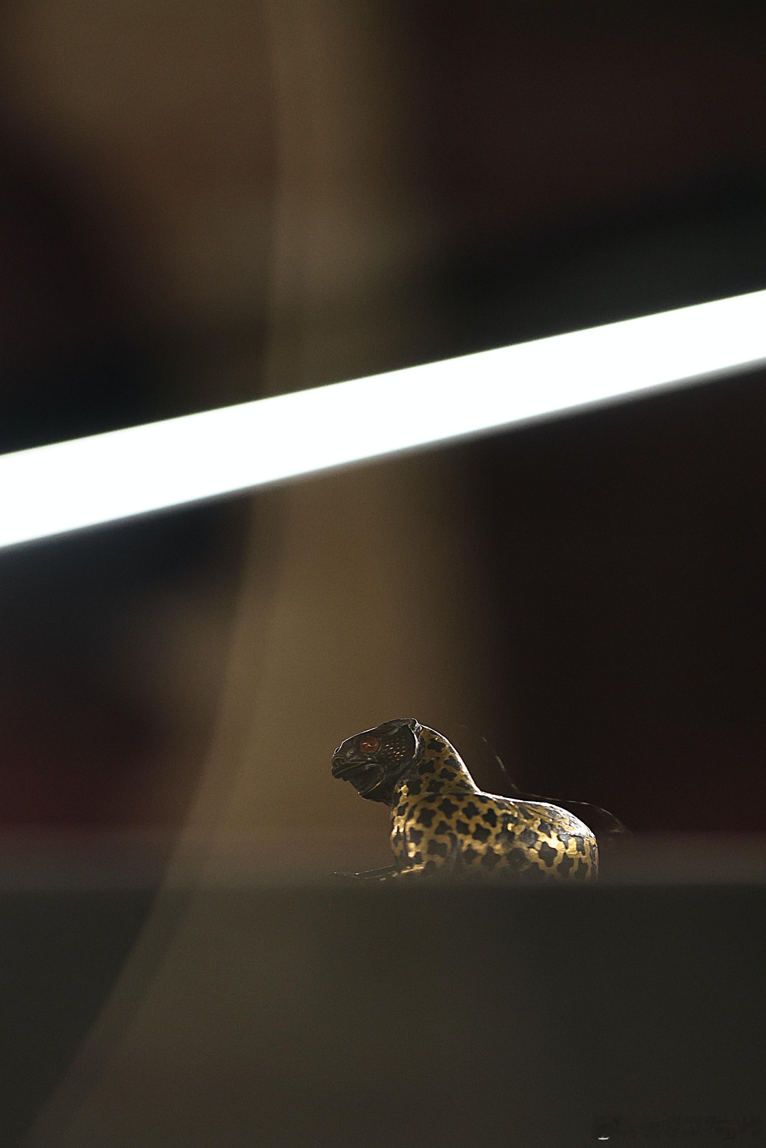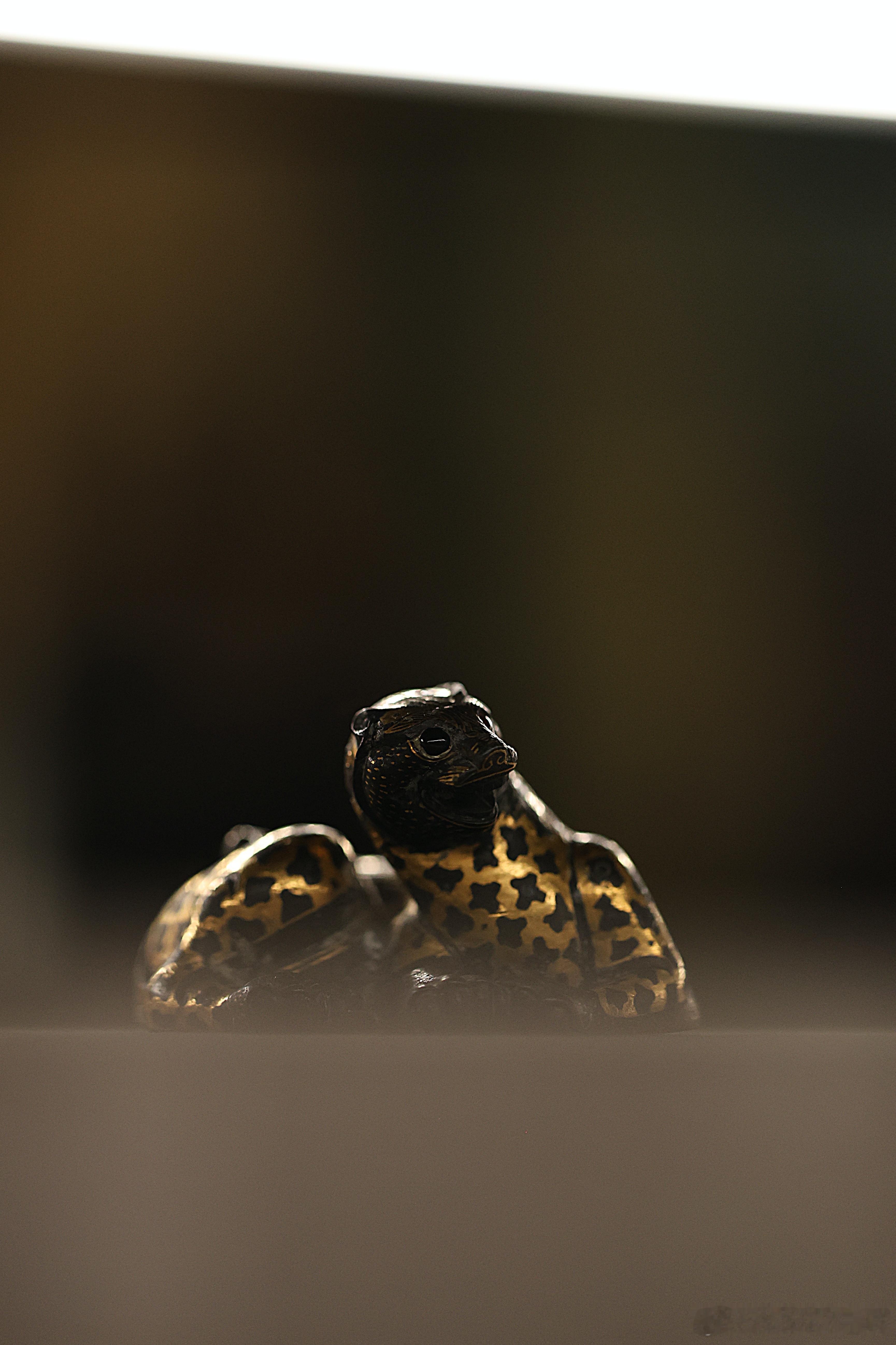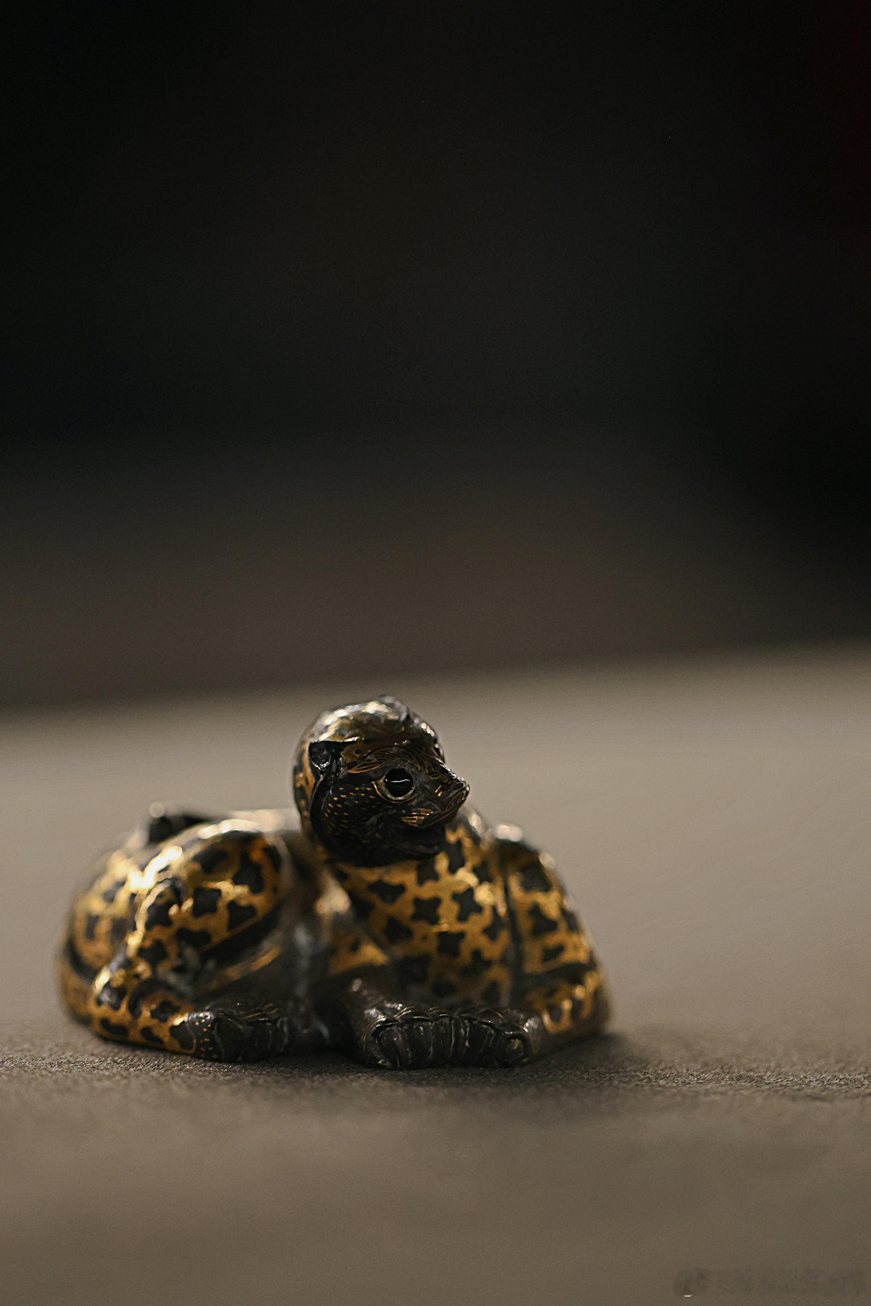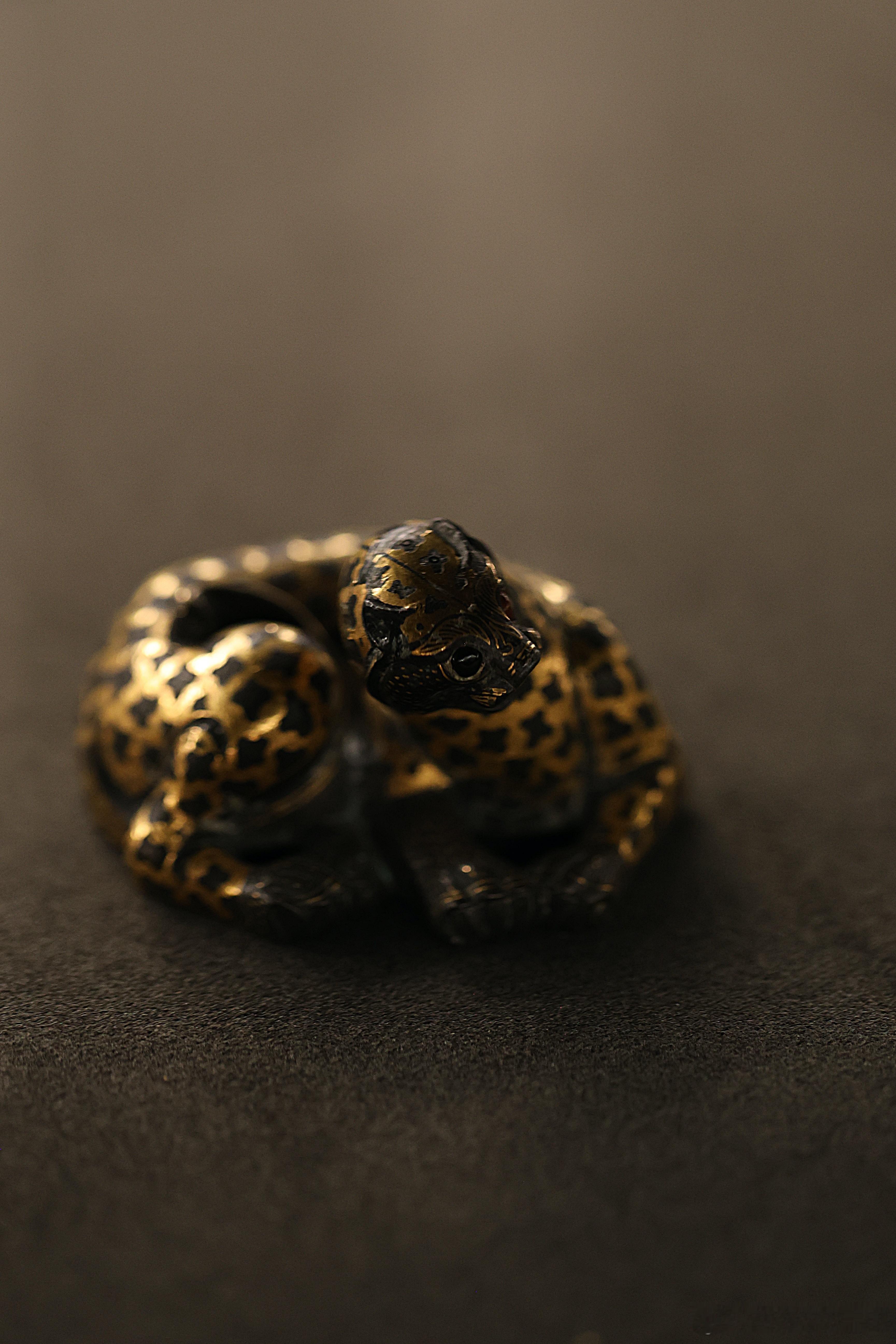 我的2026 【饰文焕彩-河北古代艺术珍品展】错金铜豹·西汉河北博物院藏成对的错金铜豹就来了一只。蜷卧状的豹子,张口昂首,尾巴弯卷。豹纹用金银错出梅花状,头、足和尾部是点状纹,口部涂红,双目镶嵌白玛瑙。为了在作镇席、镇纸时更加稳固,豹子体内灌了铅。中国美术馆展出2026.2.23约会博物馆 文物