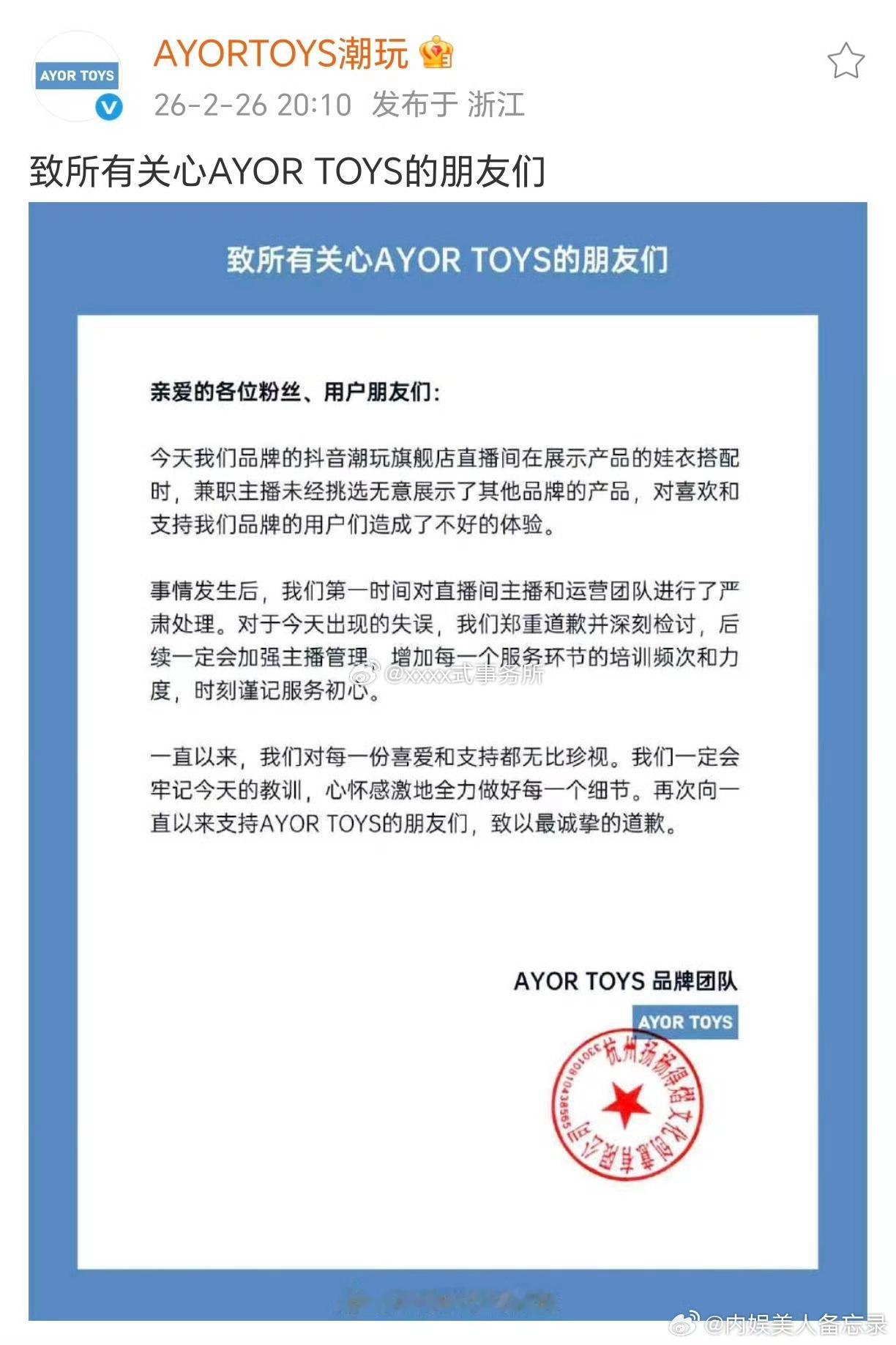 AYORTOYS自官宣以来 首日官宣战报4000w,直播战报3000w,第八次售