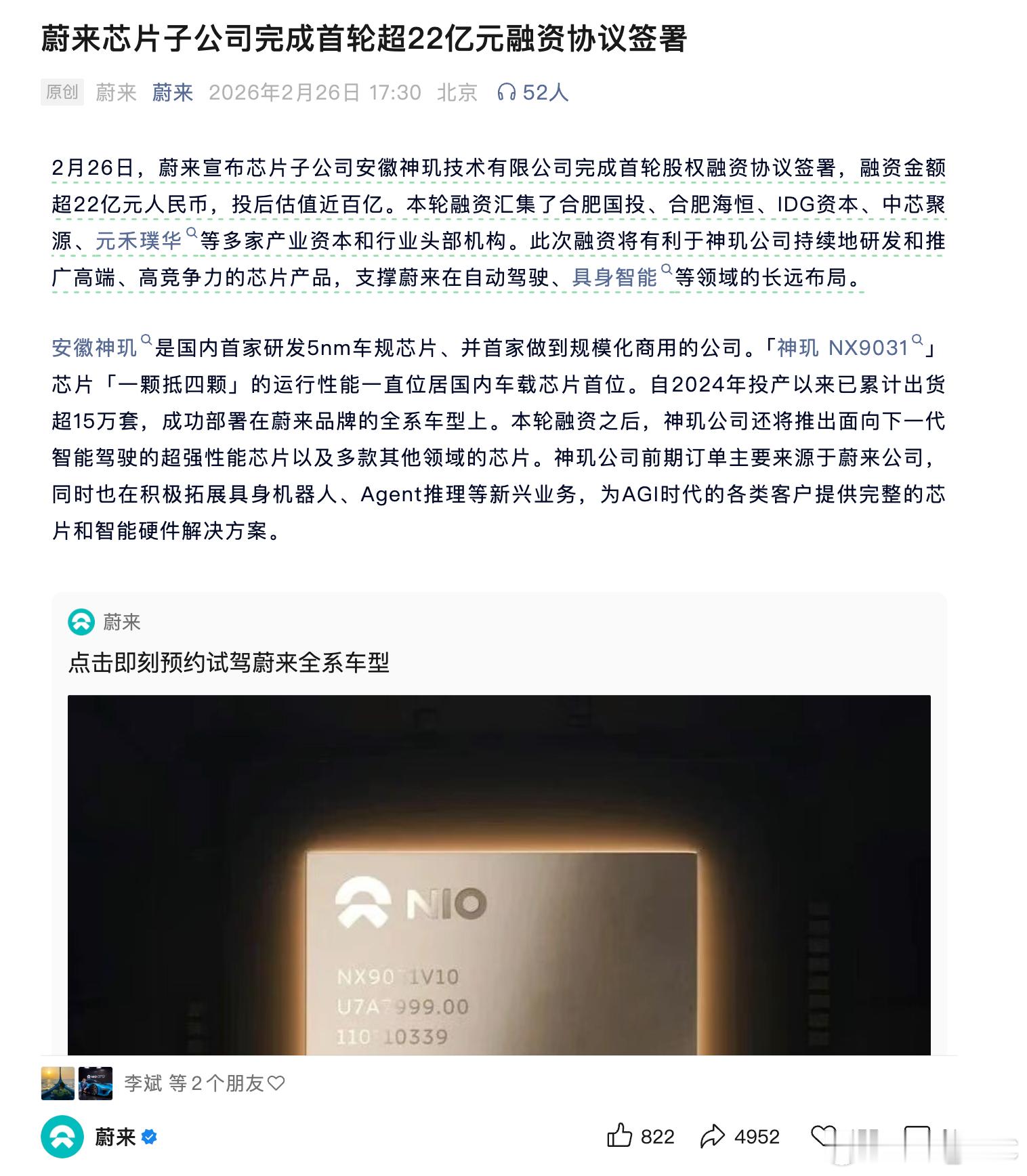 2 月 26 日,蔚来旗下芯片公司完成首轮融资,金额超 22 亿元,投后估值接近百亿。