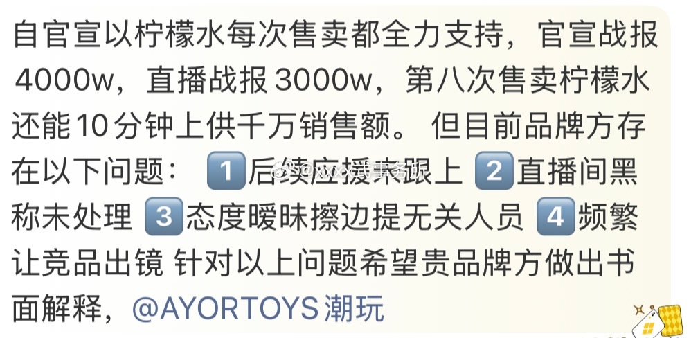 AYORTOYS自官宣以来 首日官宣战报4000w,直播战报3000w,第八次售卖柠檬水还能10分钟上供千万销售额,我记得这个品牌刚成立不久,靠田栩宁代言仅次于泡泡玛特,柠檬水这些维权要求不过分吧兔闪闪直播间