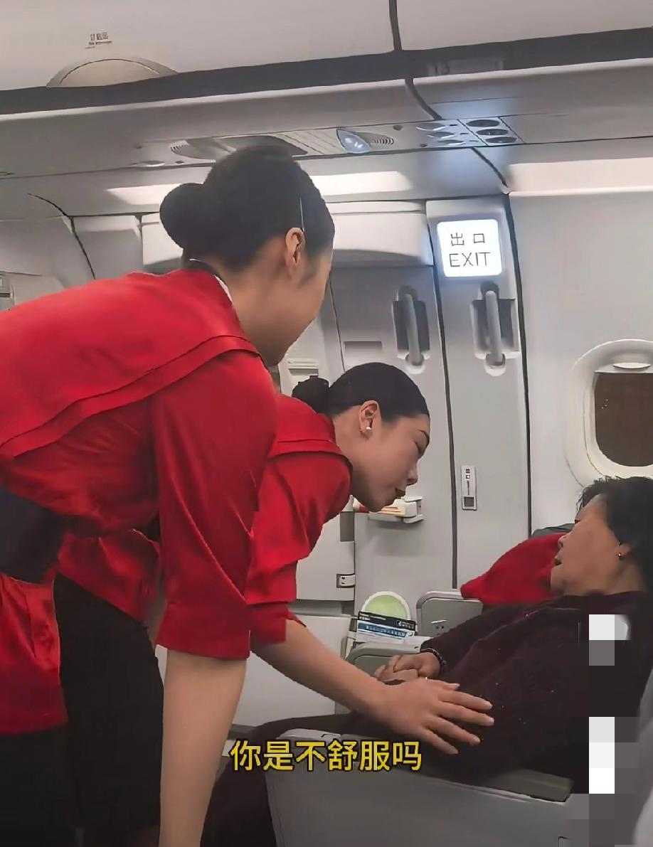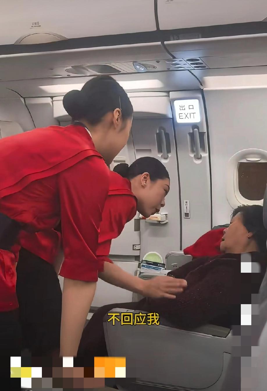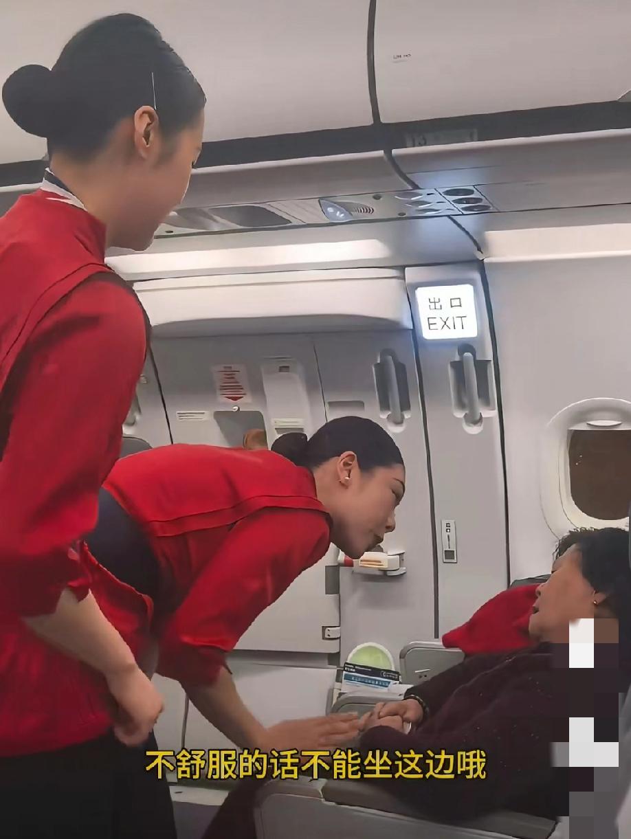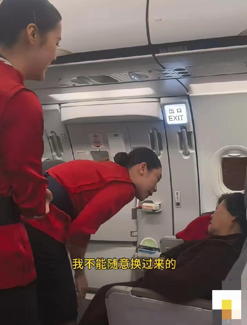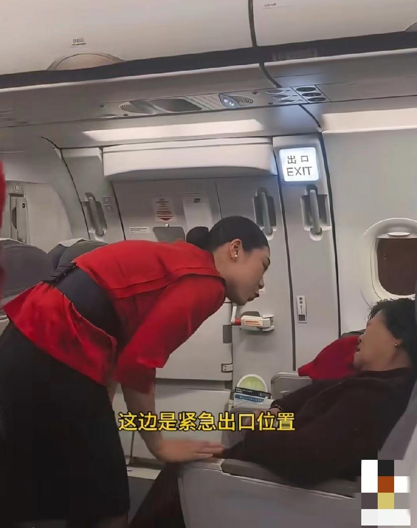 飞机上,这位大妈坐在紧急出口的位置上假寐,乘务人员生怕她不舒服,尝试着叫醒她,叫