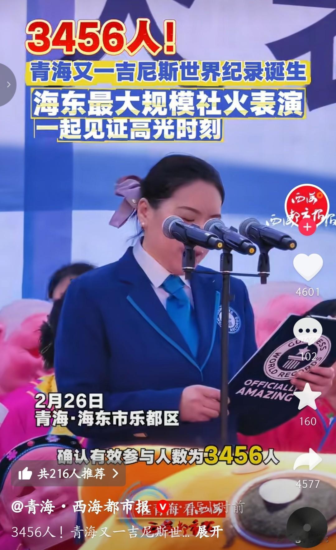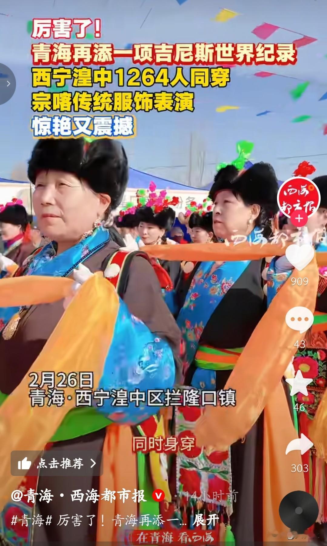 没想到啊,我们大美青海一天居然有2项吉尼斯世界纪录,真的太让人骄傲了! 第一项是在海东乐都,由3456人共同完成的最大规模社火表演,成功打破吉尼斯纪录。现场锣鼓喧天、人山人海,舞龙、舞狮、秧歌、旱船、高台、螭鼓舞等各种传统社火节目齐上阵,队伍排得长长的,场面特别壮观,把咱们青海最浓的年味儿、最热闹的民俗全都展现出来了。 第二项是在西宁湟中,1264人身着精美传统服饰,完成了最大规模宗喀传统民族服饰表演,也拿下了吉尼斯世界纪录。这些服饰色彩艳丽、纹样讲究,一针一线都是手工制作,带着浓浓的青海地方特色和民族文化,穿上身后整齐又大气,一眼就能看出咱们青海独特的文化魅力。 社火,是青海人过年必不可少的传统活动,代表着喜庆、热闹、祈福安康,是刻在骨子里的民俗,一代一代传了这么多年,这次能站上世界舞台,让更多人看到青海社火的气势。 宗喀传统服饰,是咱们青海当地特有的民族服饰,样式古朴大方、工艺精美,承载着地方历史和文化底蕴,不只是好看的衣服,更是老祖宗留下来的文化宝贝。 一天两项吉尼斯世界纪录,不只是一个称号,更是咱们大美青海文化实力的证明。作为青海人,真的由衷自豪!