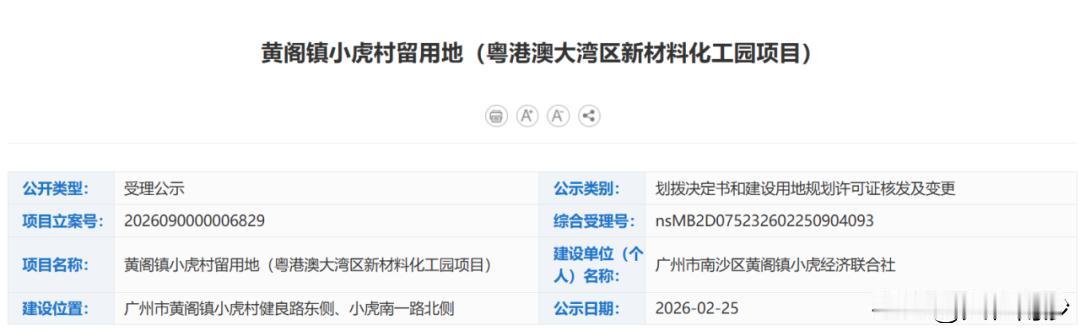 【小虎岛化工继续加码】黄阁镇小虎村留用地(粤港澳大湾区新材料化工园项目)划拨决定书和建设用地规划许可证核发及变更受理公示。 根据介绍项目位于黄阁镇小虎村健良路东侧、小虎南一路北侧,是南沙区首例企业与村集体以40年合作模式开发建设村留用地的项目,也是黄阁镇推动化工产业集群化发展的关键抓手。 据悉,项目总投资27亿元,建有甲类车间、甲类仓库、丙类中试车间与危固废一站式处理系统,是大湾区首创专业化工园区内合法中试车间,将打造全省首个集研发、中(小)试转化、批量生产于一体的全链条化工新材料产业基地。 计划推动50家以上企业完成科研成果转化,助力13家以上生产企业实现量产,未来年产值预计40亿以上,为南沙产值税收增长作贡献。 值得一提的是,项目于去年7月15日开工,并于12月30日封顶,预计在今年上半年建成投产。