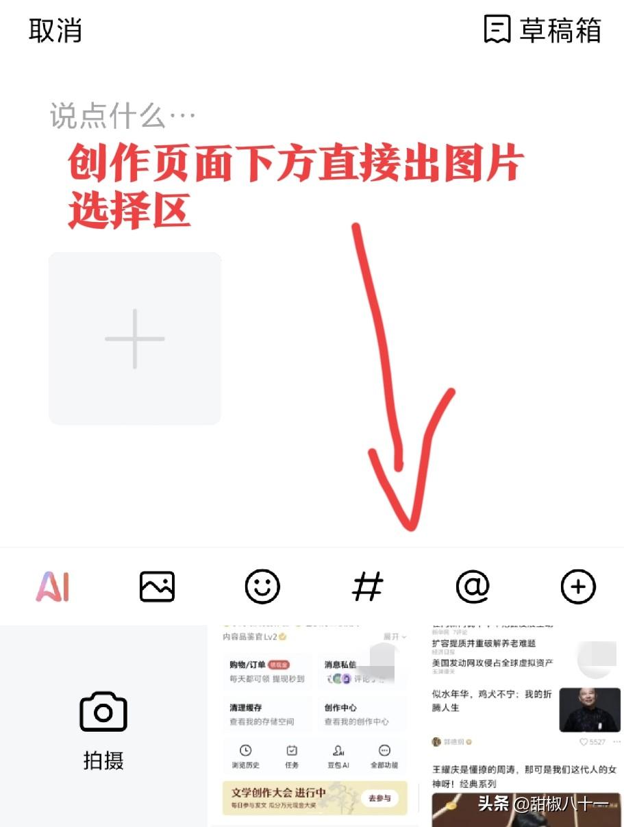 头条改版了, 大家都更新到最新版本了么, 还记得原来点开,创作窗口就在首页的右上角,后来又改到了首页下方小加号。 而现在最新的版本,在首页找了半天也没找到创作入口,摸索一下,才在“我的”里界面左上方找到“发布”。 而且,原来进入创作页面,是没有图片直接展现出来的,如今的是创作页面上半部分写作,下面直接是相册图片。 感觉创作页面改的还是很方便的,也方便大家可以直接先选好图片,再开始内容创作。 节省了最后配图点那个图片大“+”的繁琐,节省时间还是挺不错的,希望头条能越来越好。