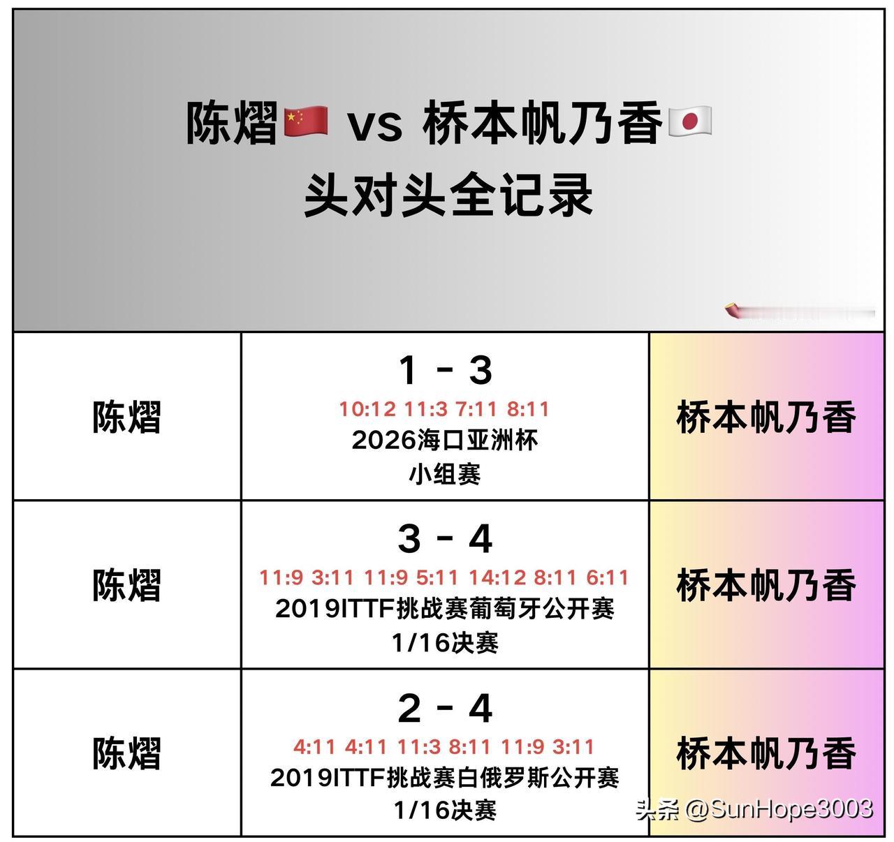 陈熠零封桥本帆乃香,成功复仇。事实证明不是不会打,找对方法最重要。 新加坡大满贯,陈熠战胜桥本帆乃香,成功晋级。 虽然说单打晚了一天进行,但是也是压倒性的胜利, 昨天,也已经提前给桥本帆乃香安排了淘汰后的见面会,似乎预见了她今天的表现。 桥本帆乃香中间位被压制,反手频繁失误。 我们国乒已经有多位会打削球的队员了,可喜可贺。 亚洲杯陈熠输给桥本,定会回来好好研究,和训练,我们也有武杨这样的削球手可以练习, 事实证明,只要多练,多研究,就一定是有效的。