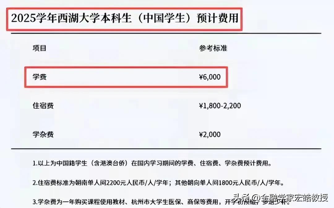 这两天被西湖大学关于中外籍学生58倍学费差刷屏!这才是中国高校该有的骨气! 这两天西湖大学学费标准引爆热议:中国籍本科生年缴6000元,国际学生高达35万元,差距高达58倍! 反观美国,公立大学州内学生学费约1.5万美元,国际生却要3.5万-6.3万美元,相差2-4倍;私立名校国际生学费更是高达50万+人民币。 以哈佛大学为例,2025年本科学费不分国籍,均为6.7万美元(约48万人民币),但美国本土学生能享受巨额助学金,实际支付远低于国际生。 西湖大学并非国内唯一对外籍学生收高价学费的大学,但它的定价更符合国际惯例,用外籍生学费反哺本土教育,让普通家庭也能享受到顶尖教育资源。 此前不少高校搞“国际化”,用公共资源补贴外籍生,尤其是非洲学生,他们的住宿标准都大超国内学生。西湖大学打破怪象,不搞超国民待遇,凭实力挣外国人的钱、养自己的娃。这种守护本土教育公平的底气,值得所有高校看齐!