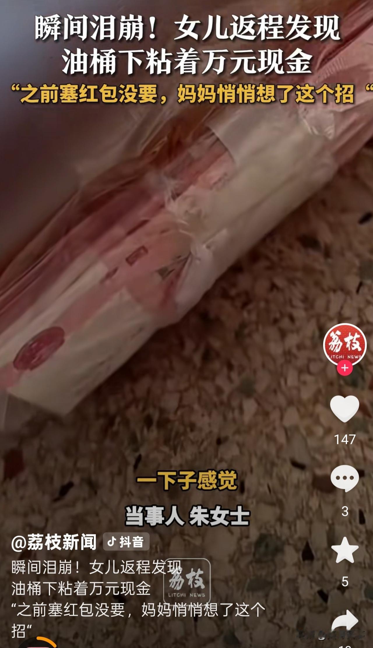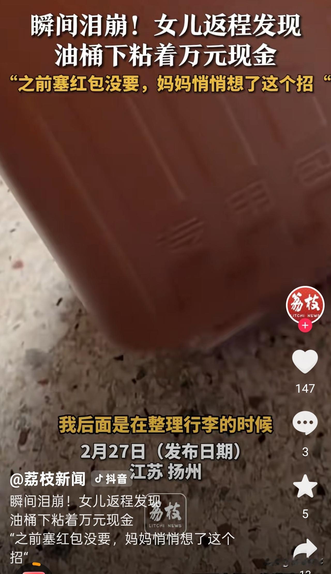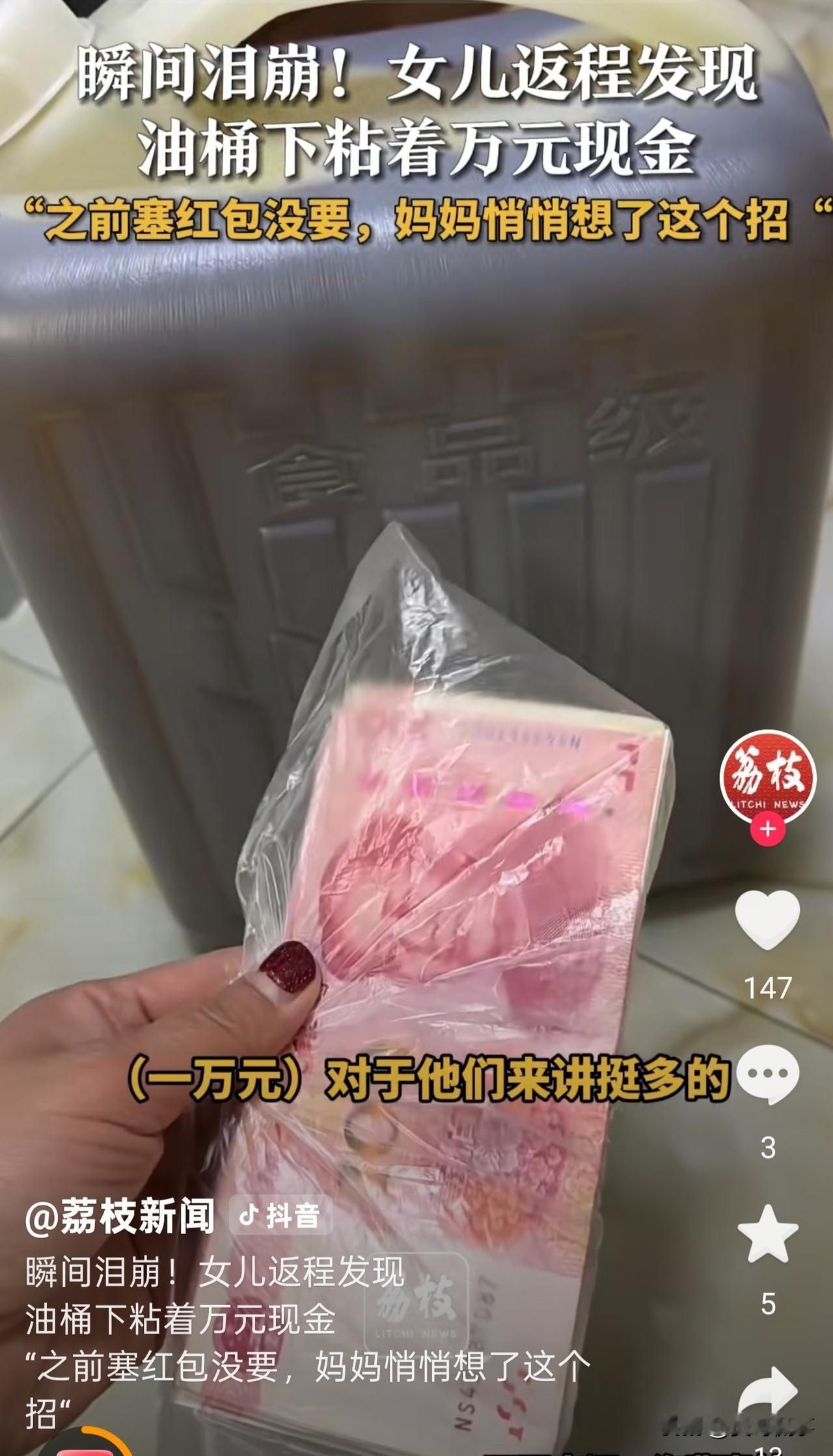 看哭了!江苏扬州,一女子过年返程时,妈妈多次想给孩子塞红包,但都被女子拒绝了。然而,妈妈并未就此放弃,趁女子不注意,悄悄将辛苦积攒的10000元现金用胶带缠在菜籽油壶底,亲自放到车上,还叮嘱女子别乱动。当发现真相的那一刻,女子瞬间泪崩。 朱女士常年在外打工,一年到头回不了几趟家。 这次过年回来,妈妈最高兴的,就是能见到女儿和外孙。 老人是地地道道的农村人,一辈子靠种地、干点零活过日子,收入不高,平时省吃俭用,对自己格外抠门,可对晚辈,从来都大方得很。 临走前几天,妈妈好几次把红包塞给外孙,都被朱女士拦了回去。 她知道妈妈赚钱不容易,不想让老人再拿钱给她们。 虽然当时妈妈嘴上没再说什么,可眼神里的失落,朱女士全都看在眼里。 返程那天,妈妈早早起来,把提前准备好的鸡鸭鱼肉、蔬菜放入后备箱,后备箱被塞得满满当当。 临上车,妈妈还特意拎来一壶菜籽油,稳并反复叮嘱:“这个你别动,放好,路上别洒了。” 朱女士当时只当是妈妈细心,怕油漏出来弄脏车子。 临行前,朱女士再次检查了一遍行李,发现油壶有点晃。 于是,她一抬手把油壶拎起来,她忽然觉得不对劲:壶底明显多了东西。 朱女士仔细一看,发现是用塑料袋包裹着、外面缠了一圈又一圈胶带的厚厚一沓现金。 不多不少,整整10000元。 原来,妈妈几次塞红包被拒,知道女儿心疼自己,不肯要。 她思来想去,想到了这个最笨、也最稳妥的办法: 把钱藏在油壶底下,用胶带缠死,再亲自拎上车,叮嘱女儿别动。 朱女士当场就哭了,一句话都说不出来。 她太清楚了,这一万块,对一个普通农村妈妈来说意味着什么。 可能是妈妈大半年的省吃俭用,也可能她是起早贪黑一点点攒下的积蓄。 自己舍不得吃、舍不得穿,却对子女出奇的大方。 这份爱不张扬、不华丽,却沉得让人心头发酸。 视频发到网上,很多人看哭了。网友们纷纷想起自己的父母: “我妈也这样,藏米里、藏馒头里、藏箱子底,就怕你不要。” “嘴上说不要乱花钱,转身却把所有能给的都给你。” 是啊,大家感动的,从来不只是这一万块钱,而是这种中国式父母最真实的模样: 不善表达,不懂浪漫,不会说漂亮话,只会用最笨拙、最实在的方式,把能给的全都给孩子。 你不要,那我就换个方式给;你心疼我,我比你更心疼你。 这件事看着小,却戳中了很多人心里最软的地方。 我们总以为,拒绝父母的钱、不让他们破费,就是孝顺。 可在父母眼里,能给你多一点、再多一点,他们才心安。 你越懂事,他们就越想补偿;你越独立,他们就越怕帮不上你。 他们不怕自己苦,就怕你在外受委屈; 不怕自己省,就怕你过得不够好。 很多时候,我们和父母之间,就是这样: 你拼命想让他们顾着自己,他们却拼了命想把一切都留给你。 总之,一句话,父母在,不管你多大、走多远,你永远是那个被人拼尽全力疼爱的孩子。 那么,看完这个故事,你是否也想起了自己的父母?他们是否也用过类似“笨拙”的方式,偷偷爱过你呢?