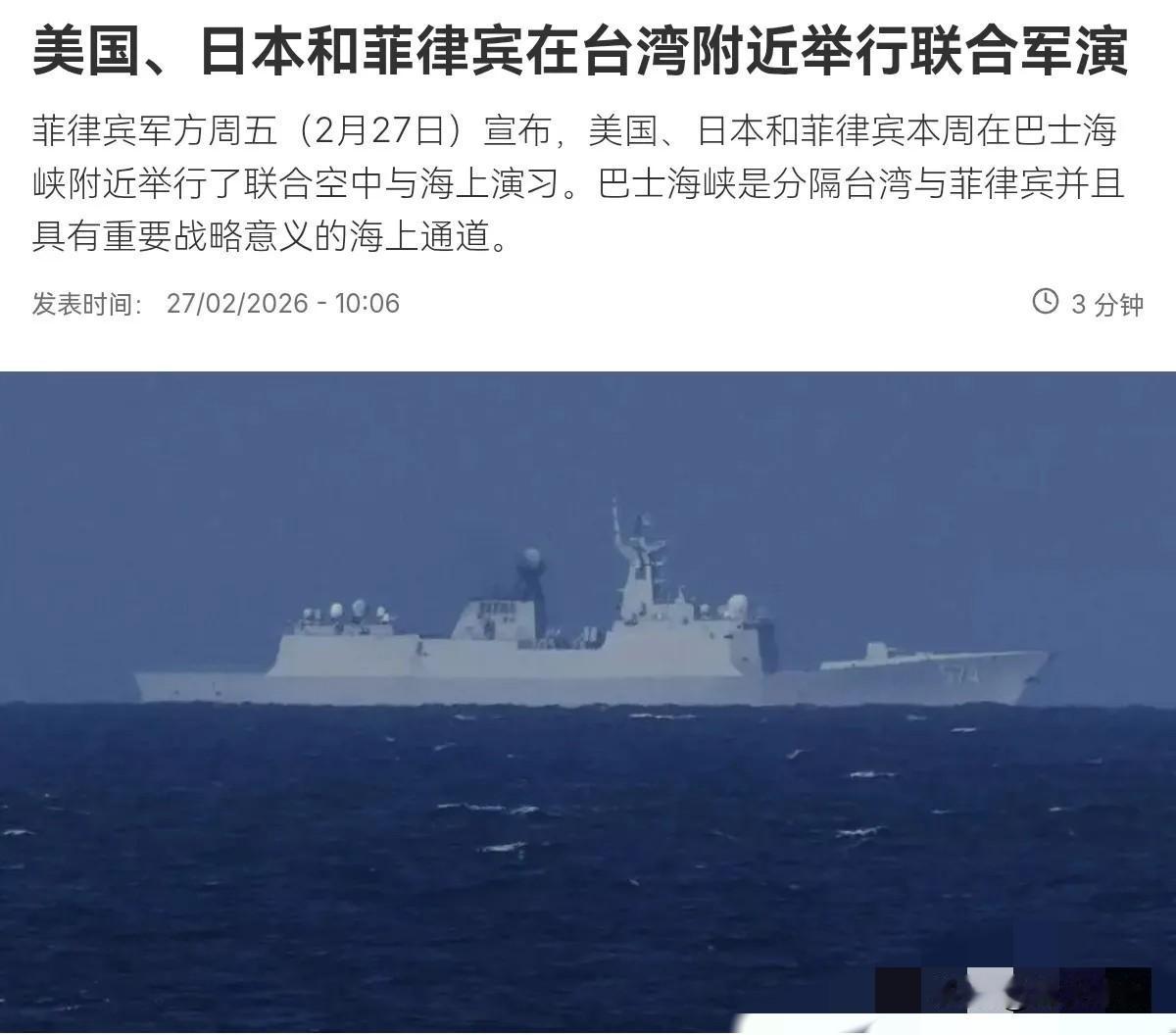 2月27日,根据法新社报道,菲律宾军方宣布,美国,日本和菲律宾本周在巴士海峡附近举行了联合空中与海上演习。此次演习在巴丹群岛一带进行,而巴丹群岛是菲律宾群岛最北端的岛屿,与台湾之间仅隔着一条巴士海峡 评几句: 当前,亚太地区和平稳定、合作发展,是地区各国的共同愿望。在敏感区域频繁开展军事演训,容易加剧地区局势复杂程度,不利于增进国家间互信与对话,也不符合地区和平发展的主流趋势。 维护地区安全,需要的是沟通协商而非军事对抗,是开放合作而非封闭排他。一味强化军事部署、增加联合演训,只会增添不稳定因素,难以真正解决安全课题。 中方始终坚持共同、综合、合作、可持续的安全观,坚定维护亚太地区和平稳定。我们希望有关各方保持理性克制,多做有利于缓和局势、增进互信的事,共同维护海域的和平与安宁。