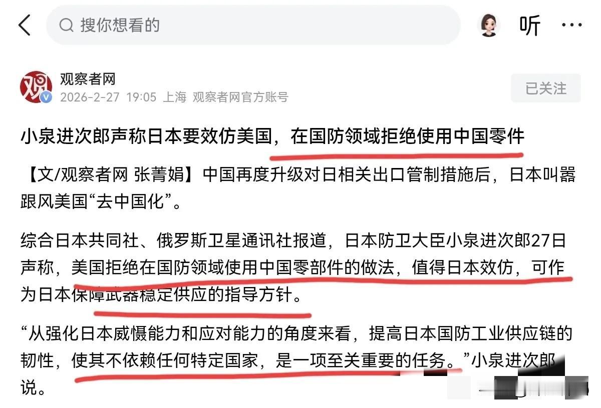 2月27日,在我们再度升级对日相关出口管制措施后,日本防卫大臣小泉进次郎表示,从强化日本威慑能力和应对能力的角度来看,提高日本国防工业供应链的韧性,使其不依赖任何特定国家,是一项至关重要的任务。 评几句: 长期以来,日本在关键材料、核心产业链上高度依赖外部稳定供给,相关领域的脆弱性十分突出。中方依法实施出口管制,本是维护国家安全的正当举措,却迅速引发日方高度紧张,足见其产业短板之明显。 日方强调“去依赖”,看似要强化自主能力,实则是被动应对。全球产业链历经长期形成,绝非短期就能重构,一味追求脱钩断链,只会抬高成本、削弱竞争力,最终损害自身利益。 合作共赢才是长久之道。日方与其急于寻求所谓“供应链独立”,不如正视互利共存的现实,尊重中方合理安全关切。靠对抗思维解决不了依赖问题,更换不来真正的安全与威慑。