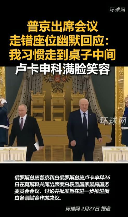 谁懂啊!普京开会走错座,一句“我习惯走到桌子中间”笑翻全场,卢卡申科全程憋笑,这波幽默直接把严肃外交变成名场面! 当天,俄白联盟国家最高国务委员会会议如期举行,普京和白俄罗斯总统卢卡申科双双到场。 谁也没想到,刚走进会场准备落座,普京就径直走向了长桌正中间,压根没留意那不是他的专属座位。 察觉到不对劲后,普京丝毫没有尴尬,反而笑着随口接了一句:“我习惯走到桌子中间。” 就是这句简单的回应,让身旁的卢卡申科瞬间笑开了花,现场原本紧绷的氛围,一下子就变得松弛起来。 可能有人觉得这就是个小乌龙,但在这短短一个瞬间,远比长篇外交辞令更有分量。 首先,这足见俄白两国的关系有多铁,普京的“习惯性”,看似是口误,实则是俄罗斯在俄白联盟中核心地位的自然体现。 而卢卡申科毫不掩饰的笑容,更是盟友间无需设防、心照不宣的默契,没有客套,只有实打实的亲近。 其次,也能看出普京的处事风格,在万众瞩目的外交场合,换做别人可能会手足无措,而他却能用一句玩笑轻松化解,这份从容和接地气,也让他的形象更显立体。 可玩笑归玩笑,这场会议的正事一点没落下,当天两国不仅敲定了深化各领域合作的决议,还正式签署了7份重要文件。 其中就包括《关于落实“建立俄白联盟国家条约”细则的主要方针》,合作范围涵盖了政治、经济、军事安全等关键领域。 当下国际局势复杂多变,俄白两国选择紧紧抱团,这7份文件就是最好的证明,他们不是只喊口号,而是实实在在地推进一体化,携手应对外部挑战。 普京的这个小插曲,就像一剂“调味剂”,让严肃的国际合作多了几分人情味,也正是这份藏在细节里的信任与默契,成了俄白联盟最稳固的基石。