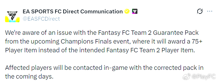 EA SPORTS今天早些时候发布公告:周赛奖励中的Fantasy FC第二队保证包存在问题,会奖励75+的球员物品,而不是Fantasy FC第二队的球员。EA SPORTS已经修复了此问题,受到影响的玩家后续将会收到补偿奖励。