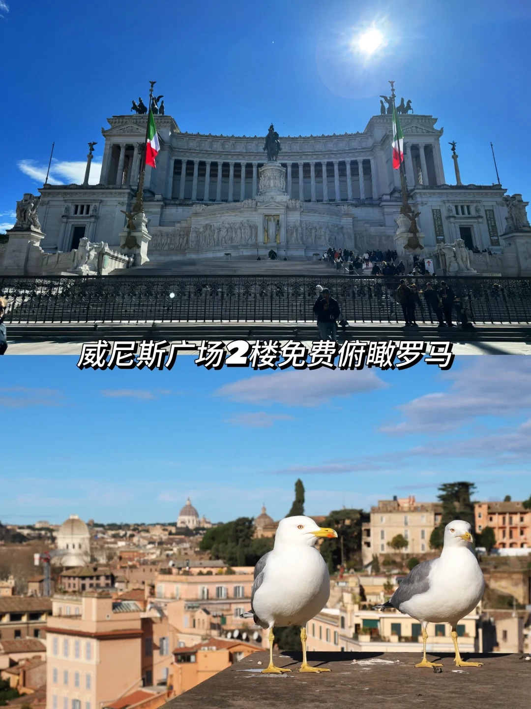 纪念意大利第一任国王埃马努埃利二世,广场上有其雕像。二楼免费俯瞰罗马城。