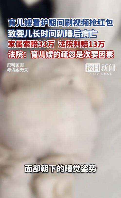 浙江金华,一名育儿嫂照顾刚出生的婴儿,某晚让婴儿趴着睡觉,她背对着玩手机。约20-30分钟后,她发现婴儿已面朝下、嘴唇发紫,送医后婴儿不治。家属将她告上法院索赔33万余元,女子辩称家属证据无法证明婴儿死亡与她有因果关系。法院判了! 2024年6月,金华蒋家迎来了男婴蒋某。因夫妻二人工作繁忙,雇了细心的育儿嫂张某照料。初时,张某认真负责,让蒋家人放下心来。然而,随着时间推移,张某渐渐放松警惕,开始在工作时间沉迷于手机,忽视婴儿的安全。 2024年8月14日,蒋某因生病虚弱,张某将他趴在床上,只在意一时的姿势而不做进一步检查。她全然不顾孩子的安危,沉迷于玩手机,长达20到30分钟未回头查看。最终,张某惊慌失措地发现婴儿已经面朝下,面色发紫,呼吸近乎停止。 尽管急匆匆送往医院,但蒋某不幸去世,蒋家人悲痛欲绝,控诉张某不负责任。张某却毫无悔意,甚至狡辩责任,激怒了蒋家人。最终,检察机关展开调查,真相渐露。 会商结果显示,事发时婴儿蒋某本身患有疾病,身体较为虚弱,但张某的不当看护行为,是导致孩子死亡的重要推手——她让孩子长时间处于趴卧状态,这种姿势会造成孩子胸腹部呼吸肌运动受限、口鼻部呼吸道部分阻塞,加剧呼吸功能障碍,不排除在一定程度上,直接促进了孩子呼吸衰竭的进程。 简单来说,就算孩子本身有病,只要张某尽到看护责任,及时调整孩子的睡姿,时刻关注孩子的状态,这场悲剧,根本就不会发生。 法院审理后认为,本案的核心争议焦点,就是张某的看护行为,与婴儿蒋某的死亡结果之间,是否存在因果关系。 法院明确表示,公民的生命权受法律严格保护,行为人因过错侵害他人民事权益,应当承担侵权责任。张某作为专业育婴员,接受雇主委托,负责照料刚出生的婴儿,就负有高度的注意义务和安全保障职责。 可张某在看护期间,明知婴儿生病、身体虚弱,却仍将其置于趴卧姿势睡眠,还背身长时间玩手机,未及时观察婴儿状态,明显违反了基本的看护义务,存在严重疏忽,其行为已构成侵权。 结合公检机关的会商意见,张某的疏忽行为,确实与蒋某的死亡结果之间存在一定的因果关系,理应承担相应的赔偿责任。 但同时,法院也认定,婴儿蒋某的死亡,主要系其自身疾病所致,张某的疏忽行为,仅为次要因素。综合考虑原因力大小、张某的过错程度及公平原则,法院酌情判定,张某承担10%的轻微责任。 据悉,事发后,张某迫于压力,已经向蒋某家属支付了3万元补偿款。 最终,一审法院作出判决:驳回蒋家人33万余元的全额索赔请求,判令张某在已支付3万元补偿款的基础上,再赔偿蒋某家属各项损失13万余元,合计赔偿16万余元。 判决一出,网友们议论纷纷,有人觉得“判得太轻”,毕竟一条生命没了,13万根本弥补不了家属的伤痛;也有人觉得“公平合理”,毕竟孩子自身有病,张某只是次要责任,但她的失职,终究要付出代价。 这里必须敲黑板,给所有育儿嫂、所有雇主,上一堂刻骨铭心的法律和责任课,每一条都有明确依据,不容辩驳。 第一,育儿嫂的责任,从来都不是“看孩子”那么简单。根据《民法典》规定,家政服务合同中,受托人(育儿嫂)应当按照约定,妥善处理委托事务,尽到合理的注意义务。尤其是照料刚出生的婴儿,更是需要全程监护,丝毫不能松懈,张某的行为,早已违反了这份约定,也违背了基本的职业操守。 第二,专业育儿嫂,必须知晓新生儿的看护禁忌。新生儿(尤其是出生不足3个月的婴儿),颈椎和呼吸肌尚未发育成熟,绝对不能独自趴睡,这是行业基本常识,张某作为专业育婴员,不可能不知道,她的疏忽,本质上就是不负责任,甚至是漠视生命。 第三,因果关系的认定,不是靠狡辩就能推翻的。张某辩称“无因果关系”,但公检机关的会商意见、法院的审理,都明确了她的不当看护,加剧了孩子的病情,推动了死亡进程,这种因果关系,不需要她认可,法律自有判定。 第四,雇主雇育儿嫂,一定要擦亮眼睛。很多家庭图方便、图便宜,找育儿嫂时不核实资质、不查看背景,最终酿成悲剧。记住,育儿嫂的资质、责任心,比什么都重要,必要时,一定要安装监控,全程监督看护过程。 这场悲剧,最无辜的,还是那个刚出生没几天的婴儿。他还没来得及看清这个世界,还没来得及感受父母的疼爱,就因为一个育儿嫂的粗心和不负责任,匆匆离开了人世,留给父母的,是一辈子无法磨灭的伤痛。 而张某,虽然只承担了10%的责任,赔偿了13万余元,但她这辈子,都要背负着“害死婴儿”的枷锁,受到良心的谴责和世人的唾弃。她的行为,不仅毁了一个家庭,也砸了自己的饭碗,更给整个育儿行业,敲响了警钟。 也提醒所有新手父母:孩子的安全,永远是第一位的。雇育儿嫂一定要谨慎再谨慎,不要轻易完全放手,全程监督、及时沟通,才能最大程度避免悲剧发生。