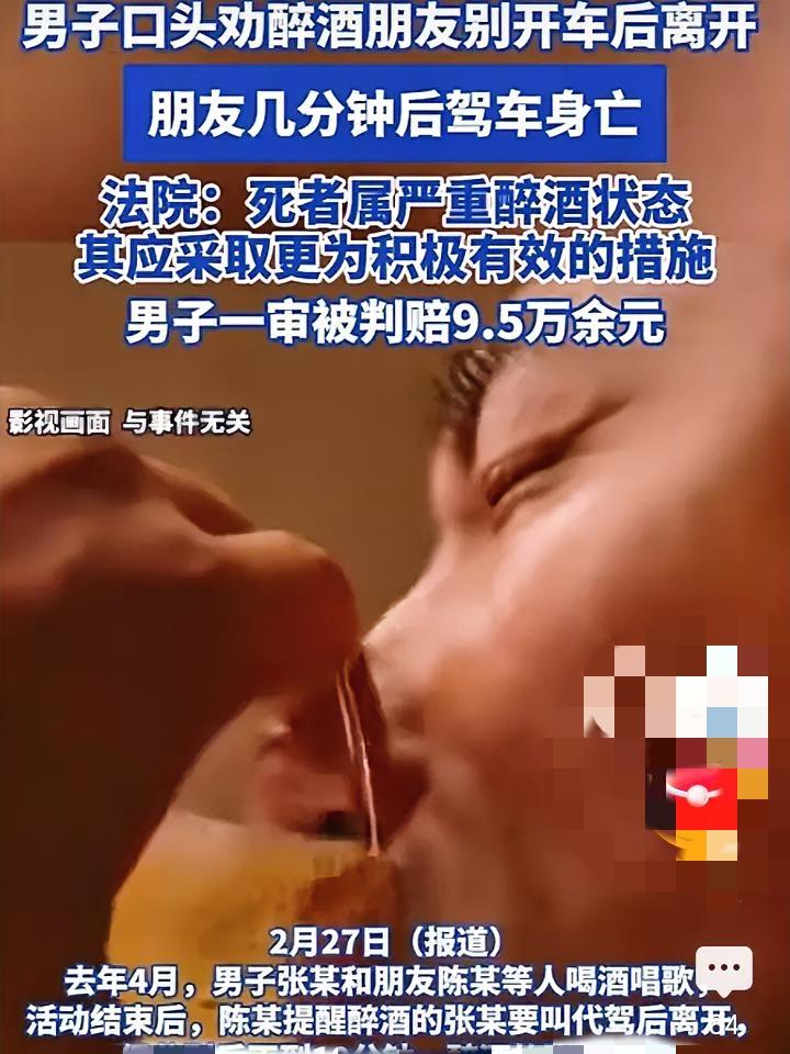 劝朋友别醉驾就够了?男子离开后,好友车祸身亡被判赔9.5万…… 谁能想到,一句“别酒驾”的提醒,竟没能逃过法律的追责?去年4月,一场普通的朋友聚会,最终酿成了无法挽回的悲剧,也让一位善意提醒的男子,背上了近十万的赔偿。 事发当晚,男子陈某与好友张某等人相约喝酒唱歌,直至次日凌晨才结束。散场后,陈某让代驾将两人送到自己的工作室附近,途中得知张某打算自行驾车去寻找浴室休息,而张某的车恰好就停在工作室周边。 陈某见状,当即劝说张某不要开车,建议他要么睡在自己车里,要么留在工作室休息,张某当时也口头答应了。随后两人分开,陈某不放心,还特意在3分钟后拨通张某电话,再次提醒其不要驾车,通话时长18秒。 可陈某万万没想到,挂断电话后不久,悲剧就发生了。监控显示,张某在3时3分许驾车驶离,仅仅9分钟后,他驾驶的车辆就以约102km/h的速度(该路段限速80km/h),撞上路边警示桩及道路指示牌T型杆,随后车辆自燃,张某当场身亡。 经检测,张某血液酒精含量高达177mg/100ml,属于严重醉酒状态。事后,张某的家属将陈某告上法庭,认为他未尽到照顾义务。 陈某辩称,自己已多次口头提醒,甚至给出安置建议,对张某擅自驾车离开并不知情。但法院审理后认为,陈某的注意义务不应仅限于口头提醒,明知张某严重醉酒且有驾车意图,应采取帮忙叫代驾、联系其亲属等更积极的措施,阻止其驾车。 最终,一审法院判决陈某赔偿张某家属各项损失共计95898.5元。此事传开后,不少人替陈某喊冤,觉得他已经尽到了提醒义务,不该承担责任。 喝酒本是情谊往来,可一旦疏忽大意,就可能酿成无法挽回的悲剧。屏幕前的你,觉得陈某真的冤吗?如果是你,会采取哪些措施阻止醉酒好友驾车? 男子劝朋友别醉驾仍被判赔9万 共同饮酒那些隐形责任