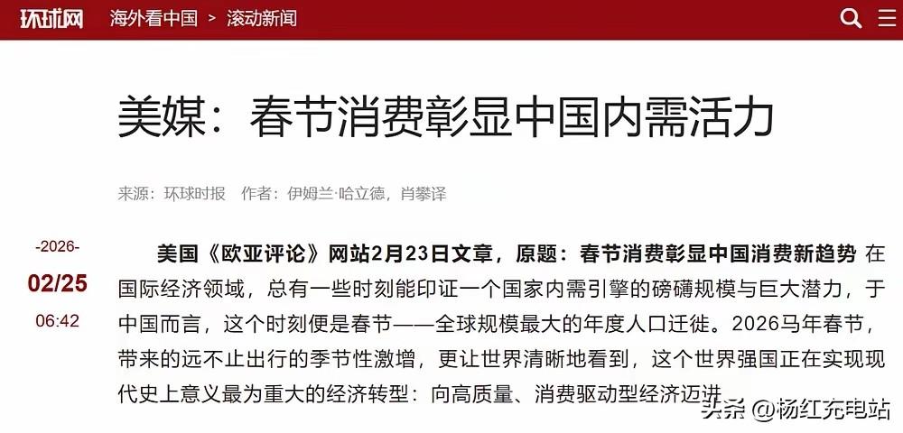炸锅全球!中国春节刚落幕,外媒集体刷屏:这才是真正的经济王者! 中国春节假期刚收官,全球舆论直接炸锅!马来西亚、美国等多国媒体紧盯不放,密集解读中国春节消费盛况,直言这不仅是节日狂欢,更是中国经济强势复苏、内需引擎全面爆发的最强信号! 数据说话最有底气:全国重点零售和餐饮企业销售额同比大涨10.6%,餐饮堂食爆满,饭店包席成新风尚,直接拉动消费狂飙。美媒《欧亚评论》惊叹,近28亿人次的超级迁徙,见证全球最大规模人口流动,世界清晰看到中国正经历里程碑式经济转型。 消费升级趋势彻底颠覆传统:从买新衣、换家电的实物消费,转向旅游、文化、体验式消费,哈尔滨、西安、阿勒泰等目的地火爆出圈,国人更看重情感与文化价值。同时,高品质消费与理性购物并行,智利车厘子、进口海鲜走俏餐桌,大牌服饰销量翻倍,奥莱、性价比平台人头攒动,展现成熟消费观。 作为春节申遗成功后的第二个新年,中国商圈、景区、餐馆全线爆满,一片祥和繁荣。对比全球多地动荡不安,这份稳定与活力格外珍贵。 外媒纷纷感慨,中国春节不再只是传统节日,更成为拉动全球经济的强力引擎。从消费结构升级到市场活力迸发,中国用实打实的数据证明,强大内需是经济韧性的核心支撑。 这波春节消费热潮,让世界读懂中国经济的澎湃动力,也为全球复苏注入最强信心! 2026中国春节 中国消费爆火 中国经济活力 外媒1中国 作品声明:仅在头条发布,观点不代表平台立场。
