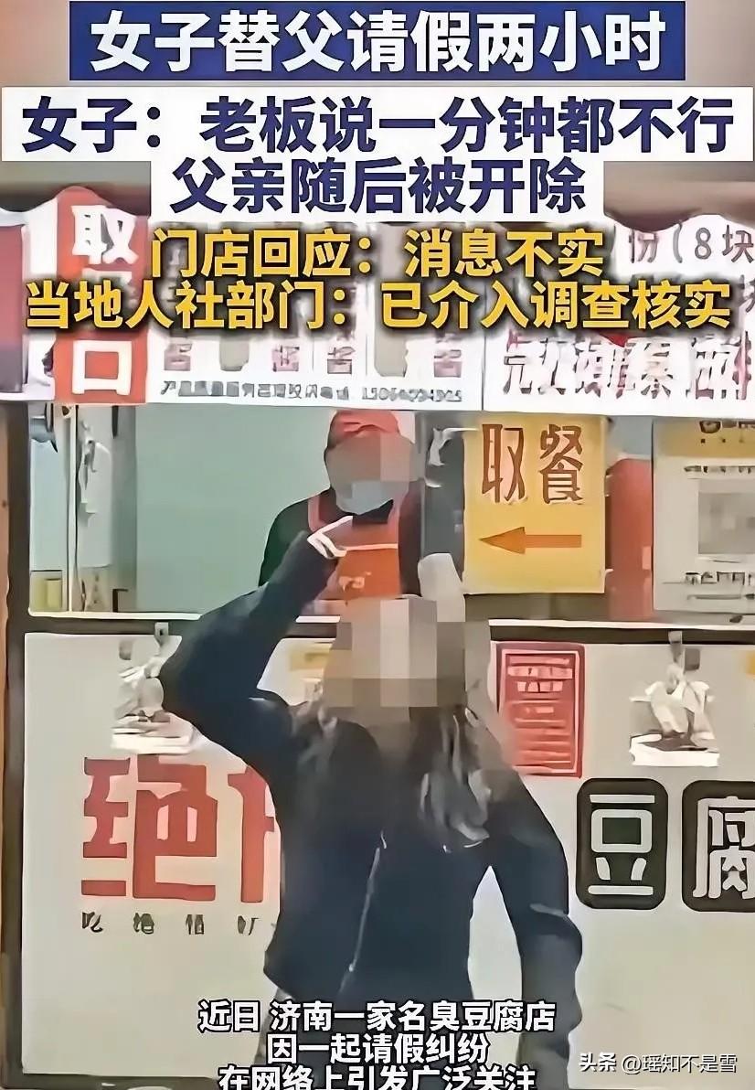 这下事情闹大了!山东济南,女子假期后准备回外地上班,临走前就想着和父亲吃顿饭,于是替父亲和打工的店铺请了两个小时的假,结果店家却说1分钟都不行,还直接把她的父亲辞退,女子直接硬刚到底,来到店前讨要说法。 女子的父亲今年54岁,在济南宽厚里的这家臭豆腐店做炸锅师傅,已经踏实干了近一年。 春节期间门店客流暴增,老人只在正月初一休息了一天,剩下的日子天天守在炸锅前,经常忙到凌晨才收工,从没提过加班补偿,也没主动请过一次假。 女子在杭州工作,一年到头只有春节能返乡,初六就要返程,整个假期只跟父亲正经吃过一顿饭,她心里满是亏欠,特意算准深夜11点后客流回落的低峰期,主动致电老板请假,还明确表态愿意承担这两小时的薪资,只盼能陪父亲吃顿简单的离别饭。 老板没有半分通融,电话里强硬回绝一分钟假都不准,没等女子再多沟通,就直接放话要辞退老人。 次日老人到店,当场被口头告知不用再来,没有任何书面通知,没有一分钱补偿,就连春节法定节假日的加班工资,也只按平日标准结算,三倍薪资分文未付。 老人一辈子靠手艺谋生,性格憨厚隐忍,被辞退后站在店门口局促不安,怕女儿惹是非,一直拽着她的胳膊劝息事宁人,觉得工作丢了再找就好,没必要跟店家争执。 女子看着父亲隐忍委屈的模样,心里又酸又愤。她最清楚父亲对这份工作的珍视,每天出门前都会把工服整理得一丝不苟,炸制食材时全程紧盯油温、翻拌火候,从不出差错,是店里公认的靠谱老员工。 这样一位勤恳付出的劳动者,仅因一次合情合理的短时请假,就被无理由辞退,既没有合法的规章制度作为依据,也没有履行提前告知的基本程序,完全是老板凭个人情绪肆意决断。 她不愿父亲的辛苦被轻贱,更看不惯底层打工人的权益被随意拿捏,当即站在店门前理性维权,不吵不闹,只据实陈述事实、厘清用工责任。 围观路人越聚越多,听完整件事的来龙去脉,几乎所有人都站在女子这边。子女离家前陪父母吃顿团圆饭,是最朴素的人情常理,老人全年无休的付出也有目共睹,店家的冷漠苛待,戳中了大众对小微餐饮用工不规范的普遍共情。 很多人都有过类似经历,在个体小店务工,不签劳动合同、加班无补偿、被随意辞退是常态,打工人因不懂法、怕麻烦选择隐忍,反倒让部分商家越发漠视劳动者的基本权利。 济南市历下区人社局已接到舆情线索,联合属地街道办介入调查,重点核实门店是否存在违法辞退、拖欠加班工资、未依法签订劳动合同等问题。 按照《劳动合同法》规定,用人单位辞退员工必须满足严重违纪、重大失职等法定情形,且相关规章制度需提前公示并告知员工。 这位父亲无任何违规行为,请假事由合理、时段友好、还自愿承担损失,远未达到可解除用工关系的程度,店家的辞退决定从根源上缺乏合法性。 个体工商户同属法律意义上的用人单位,必须恪守用工底线,不能因经营规模小就无视法规。 老人春节坚守岗位的法定加班工资,理应足额兑付,违法辞退的赔偿金也该依法支付,这不是人情层面的妥协,而是法律赋予劳动者的刚性保障。 女子的坚持从不是小题大做,她是在为父亲讨回公道,也在提醒所有务工者,面对不公不必隐忍,合法权益值得主动争取。 好的用工关系,从不是单向的压榨与服从,兼顾人情温度与规则底线,门店才能赢得口碑、长久经营。 冷漠苛待或许能省下一时人力成本,却会丢掉商业良知,更会触碰法律红线。 各位读者你们怎么看?欢迎在评论区讨论。